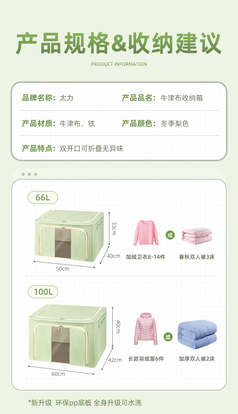 太力收纳箱衣服收纳箱棉被布艺整理箱布艺玩具储物箱百纳盒 【2件更优惠】升级PP板66L米灰色*2