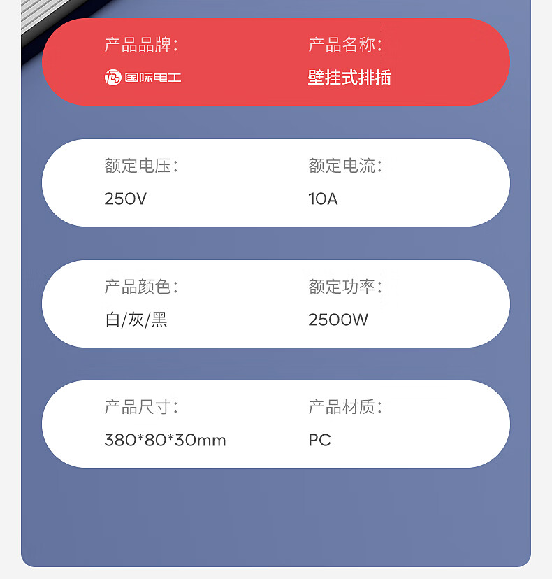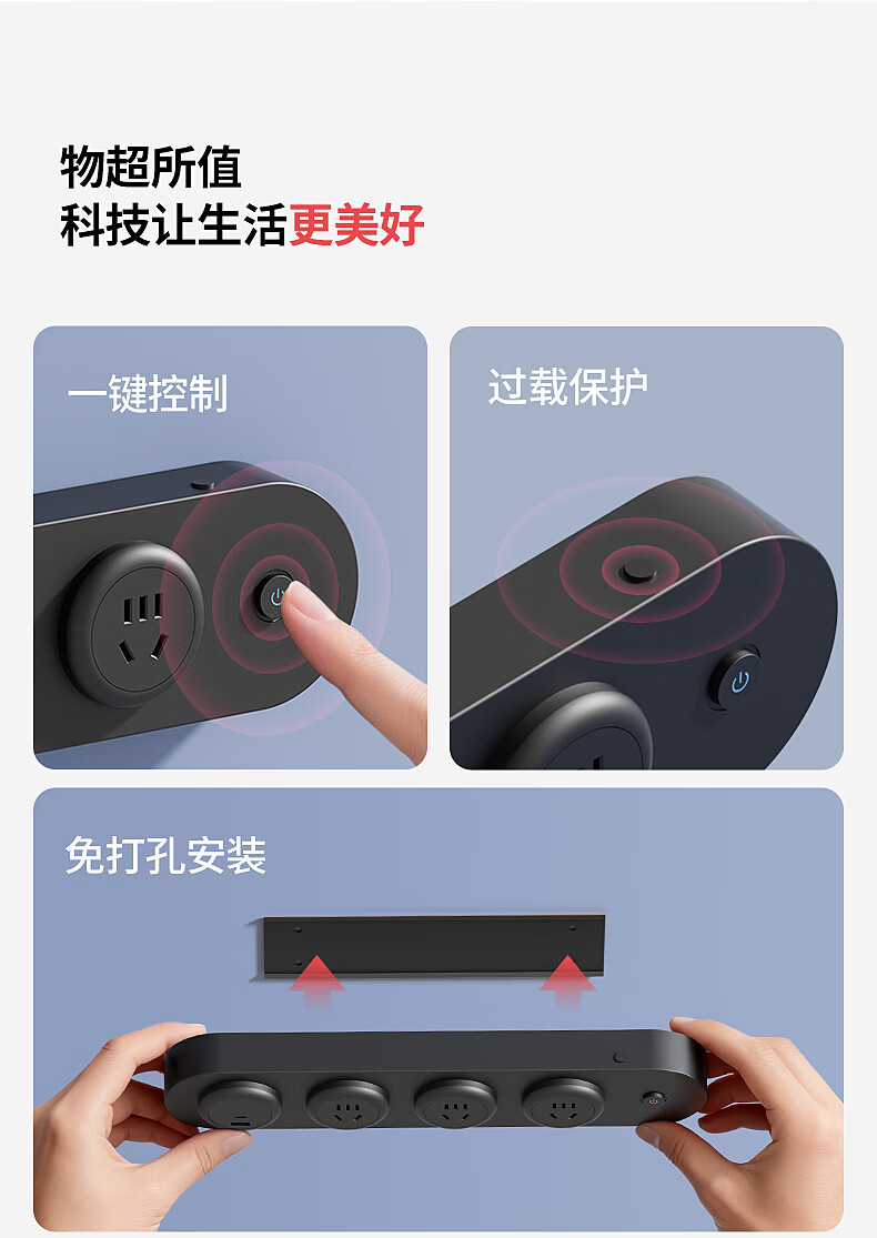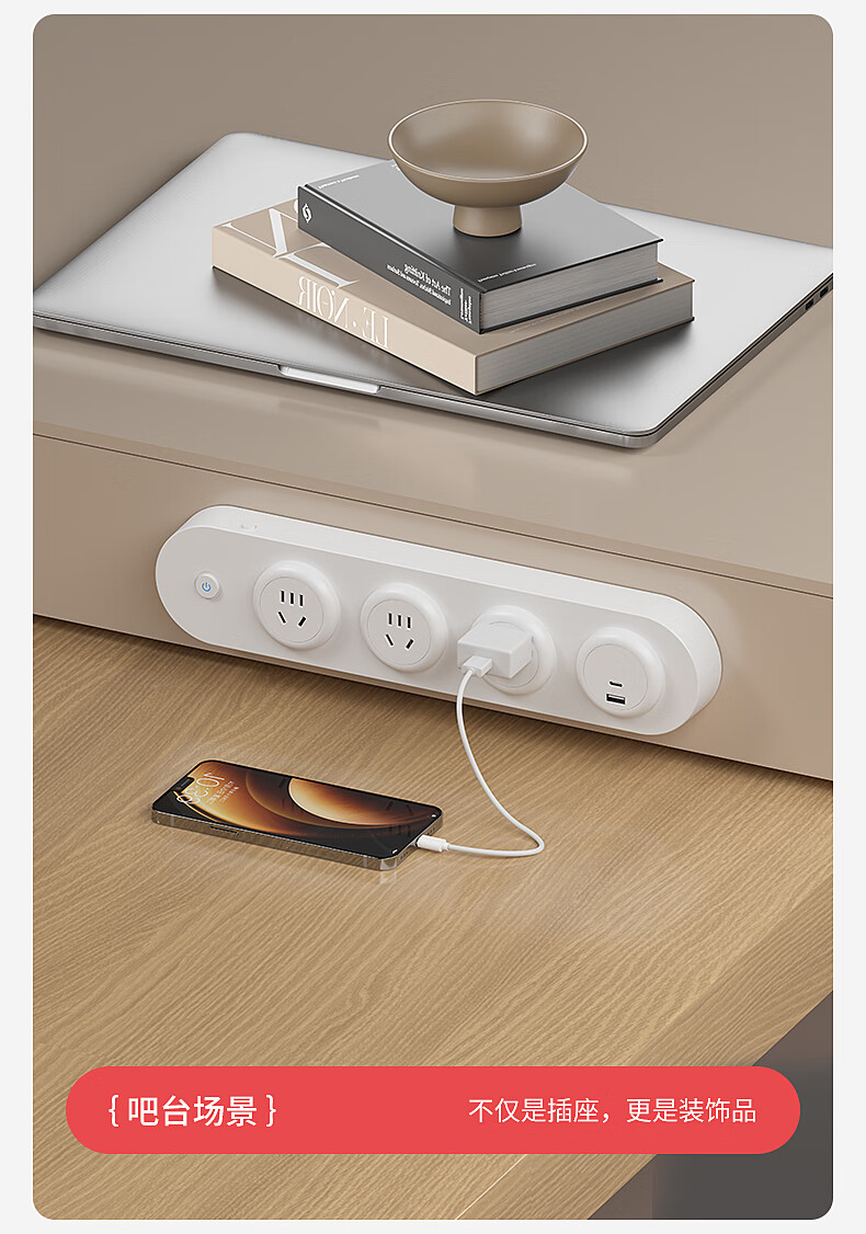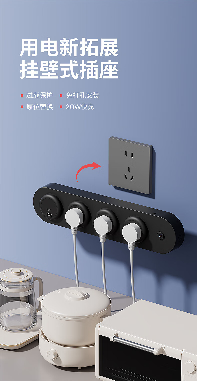 国际电工挂壁式扩展插座家用厨房餐边柜轨道插座USB带Type-C一转多孔插排 黑色扩展排插-【四位五孔】