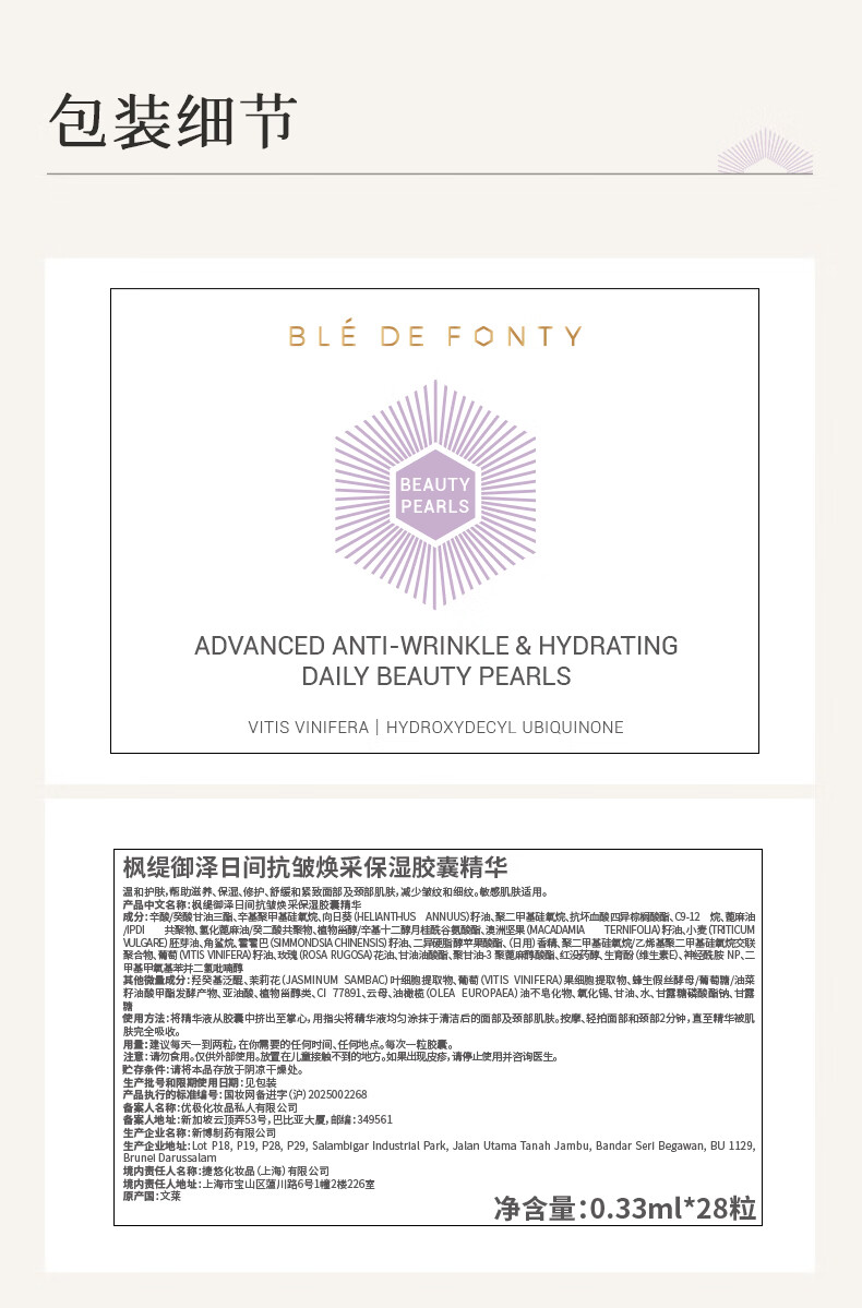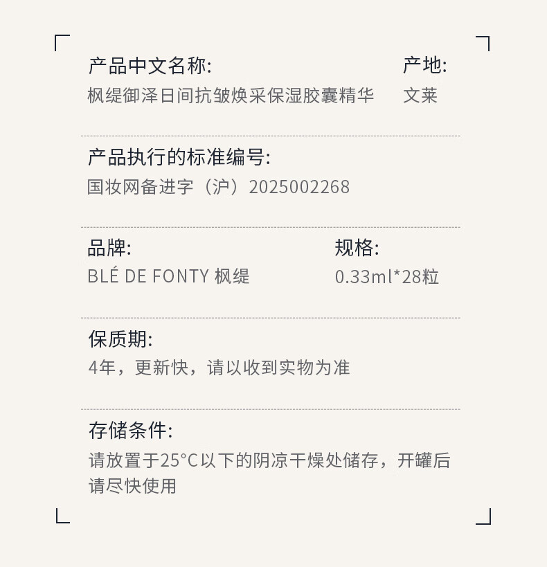 枫缇(Ble de Fonty)【3代升级】御泽日间抗皱焕采保湿胶囊精华葡萄籽超能精华油28粒 日间超能精华28粒