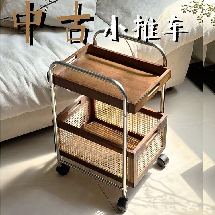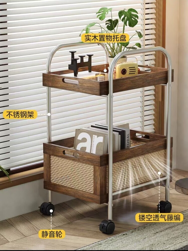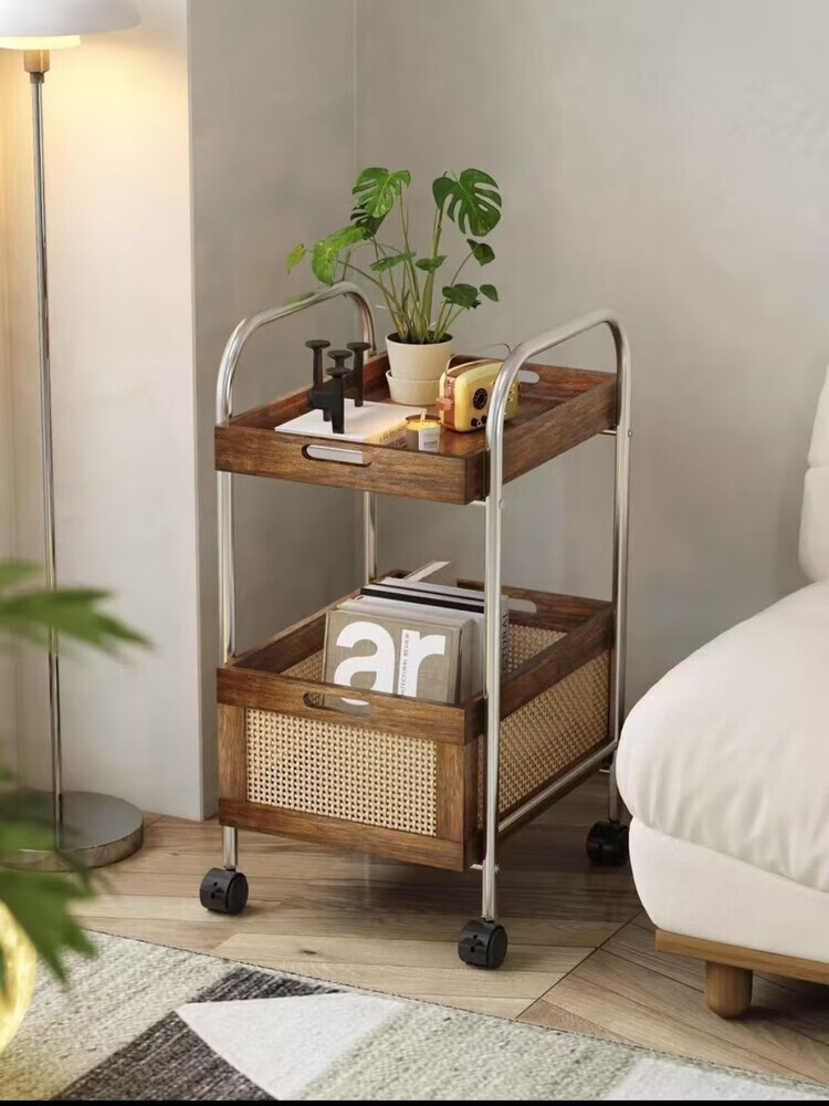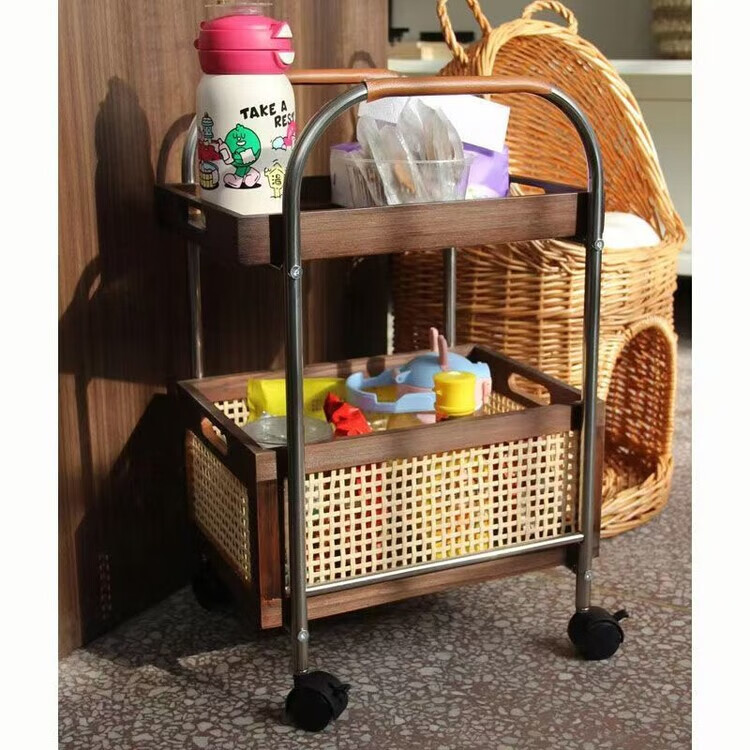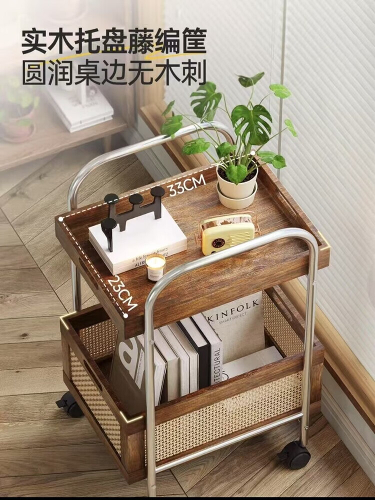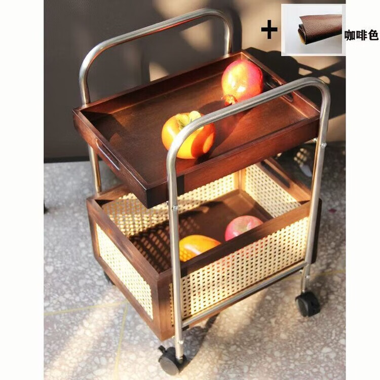 柏帝奇实木边几可移动置物架小推车家居装饰双层置物架零食脸盆架落地式 火烧色筐+棕色托盘 整套(架子+托盘+筐+皮)