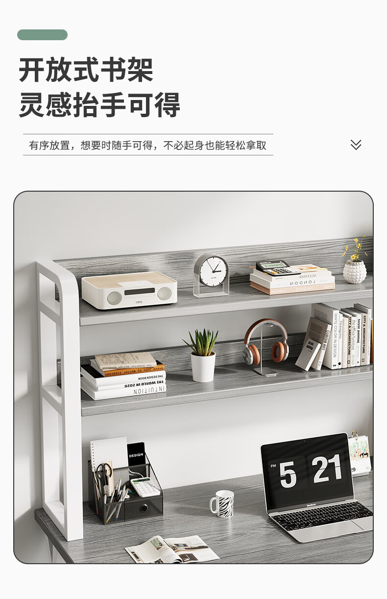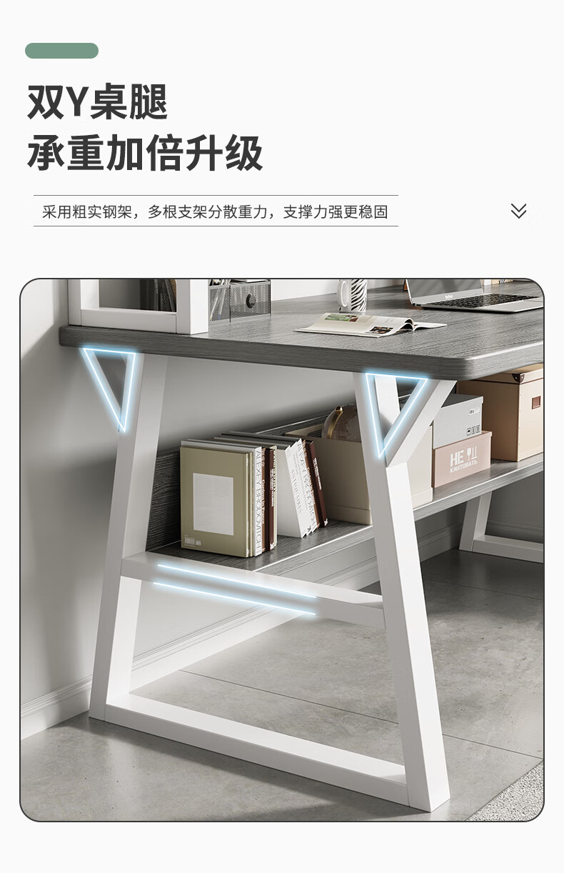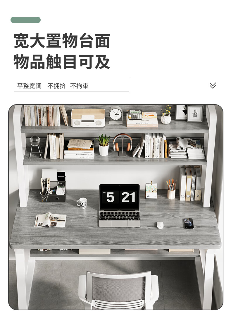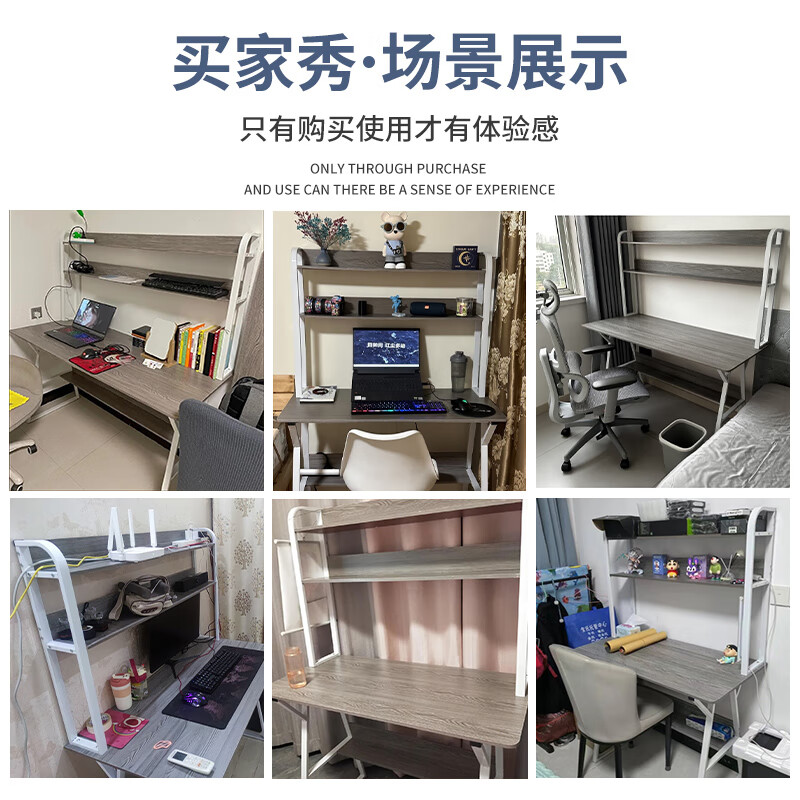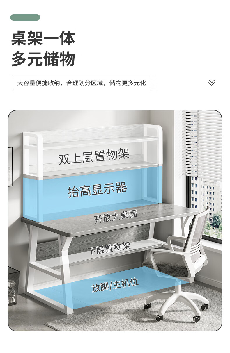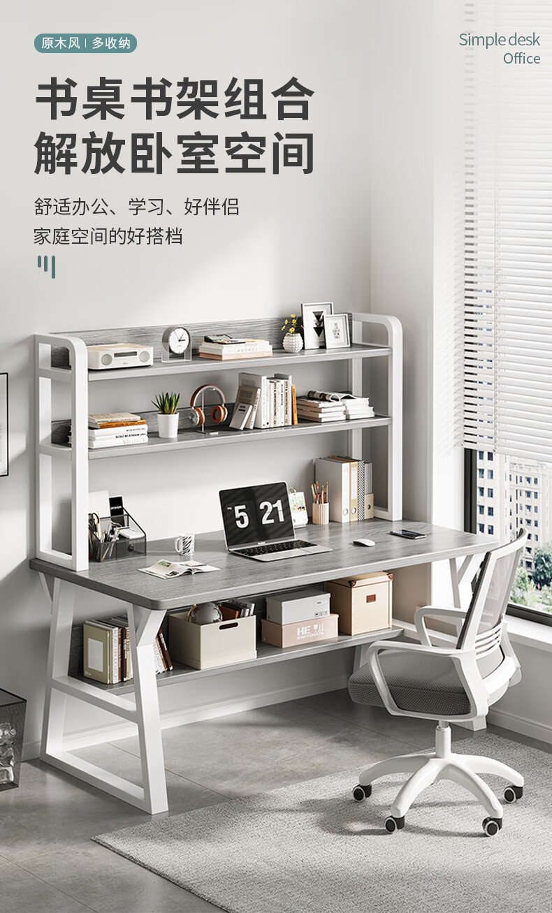 富禾实木电脑桌台式书架一体书桌简约家用桌椅组合学习桌卧室写字桌子 推-双层莫兰迪灰色-白架120*60cm 【单桌】加粗钢架