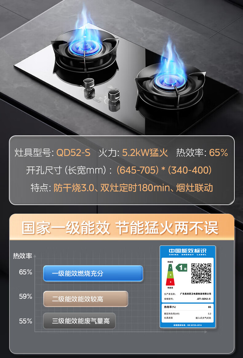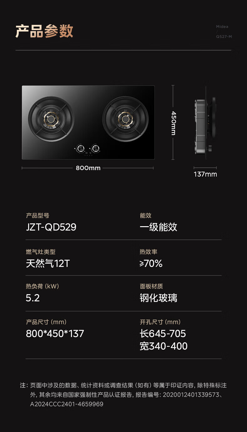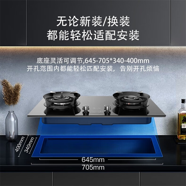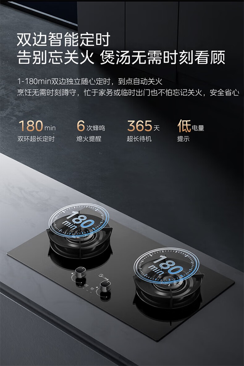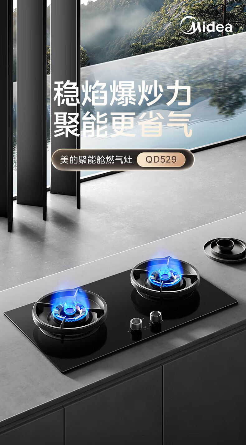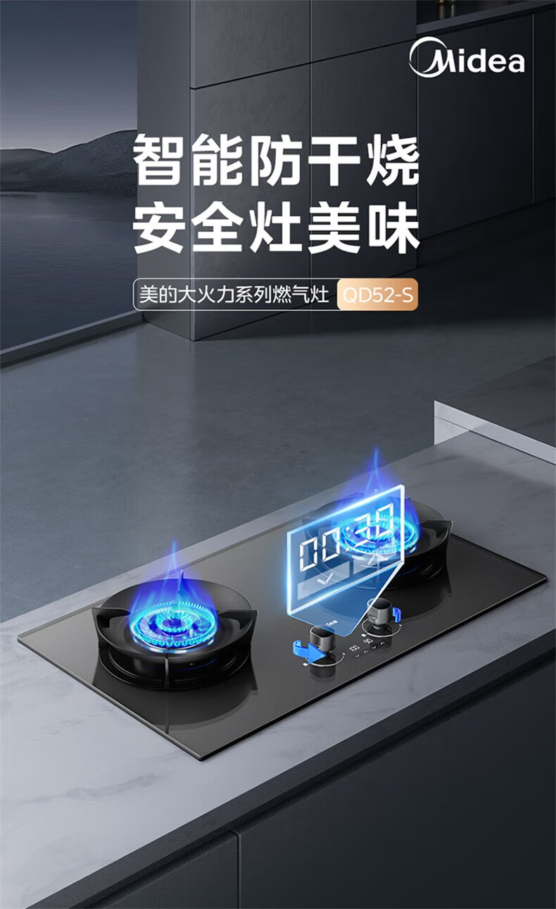 美的(Midea)【QD529 可搭配蒸汽洗系列】燃气灶 5.2kW猛火灶 双边定时 铜火盖 天然气 台嵌两用70%热效率 灶具 天然气12T 【QD529】双边定时5.2Kw大火力