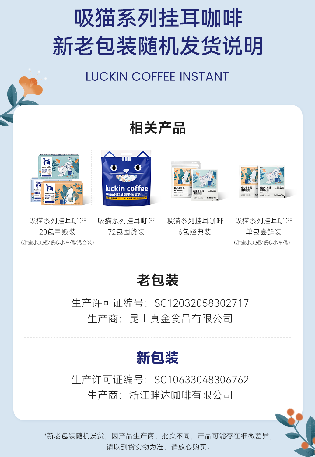 瑞幸咖啡即享吸猫系列挂耳咖啡精品手冲便携滤泡黑咖啡粉 挂耳咖啡10g囤货装【共72杯】