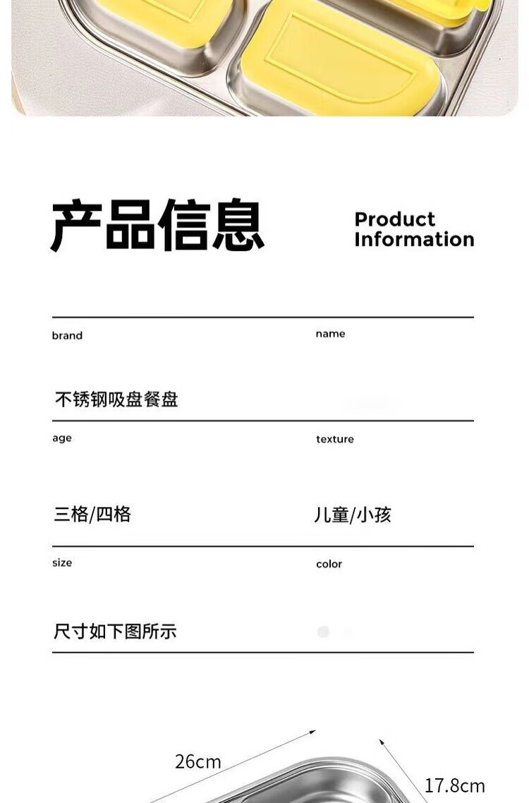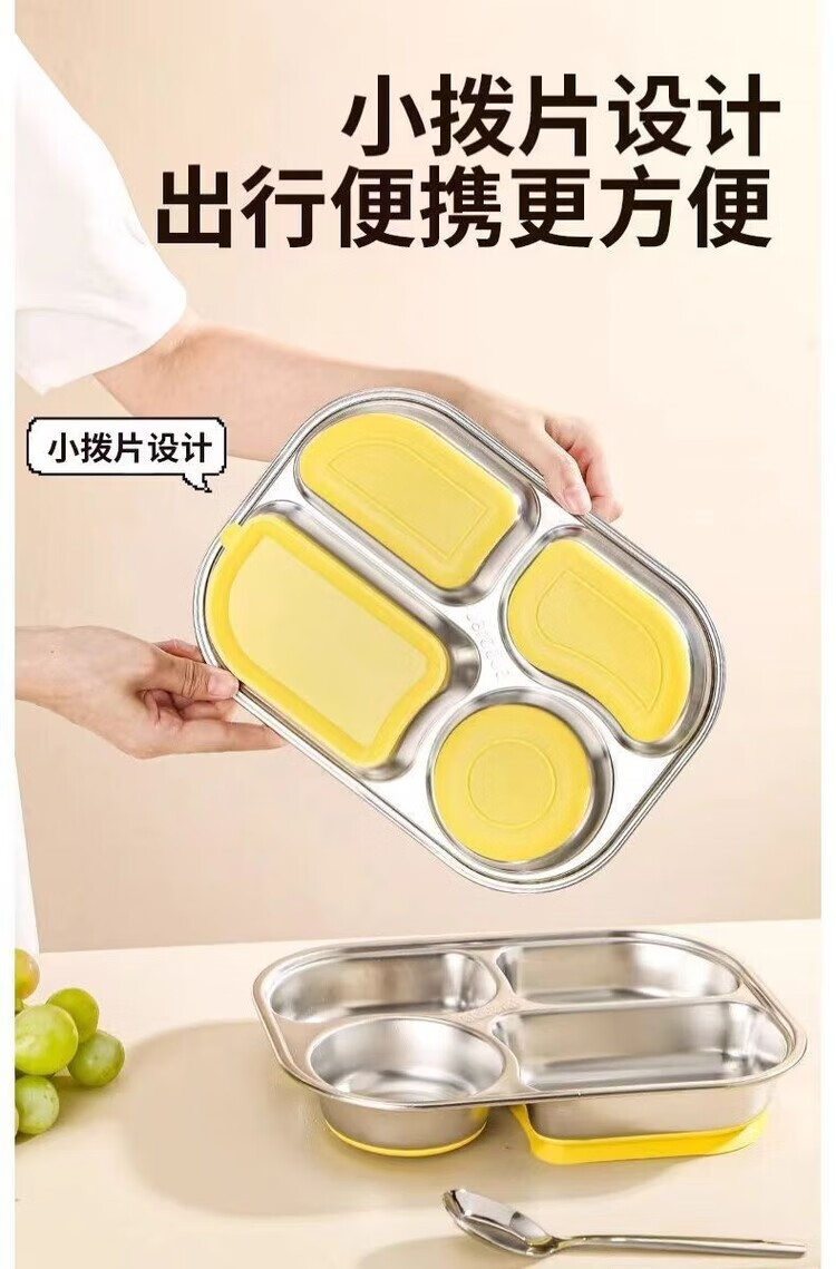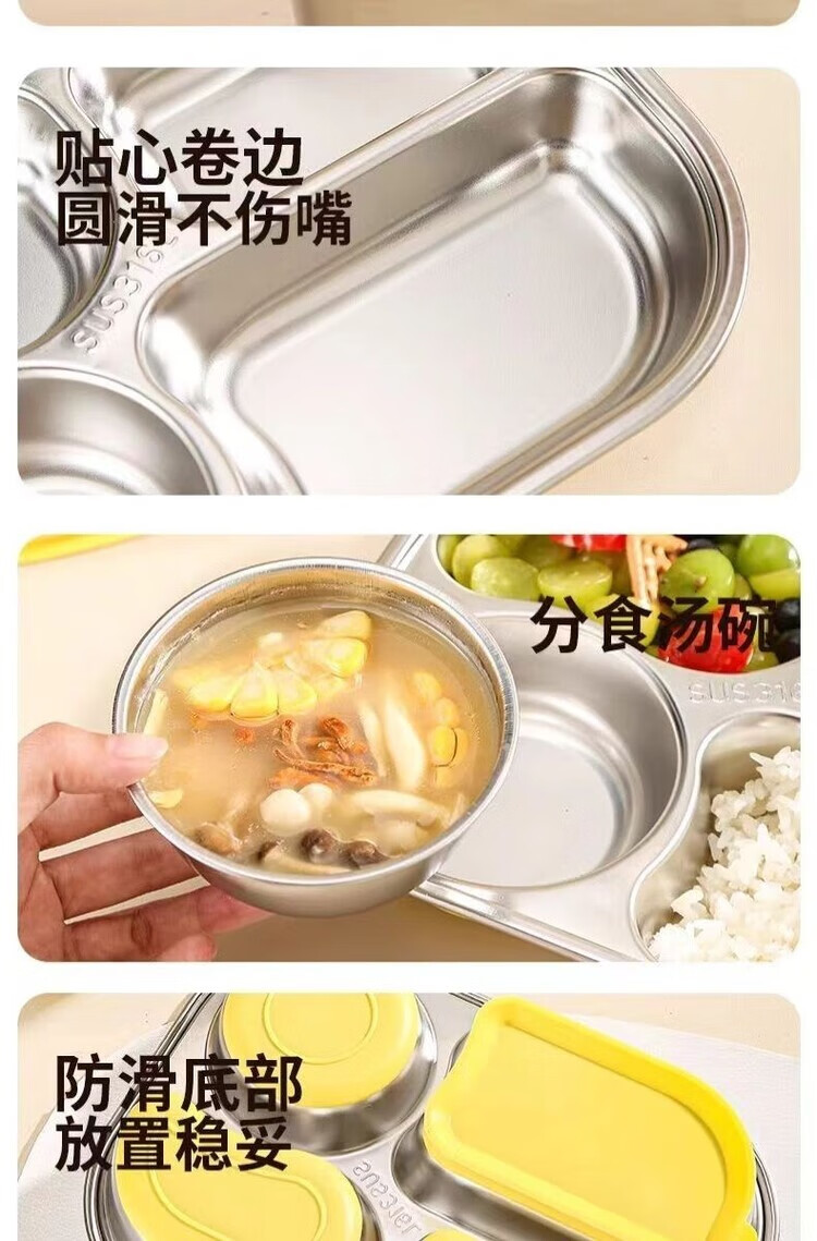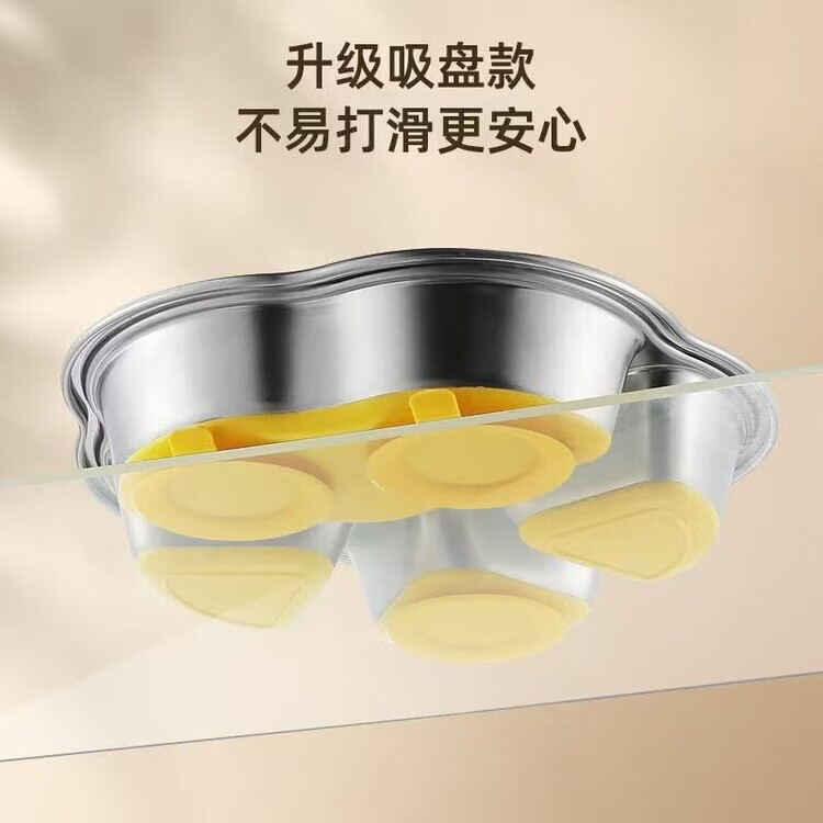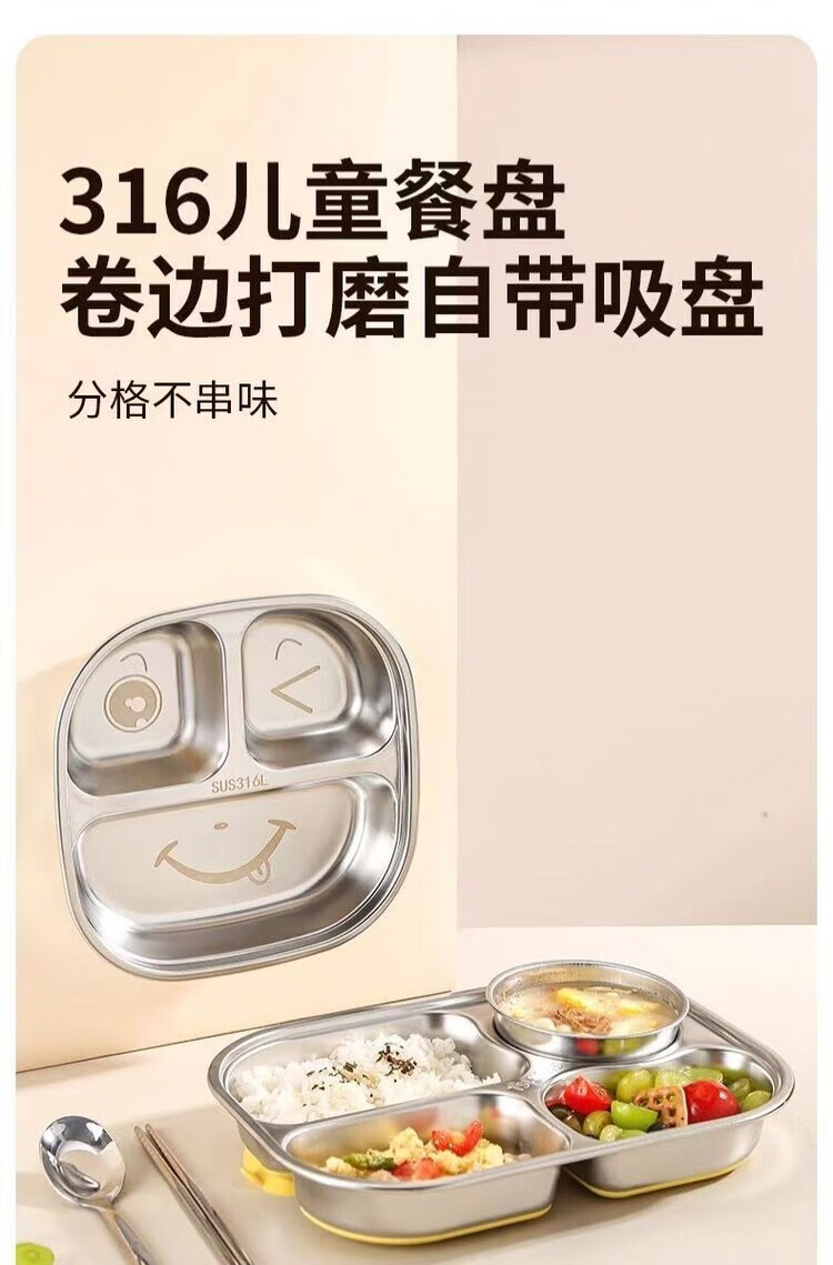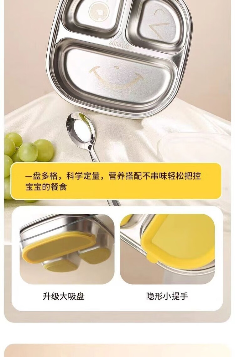 简漾316不锈钢儿童宝宝餐盘分格吸盘式婴儿专用辅食盘可吸附自主进食 三格带吸盘 1000毫升