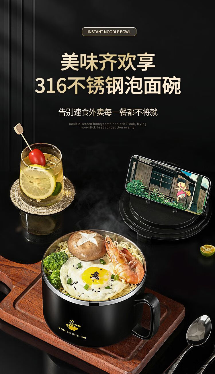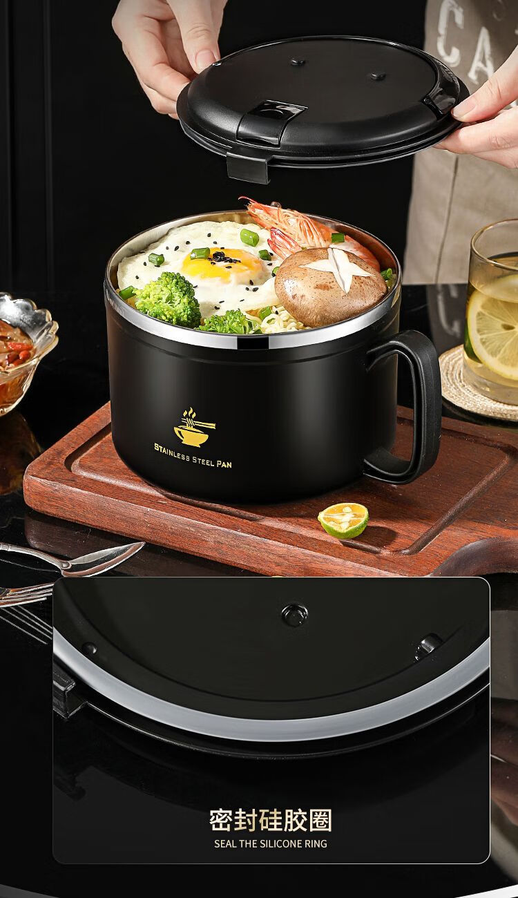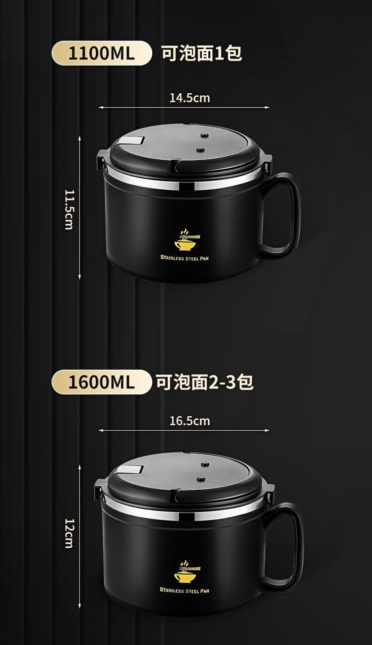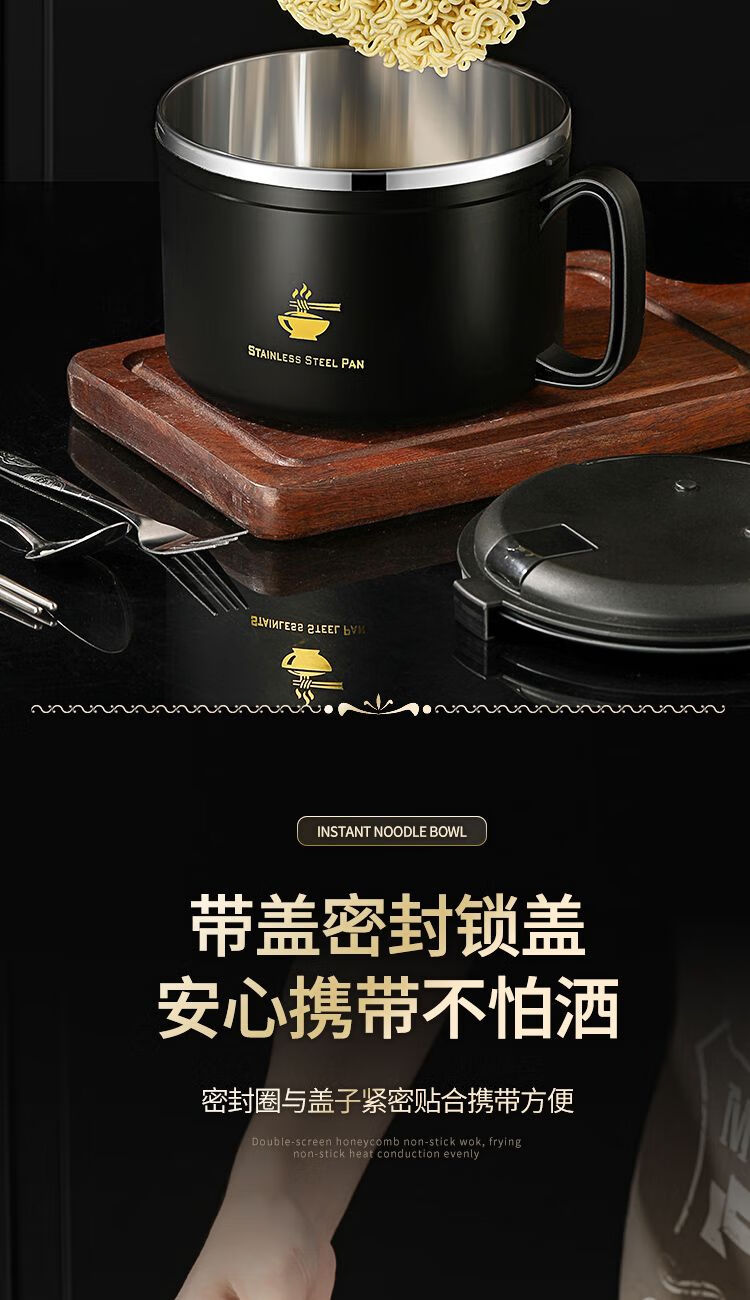 DEATKN德国食品级316不锈钢泡面碗带盖可沥水学生食堂打饭饭盒宿舍304碗 304【黑骑士】 1100ML【无礼品】可泡一包