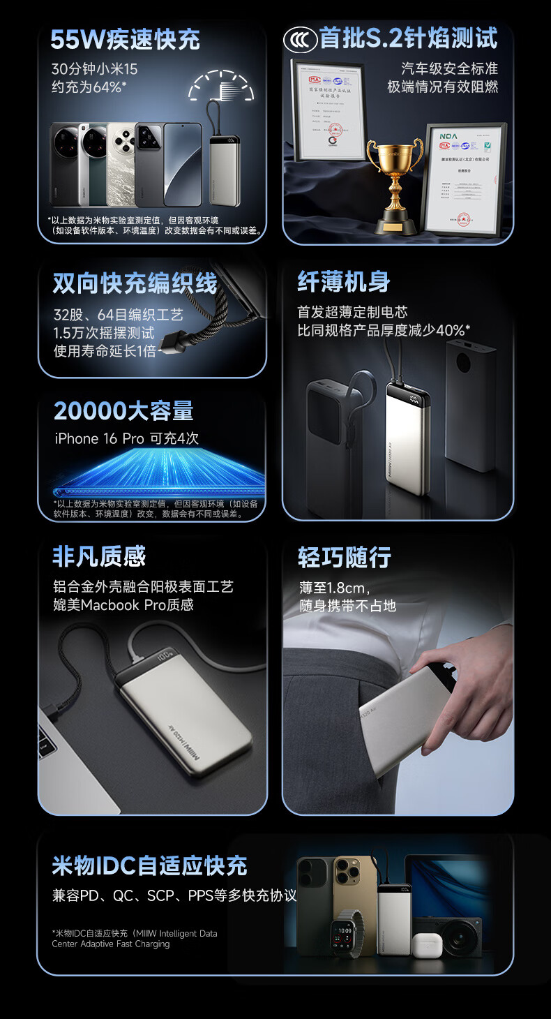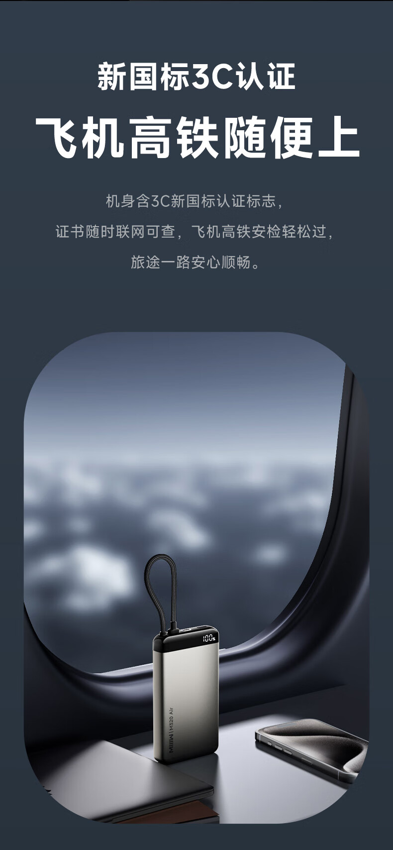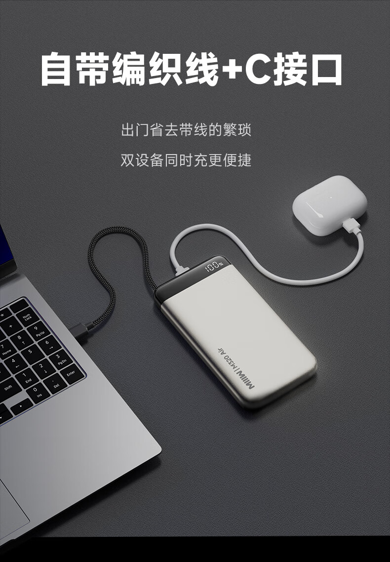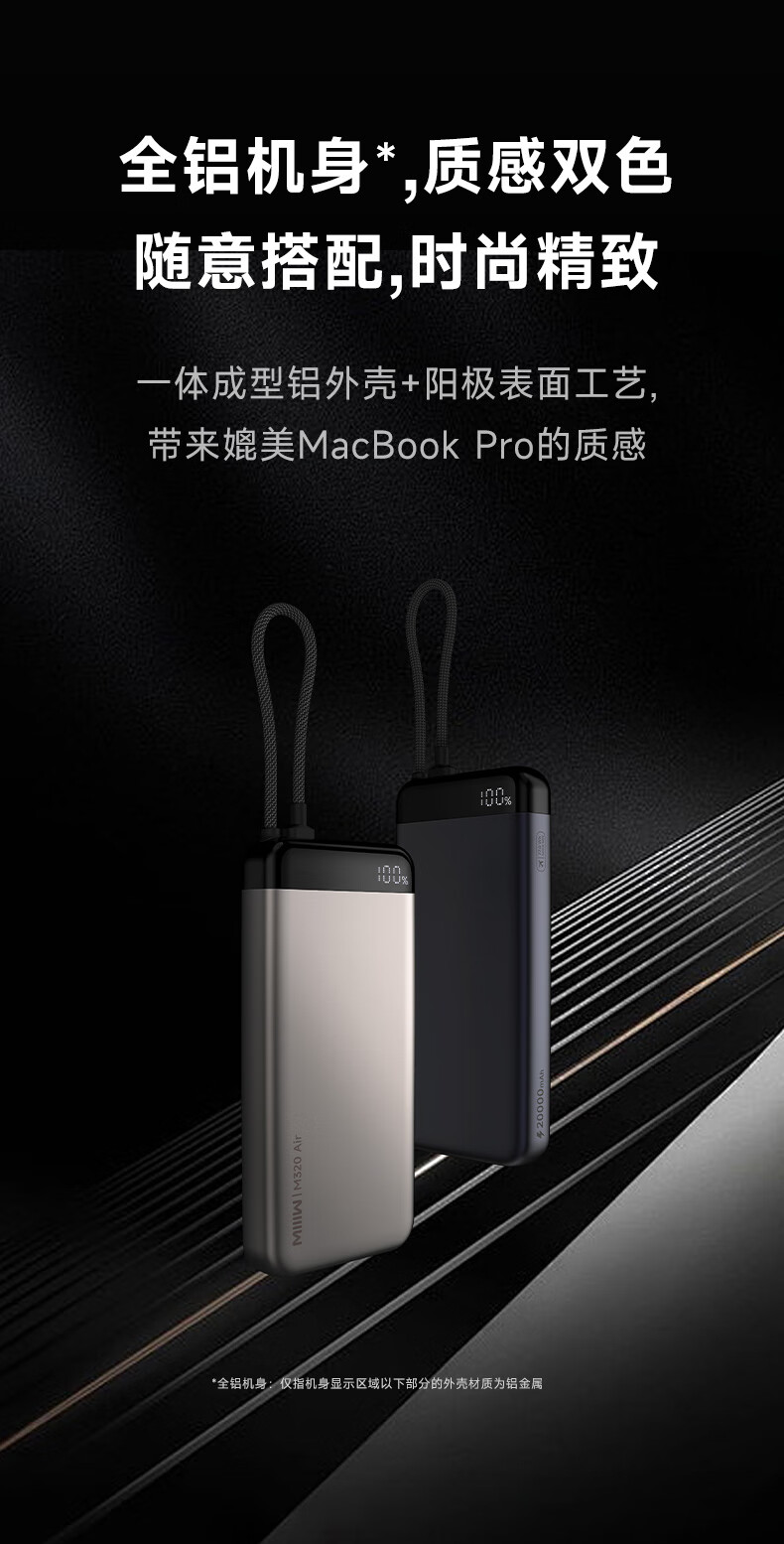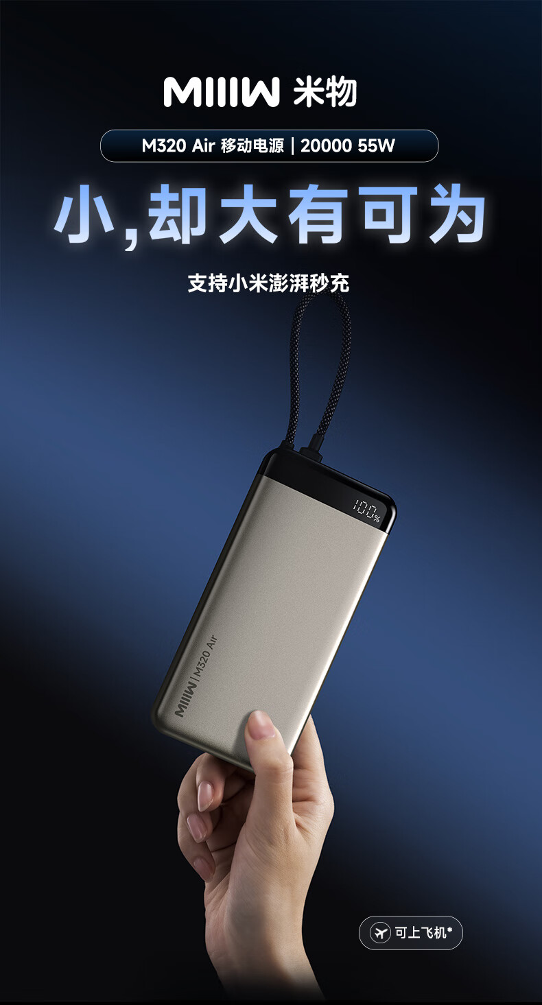 MIIIW米物【3C认证可上飞机】20000mAh 55W/40W快充自带线充电宝 适用华为荣耀苹果17系列 M320Air钛金