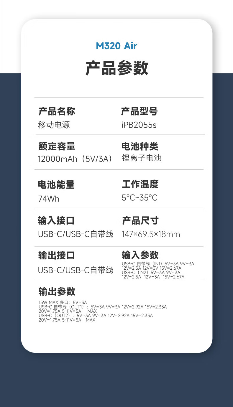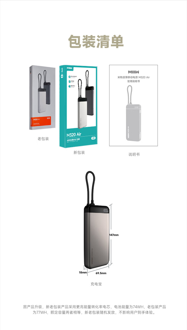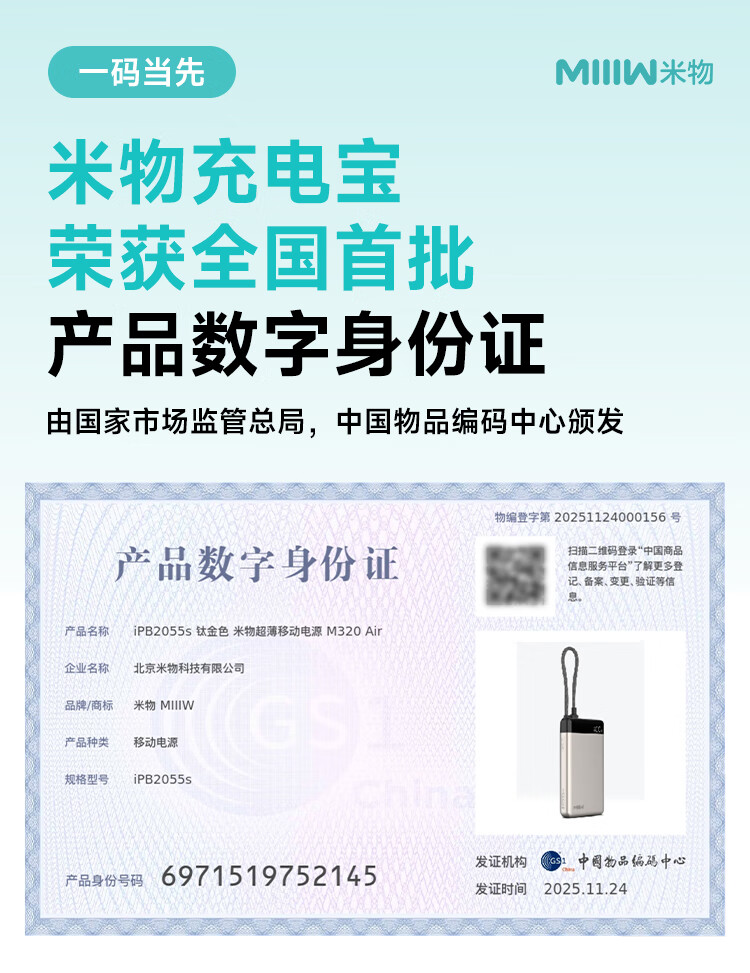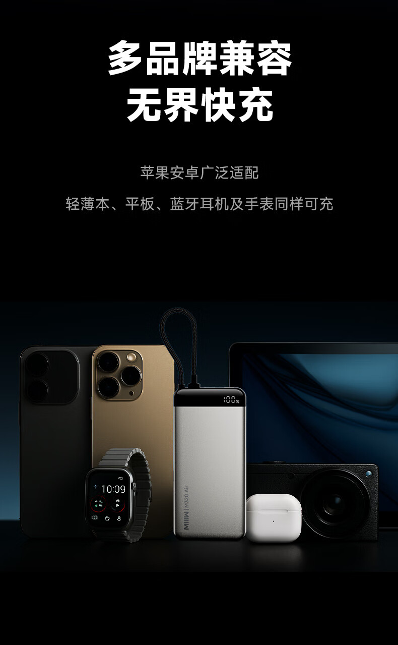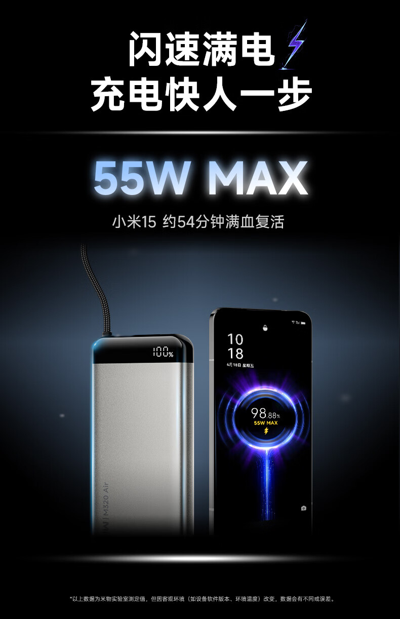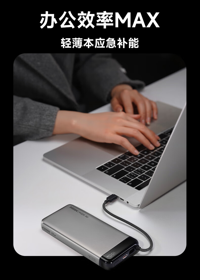 MIIIW米物【3C认证可上飞机】20000mAh 55W/40W快充自带线充电宝 适用华为荣耀苹果17系列 M320Air钛金