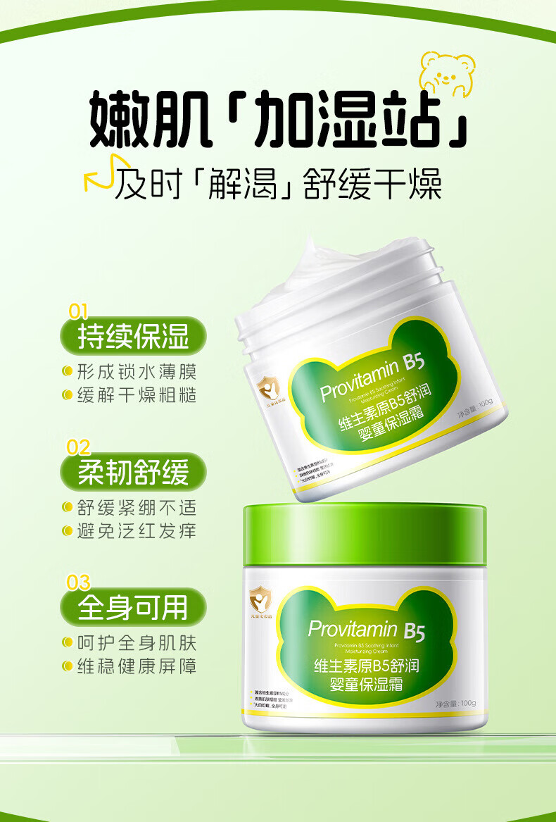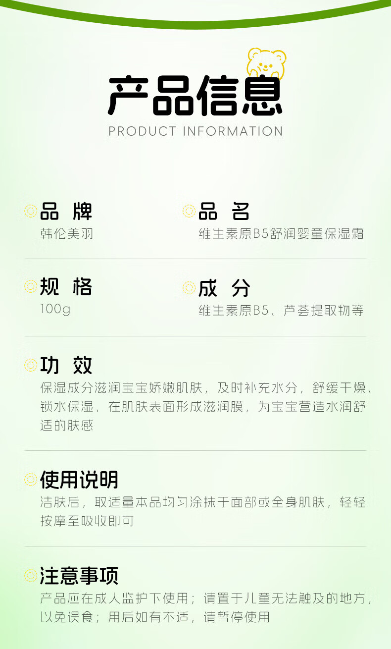 韩伦美羽B5舒润霜保湿面霜宝宝专用秋冬补水 维生素原B5舒润婴童保湿霜100g