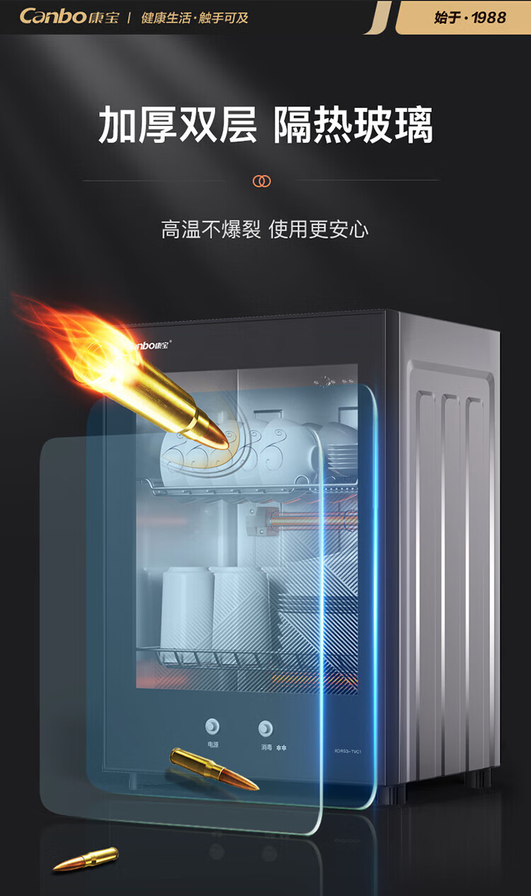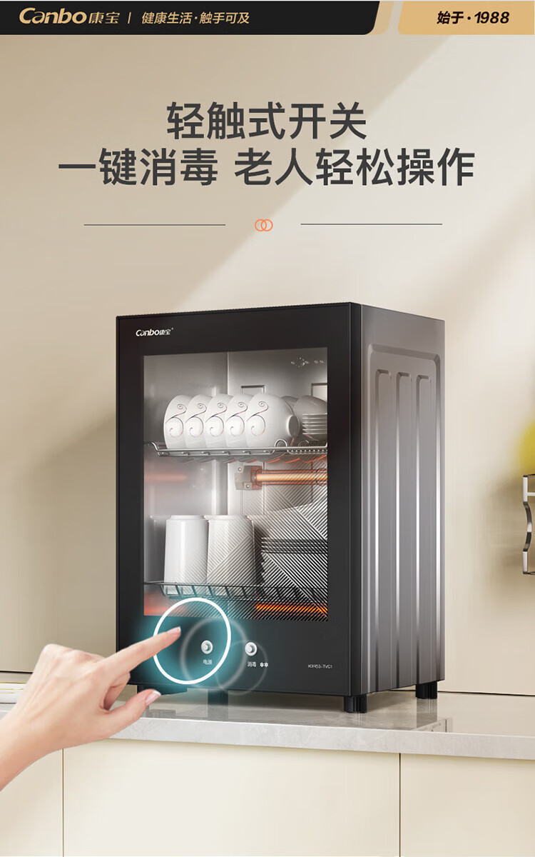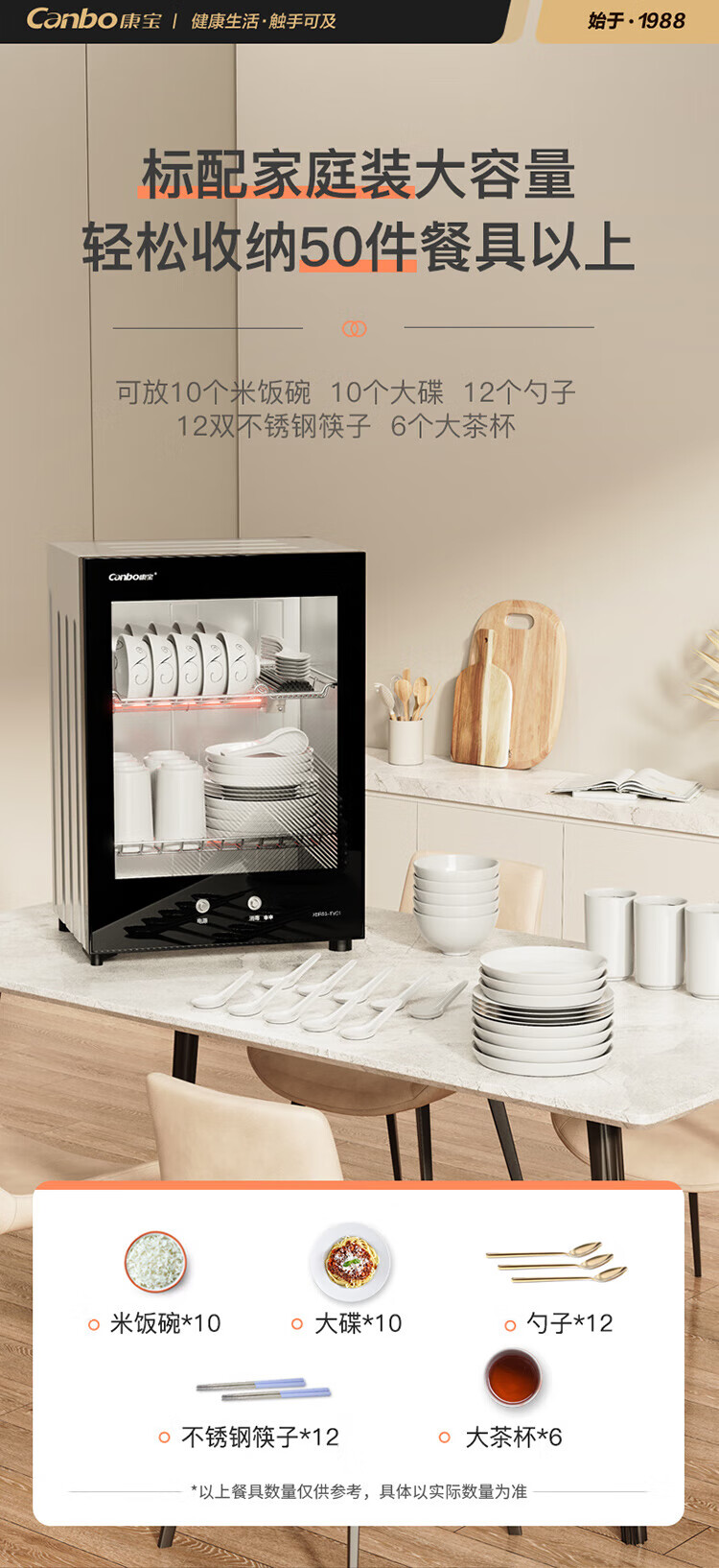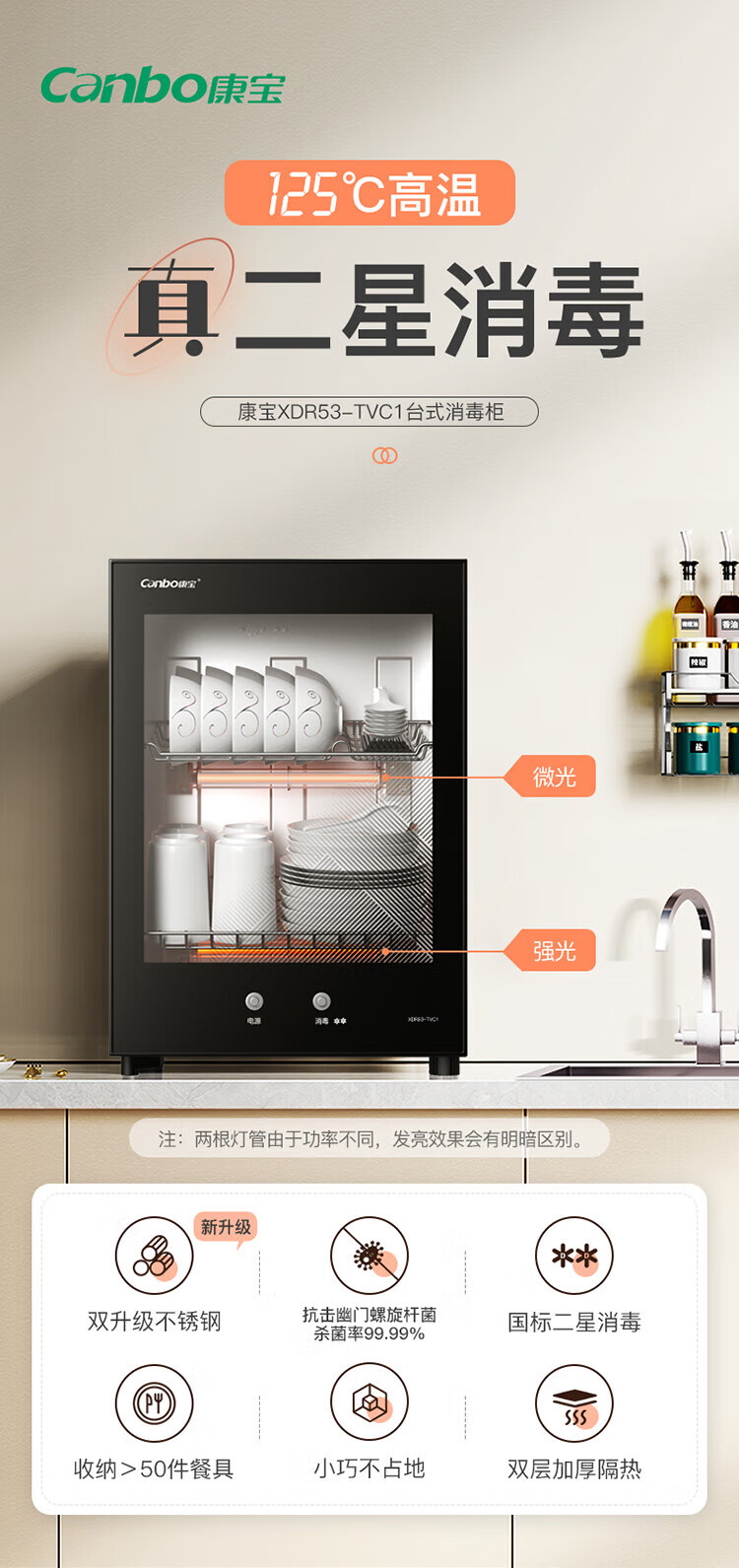 康宝(Canbo)消毒碗柜家用 台式 厨房碗筷柜 二星级高温消毒 客厅 办公茶杯茶具消毒柜 桌面式 不锈钢内胆 二星级 50L 丨XDR53-TVC1
