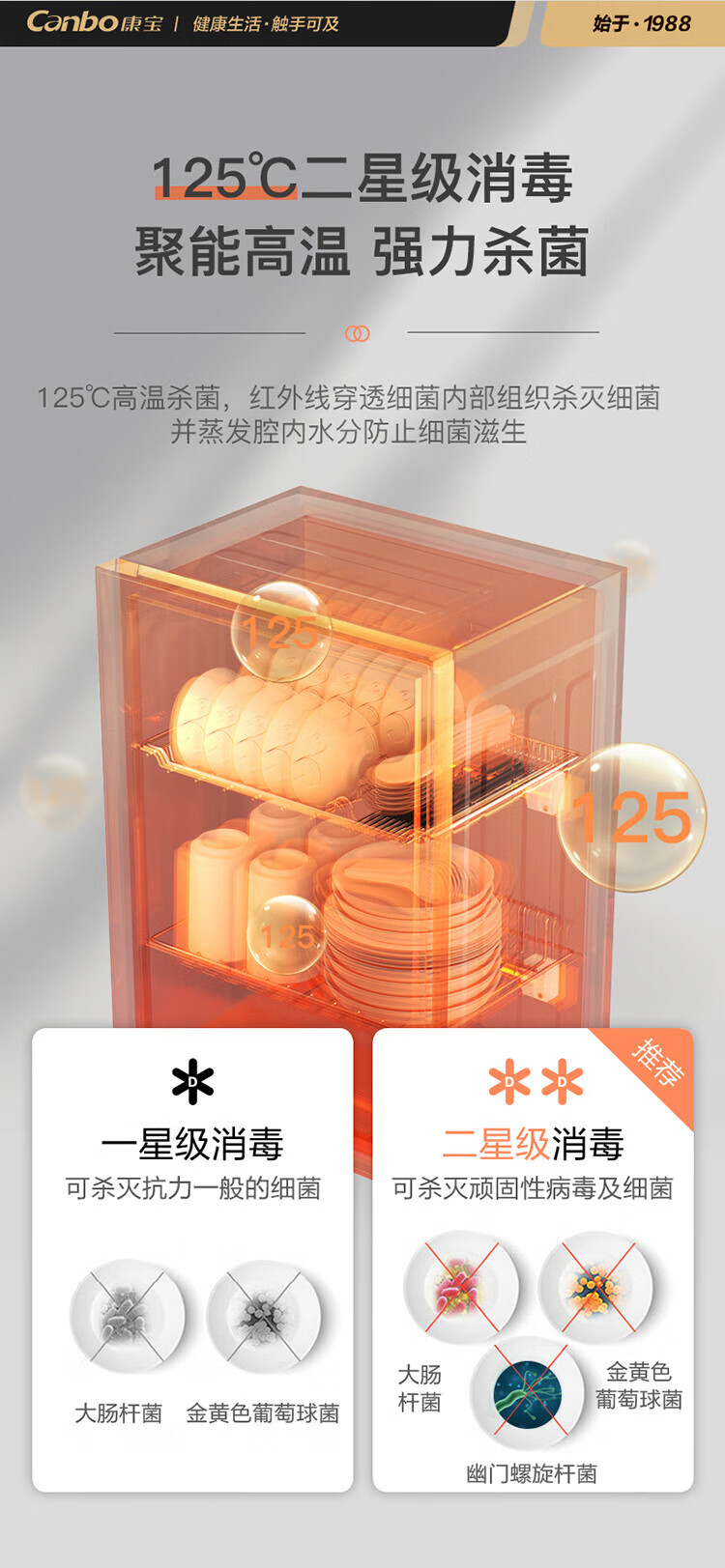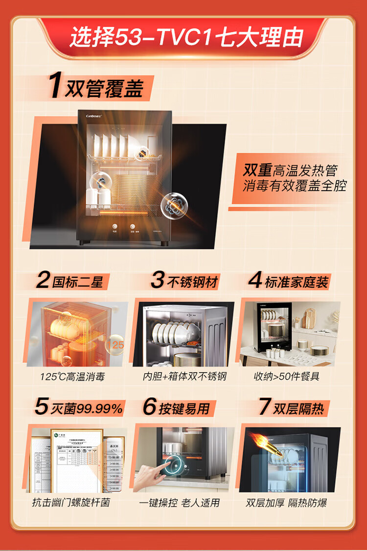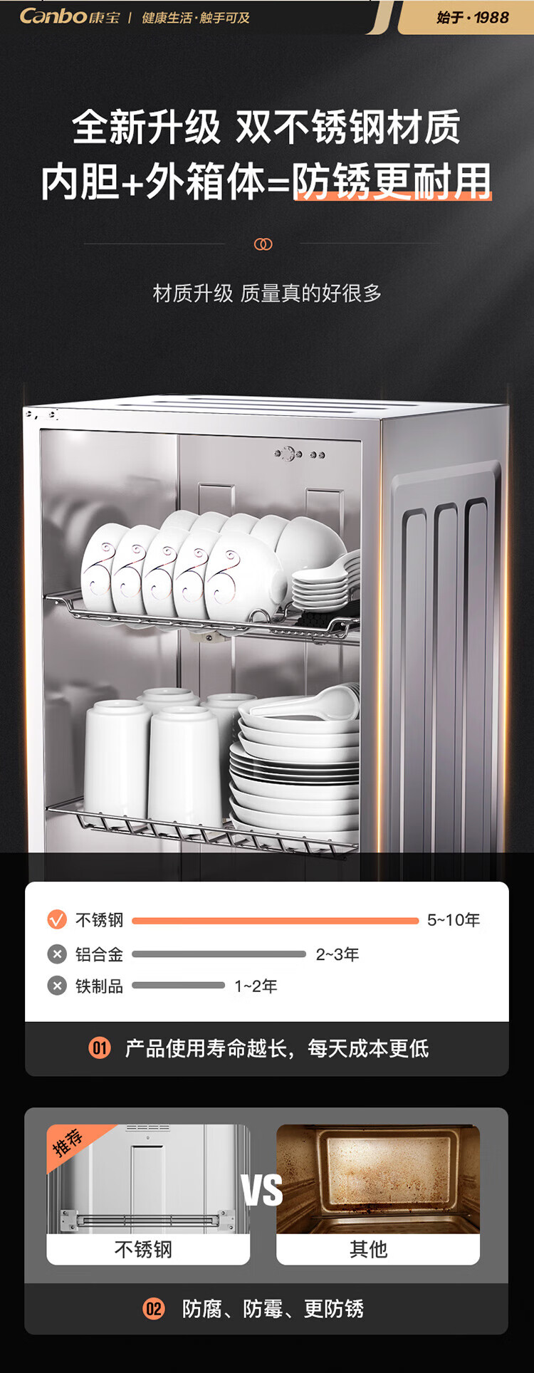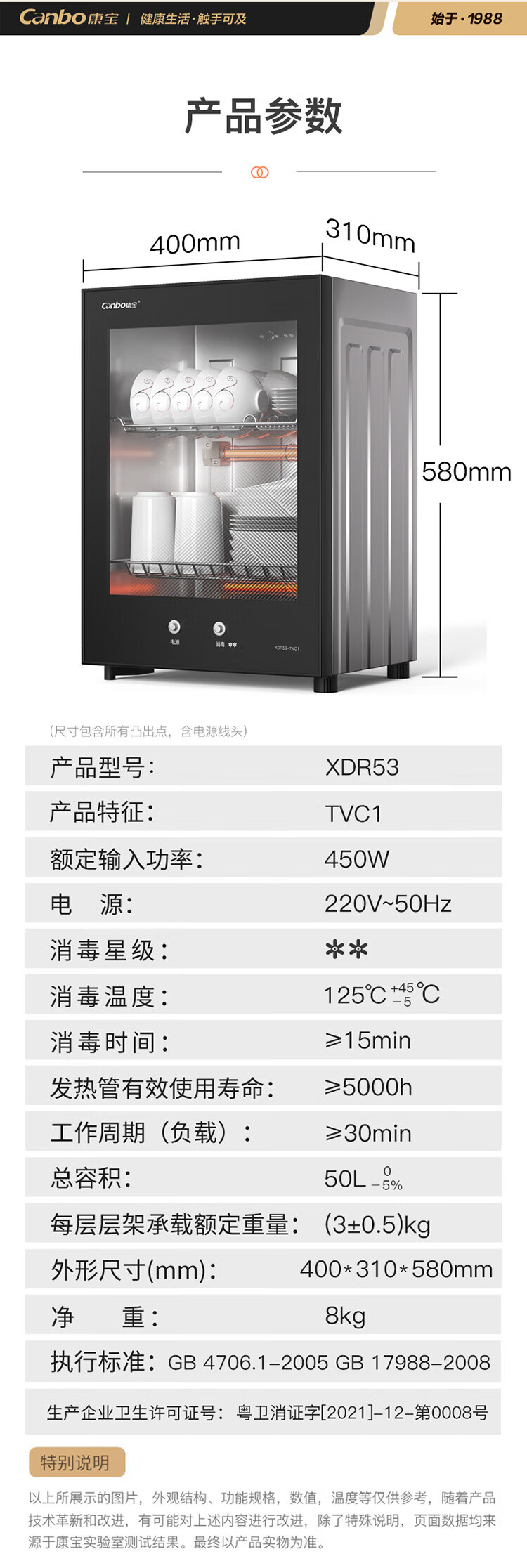 康宝(Canbo)消毒碗柜家用 台式 厨房碗筷柜 二星级高温消毒 客厅 办公茶杯茶具消毒柜 桌面式 不锈钢内胆 二星级 50L 丨XDR53-TVC1