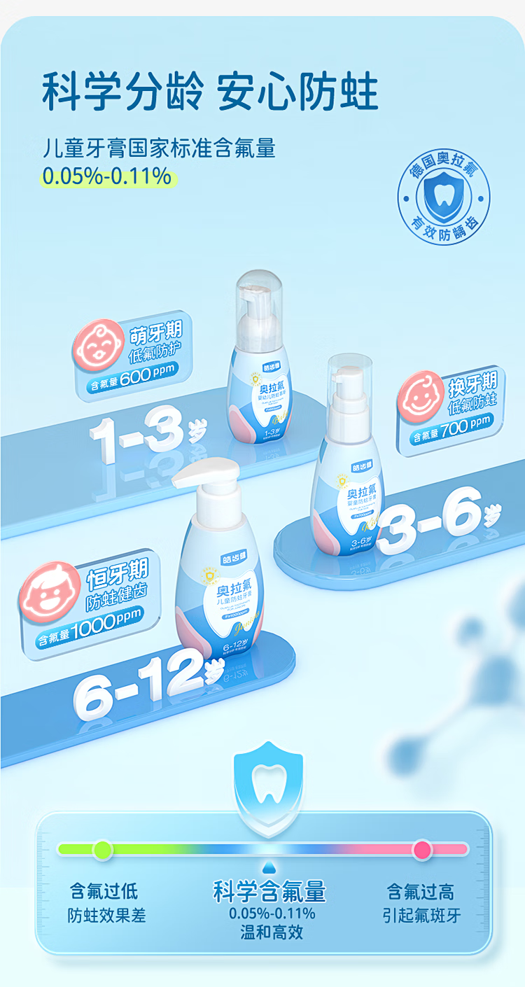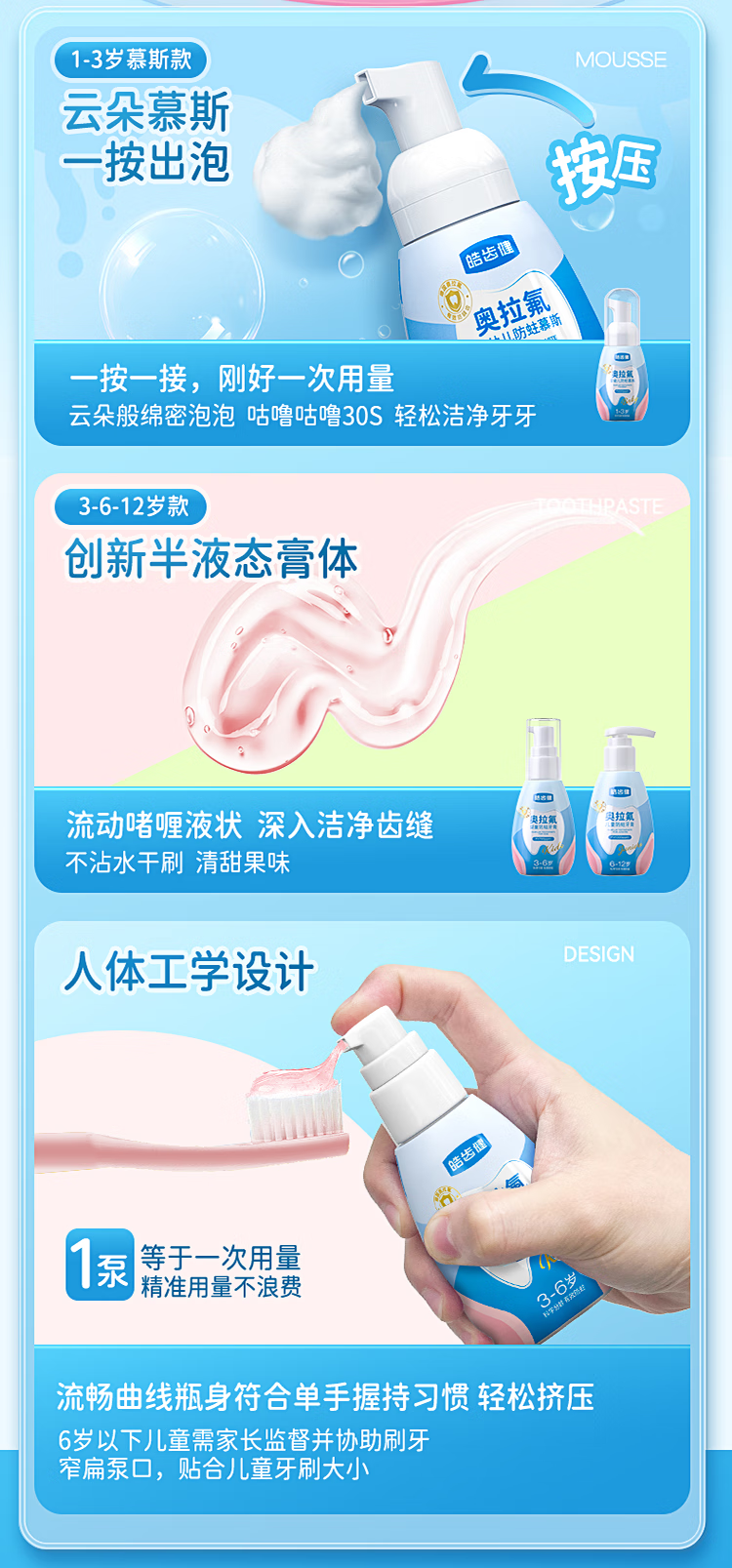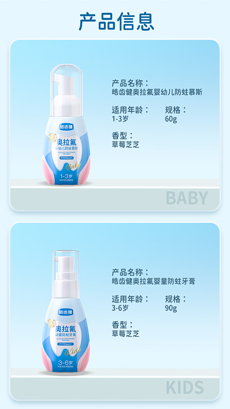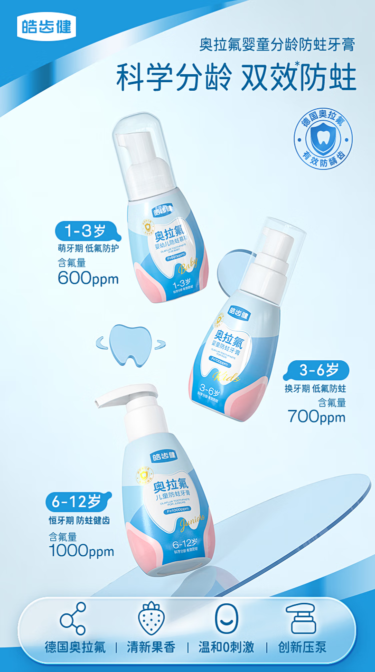 皓齿健(Hosjam)奥拉氟婴幼儿防蛀牙膏 防蛀液体按压式 宝宝预防龋齿护齿口腔清洁 【1-3岁】奥拉氟防蛀慕斯60g