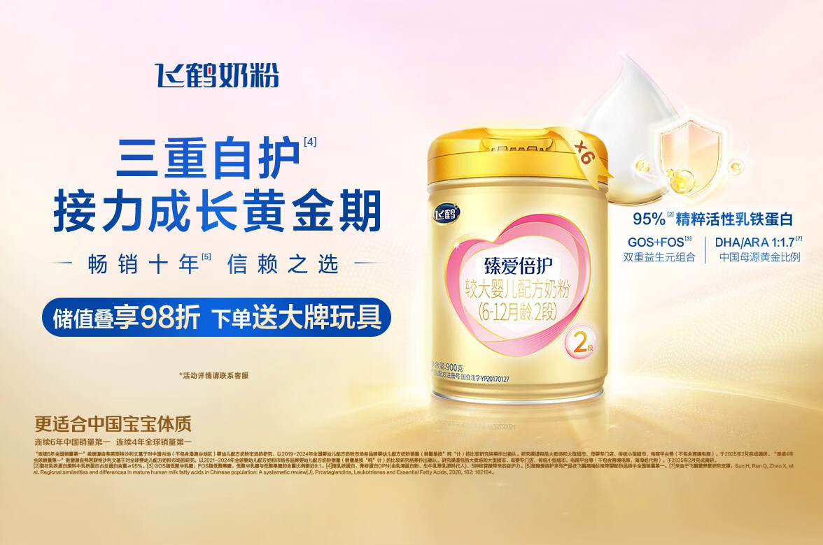 飞鹤臻爱倍护 婴儿配方奶粉2段(6-12个月) 900g*6 乳铁蛋白 育儿补贴