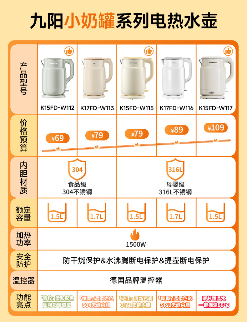 九阳(Joyoung)热水壶烧水壶电水壶 双层壶体 304不锈钢 1.5L家用0胶水电水壶 K15FD-W112