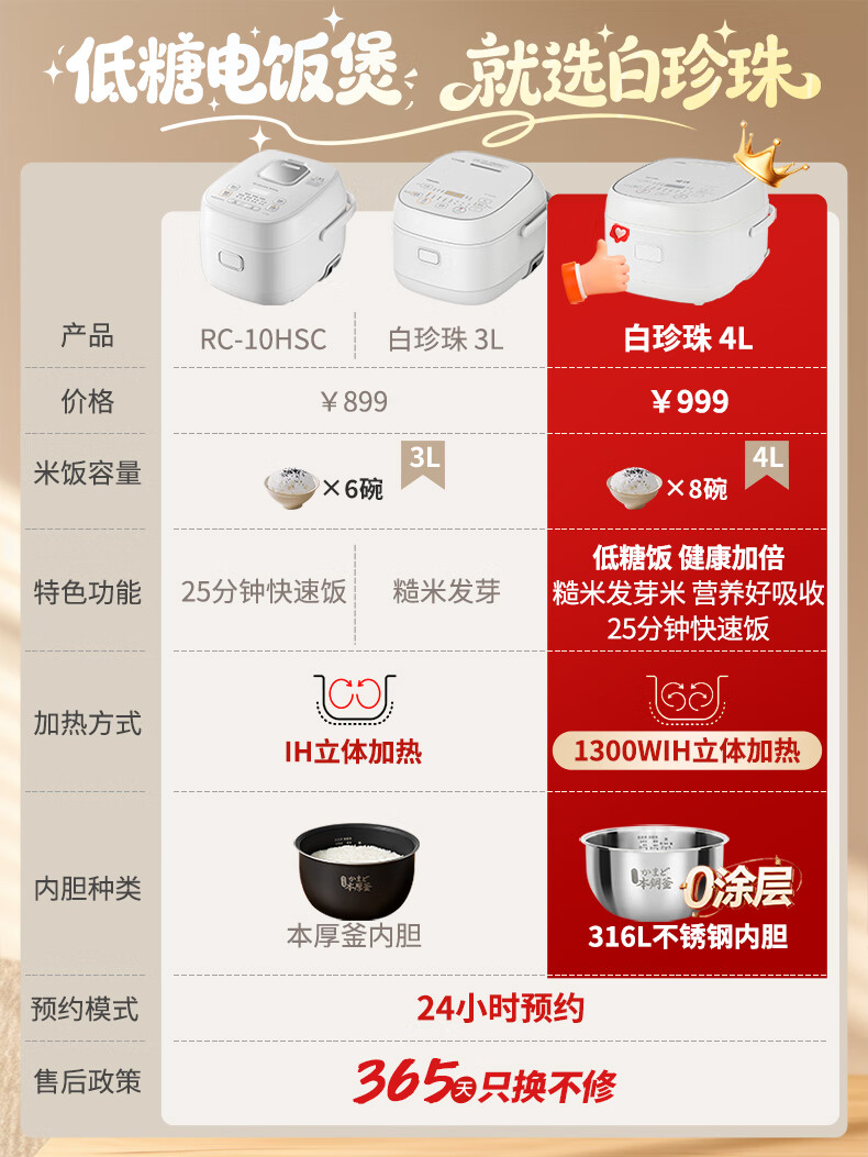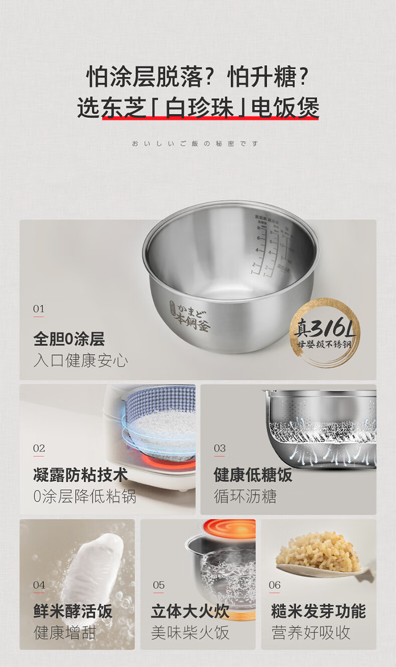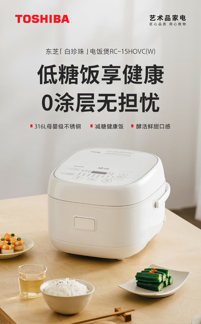 东芝(TOSHIBA)【重磅新品国家补贴20%】白珍珠0涂层电饭煲4-5人无涂层不锈钢IH低糖电饭煲4升容量 RC-15HOVC(W)