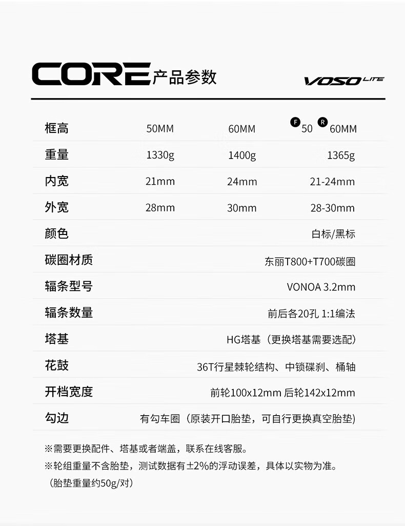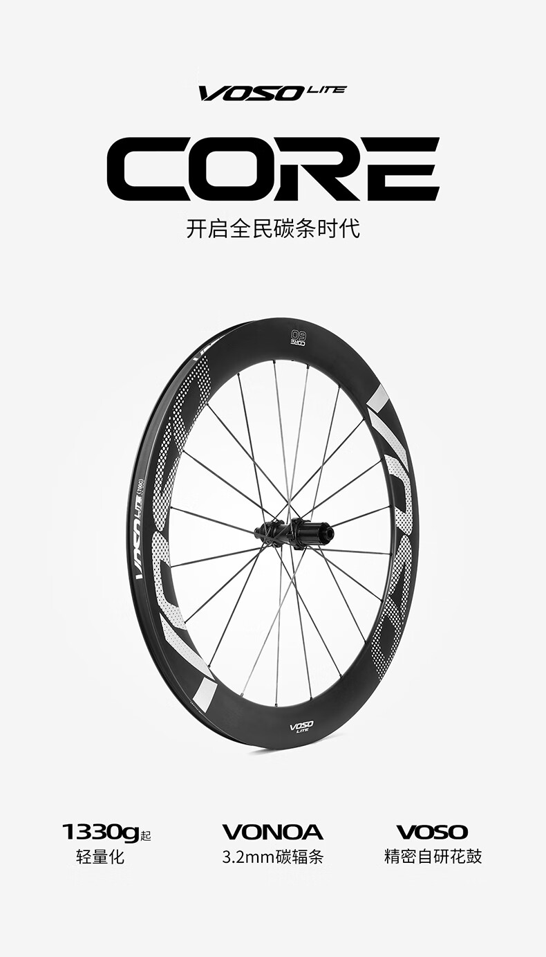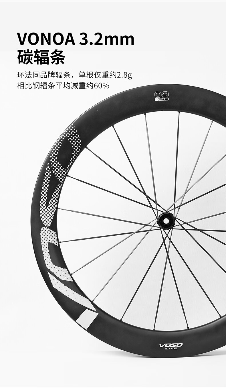 VOSO LITE CORE 碳纤维轮组公路自行车碳刀轮组VONOA3.2mm碳条 单后轮 60黑标
