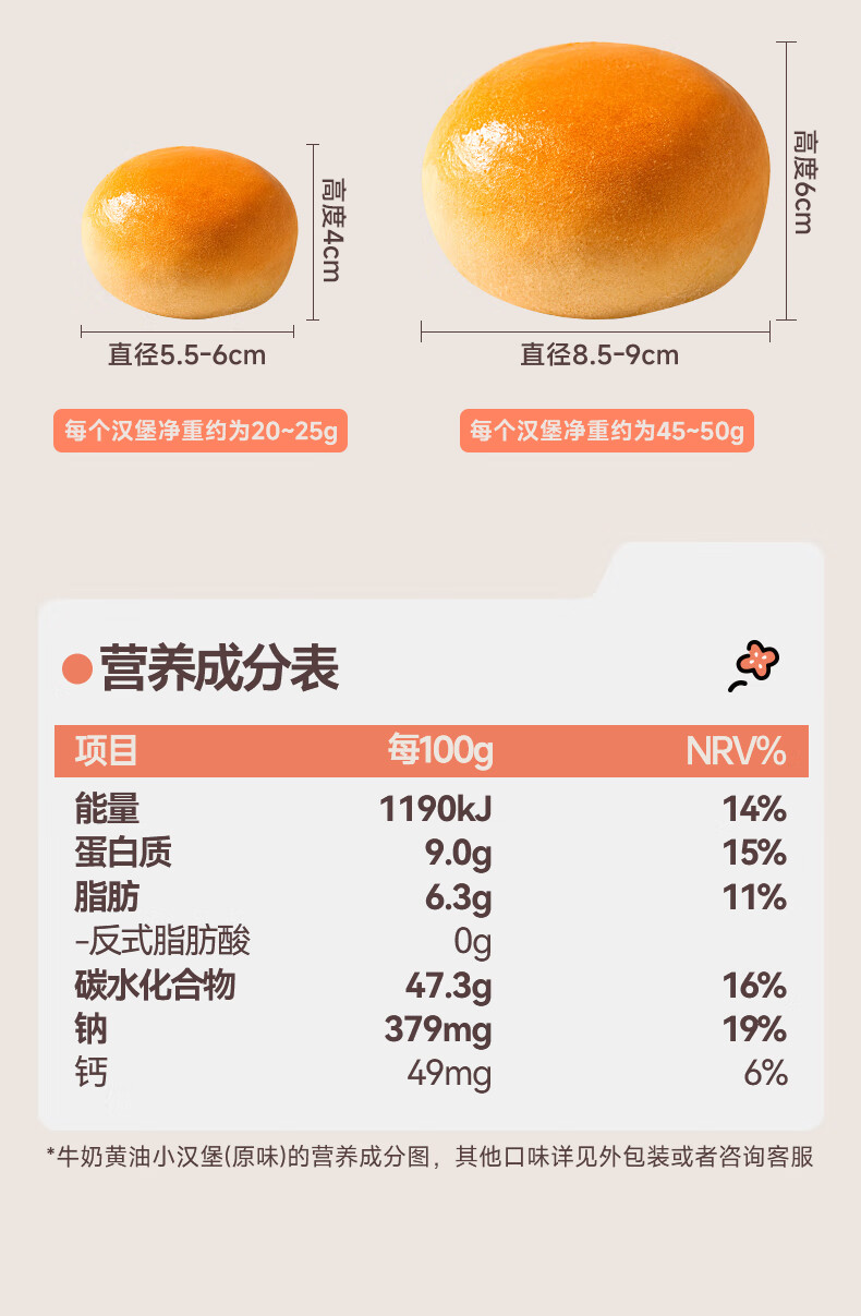 花田熊牛奶黄油小汉堡胚儿童营养早餐迷你汉堡包无添加防腐面包胚半成品 原味汉堡胚 2袋(共6枚)
