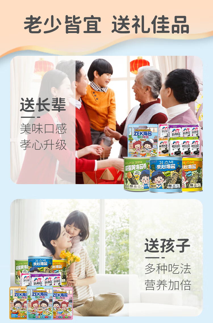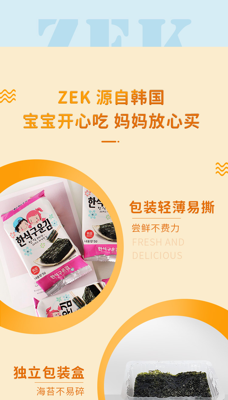 Zek韩国进口 经典原味海苔紫菜包饭寿司即食烤海苔 儿童零食5g*3包