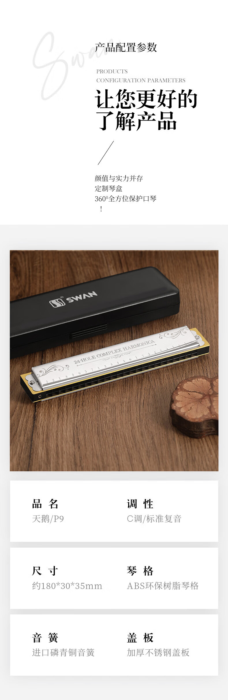 天鹅SWAN 24孔复音演奏口琴C调(音位标注)银色