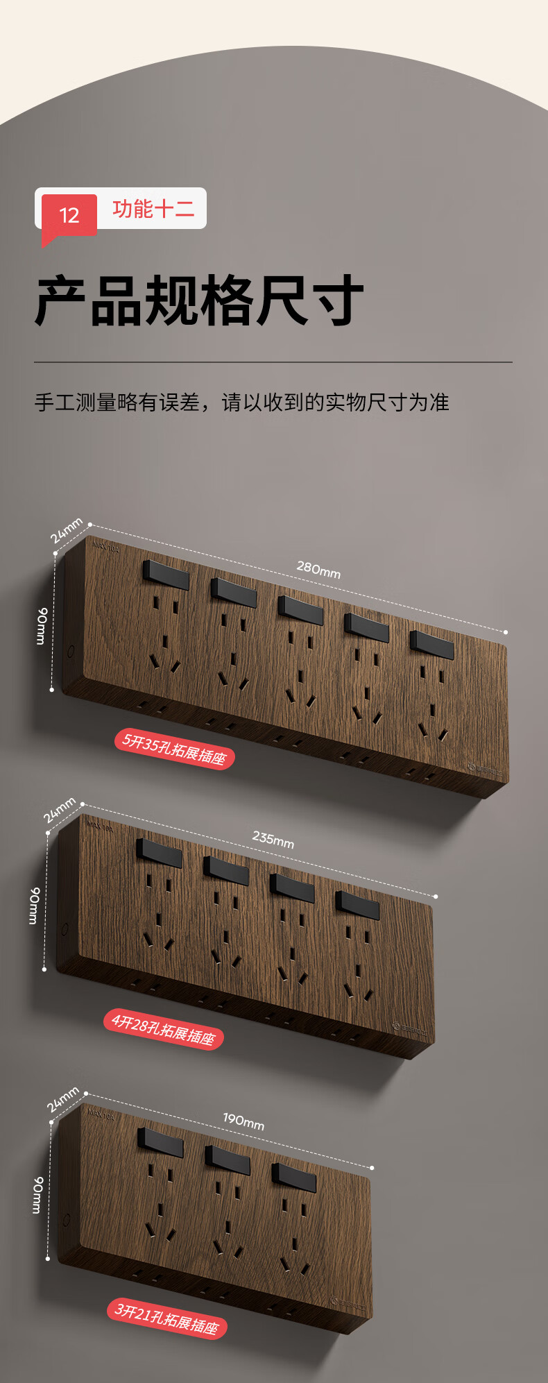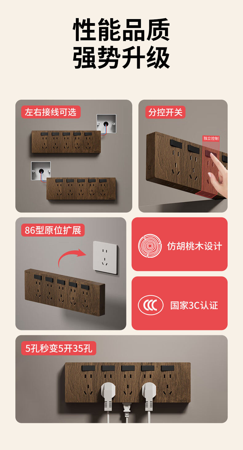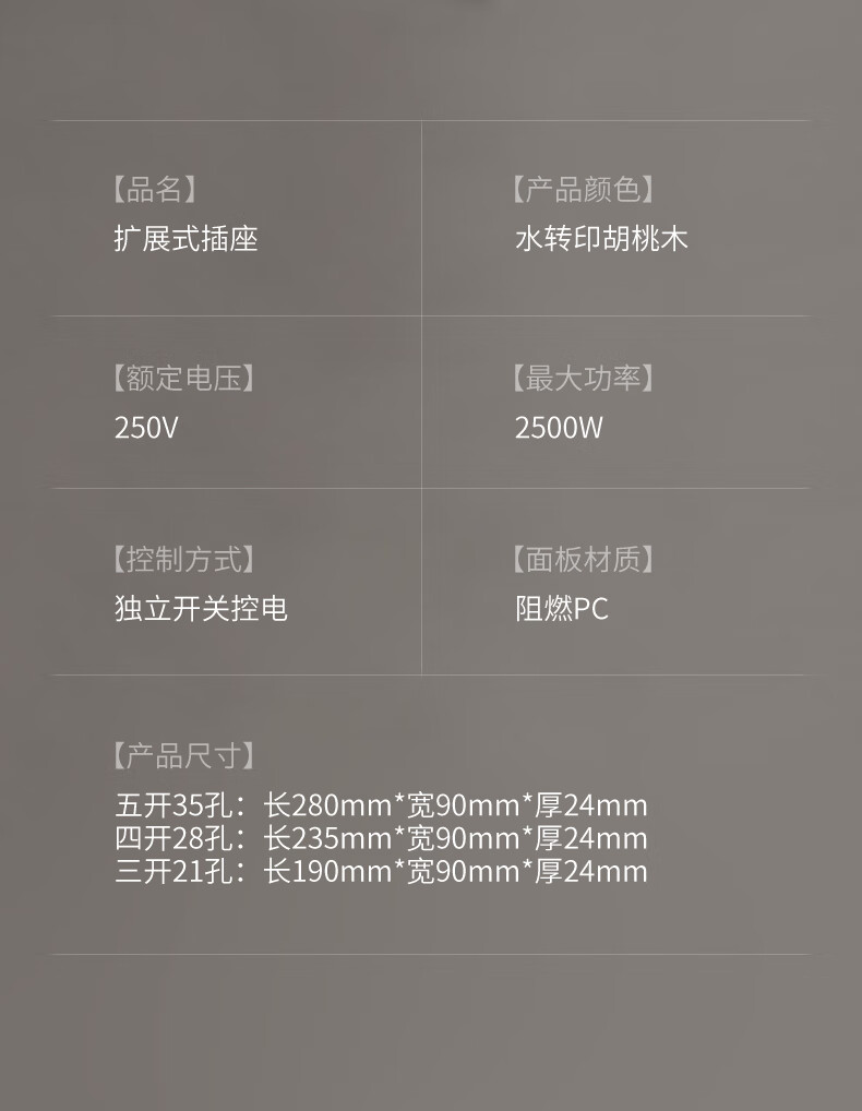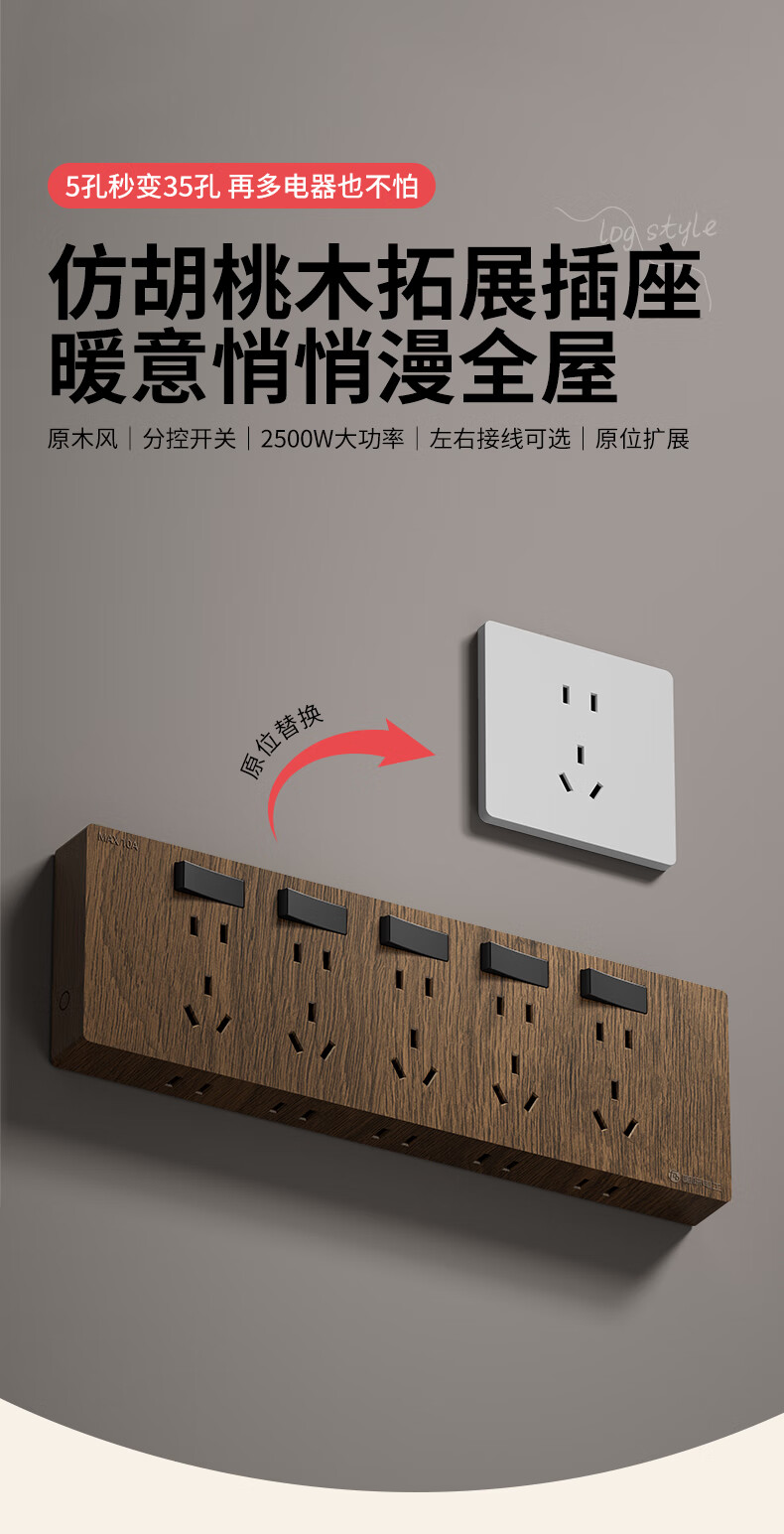 国际电工86型复古木纹扩展插座厨房墙壁多孔位开关原位替换无线转换插排 胡桃木色-三开21孔-左接线