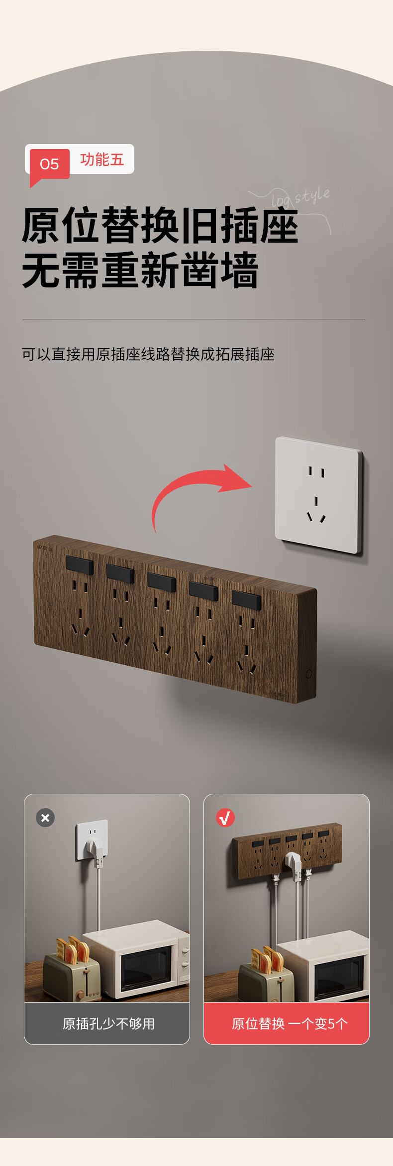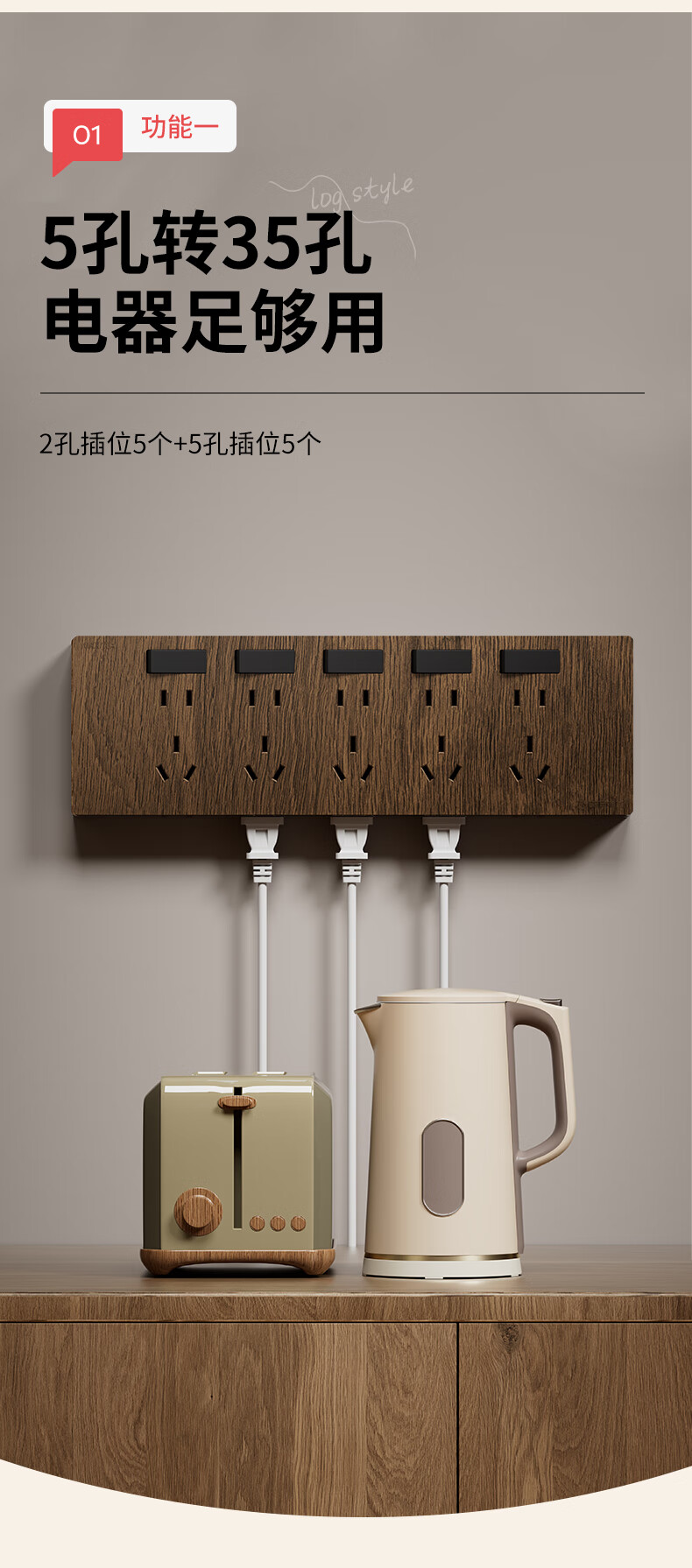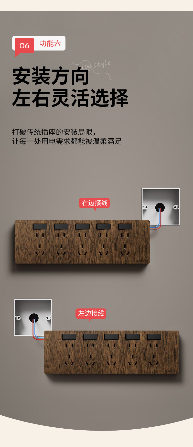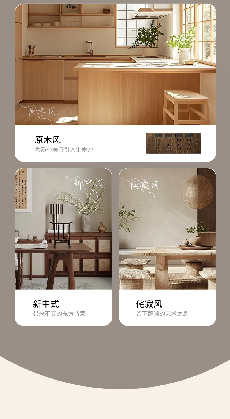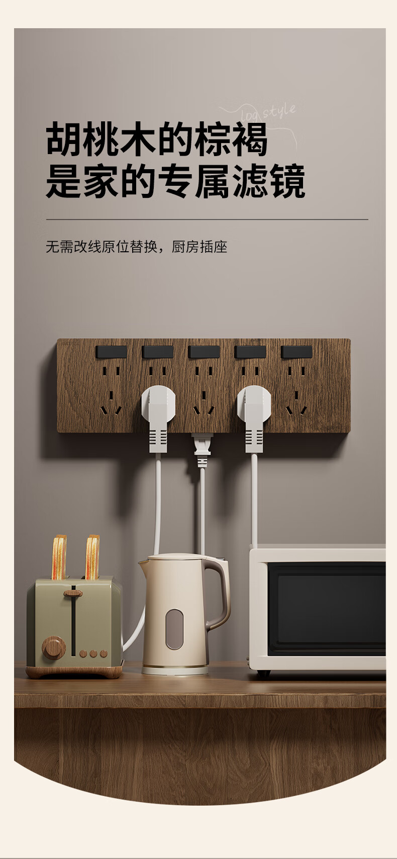 国际电工86型复古木纹扩展插座厨房墙壁多孔位开关原位替换无线转换插排 胡桃木色-三开21孔-左接线