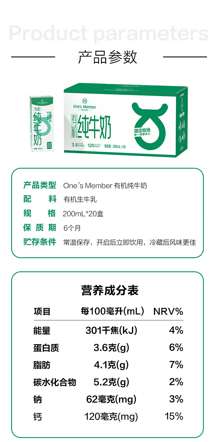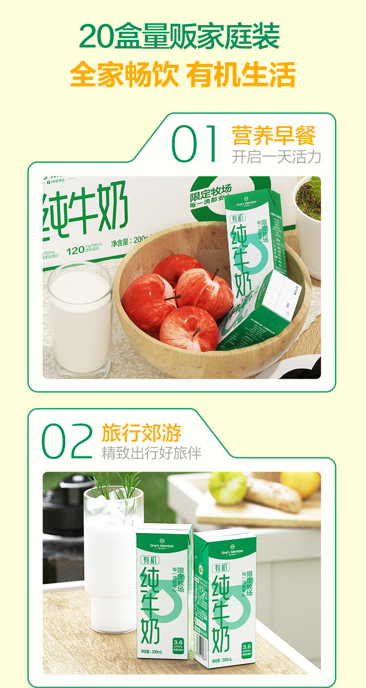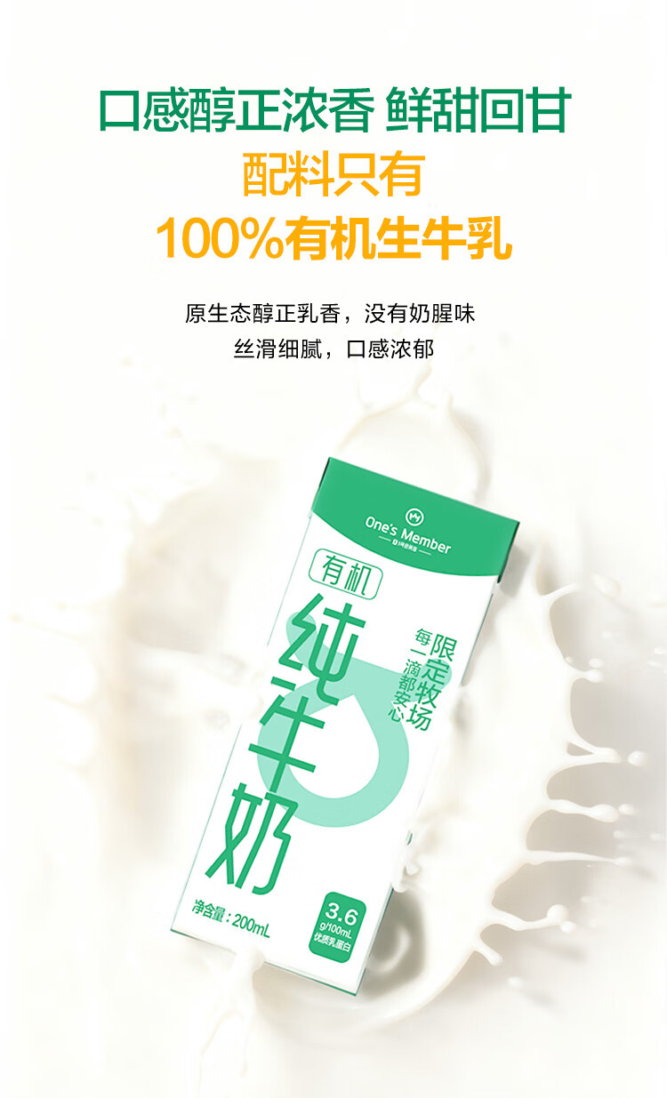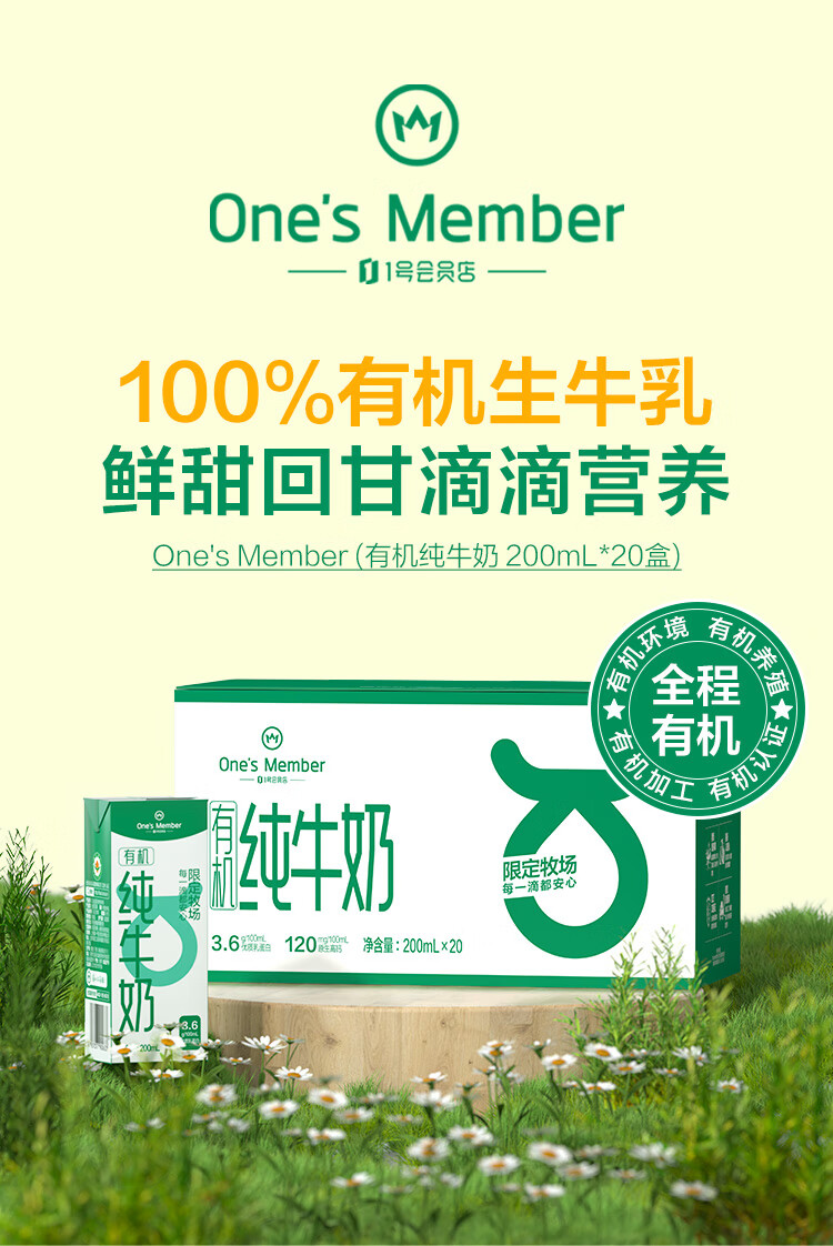 1号会员店(One's Member)3.6g蛋白有机纯牛奶 200ml*20盒 早餐咖啡伴侣 整箱量贩