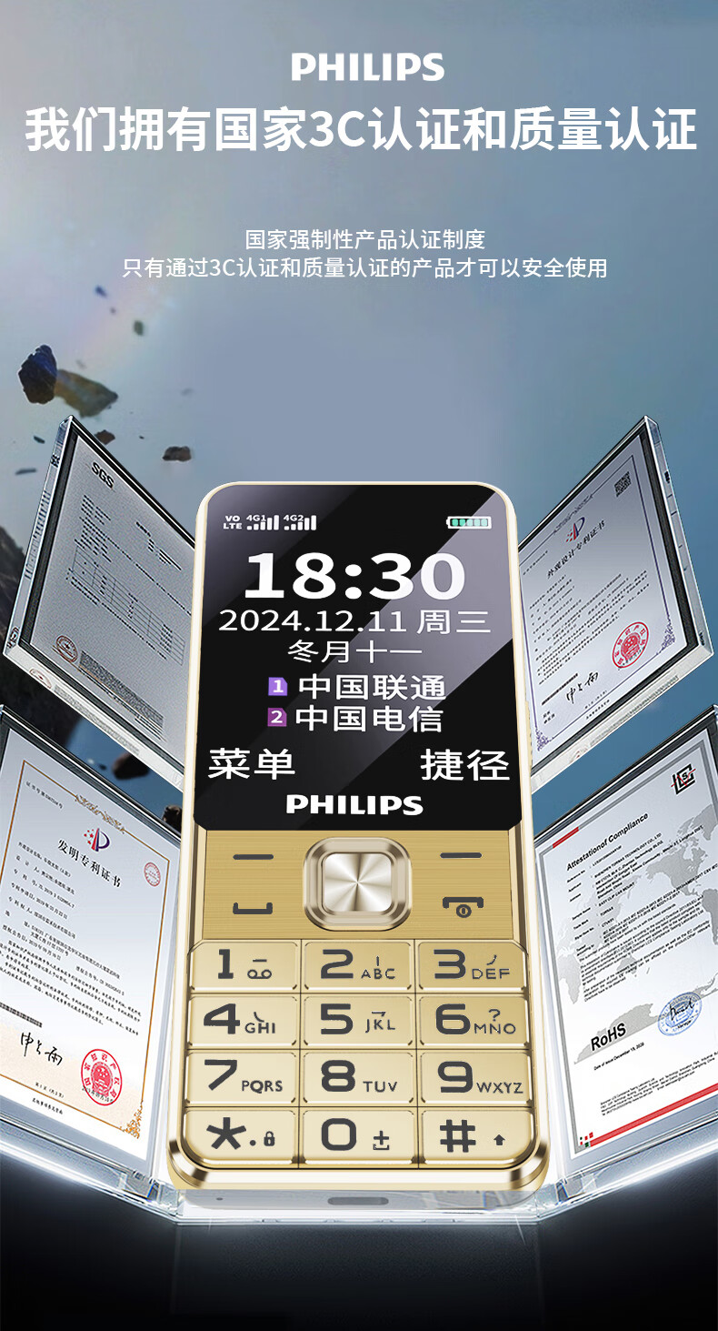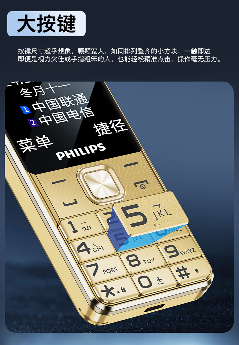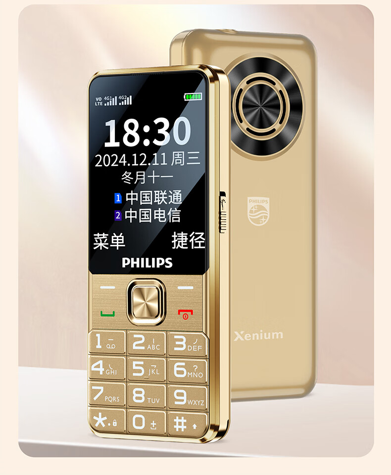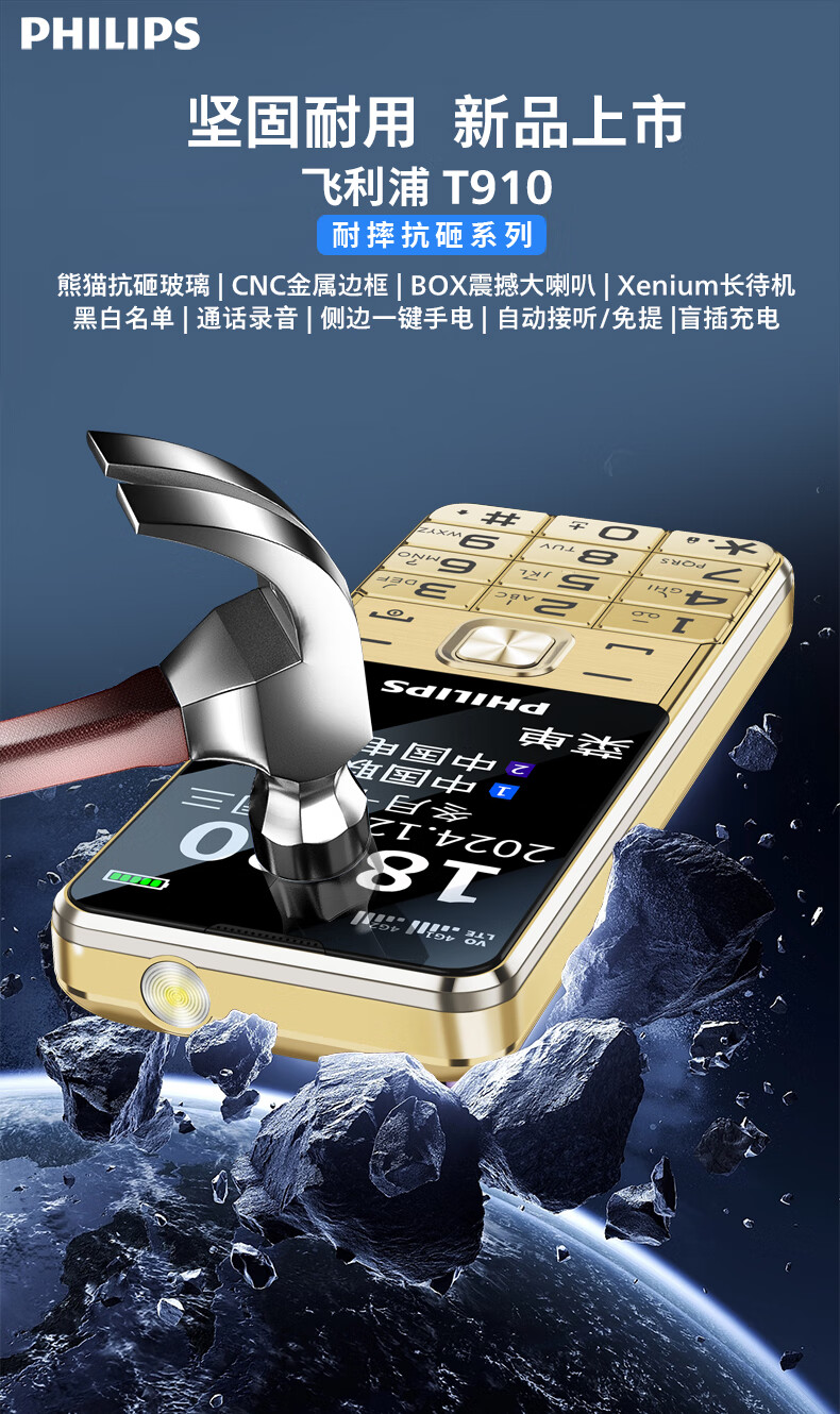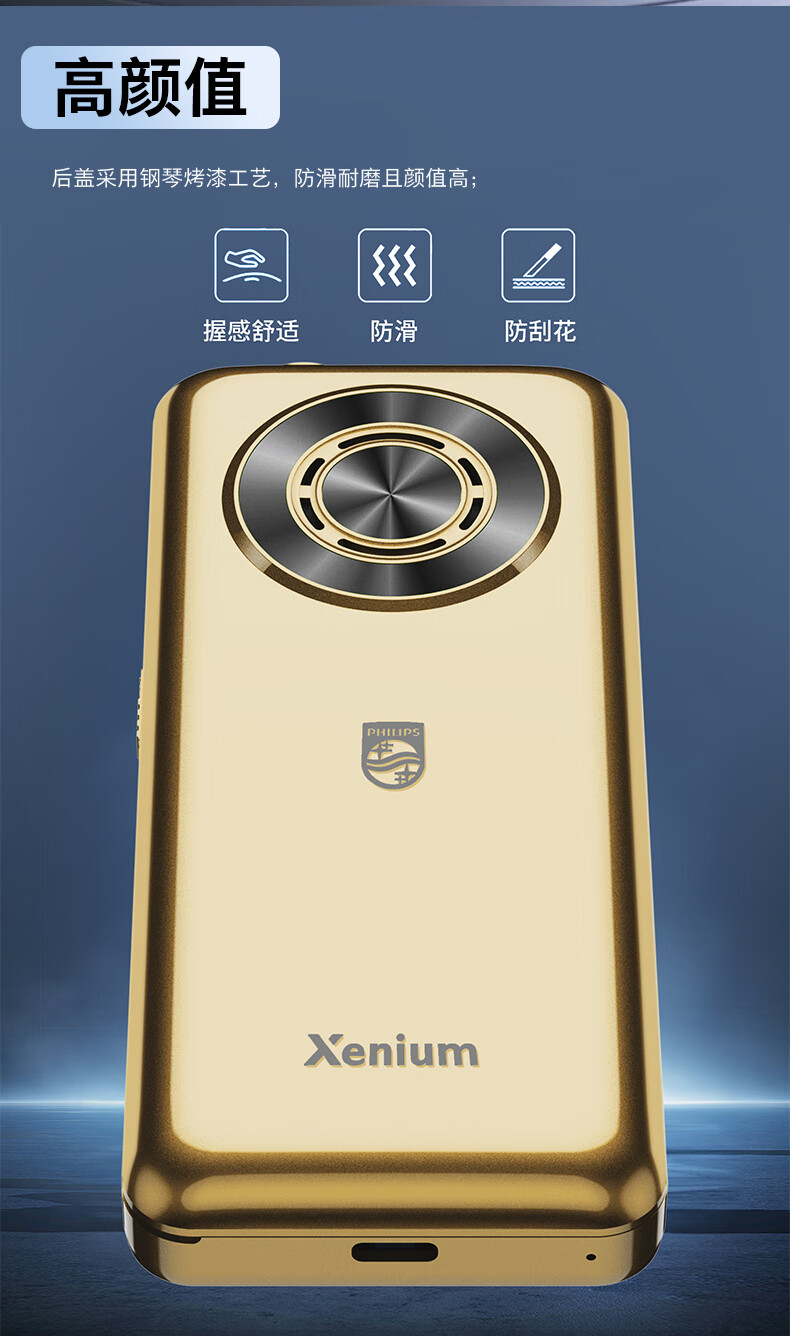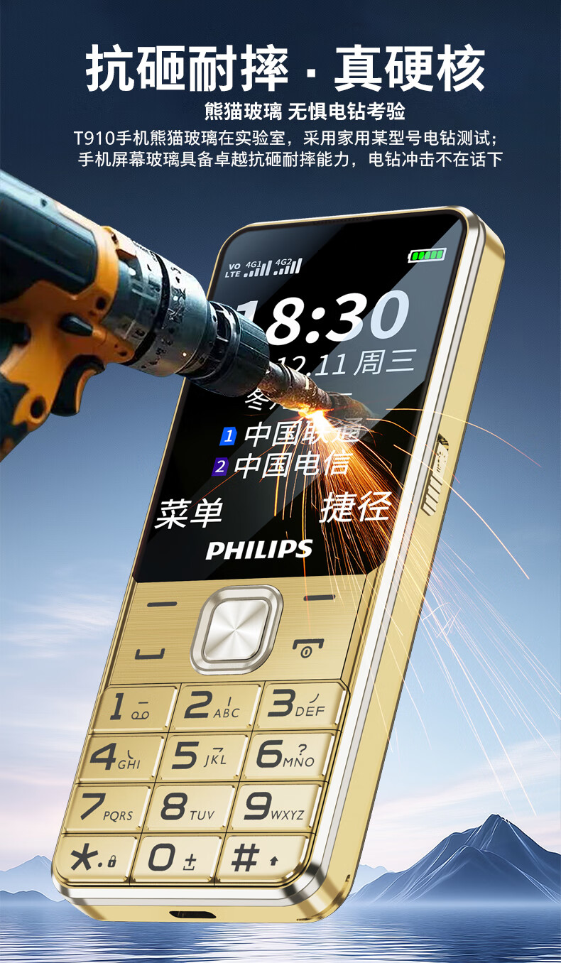 飞利浦(PHILIPS)T910 老年人手机4G全网通超长待机金属边框抗砸大屏大字体大声音老年人专用手机 学生备用机香缤金
