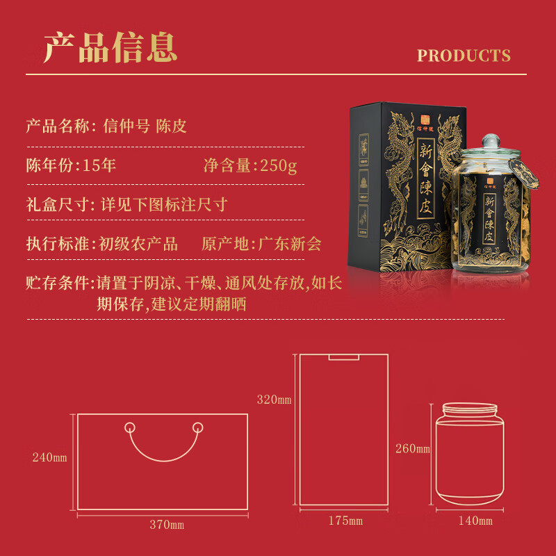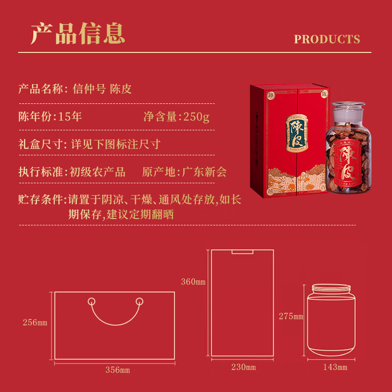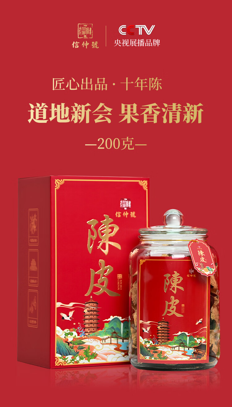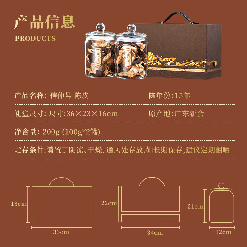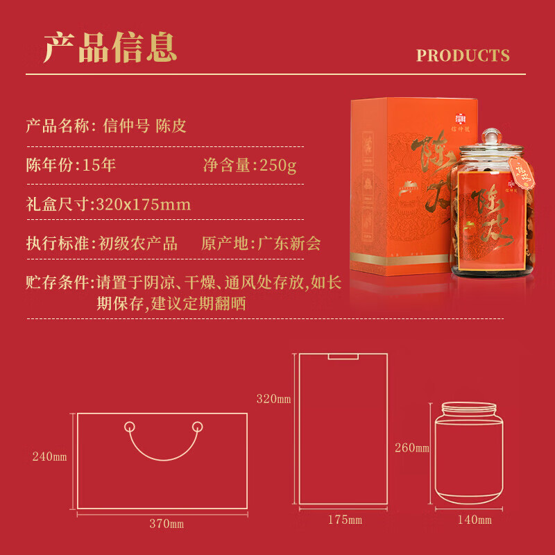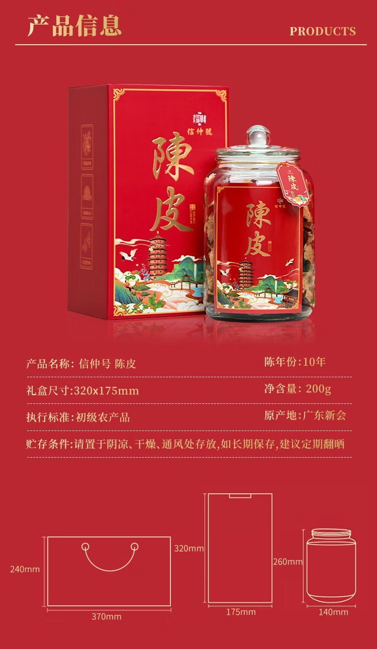 信仲号新会陈皮八年十年十五年礼盒泡茶广东特产送礼 【经典十年】新会老陈皮 玻璃罐礼盒 200g*1盒
