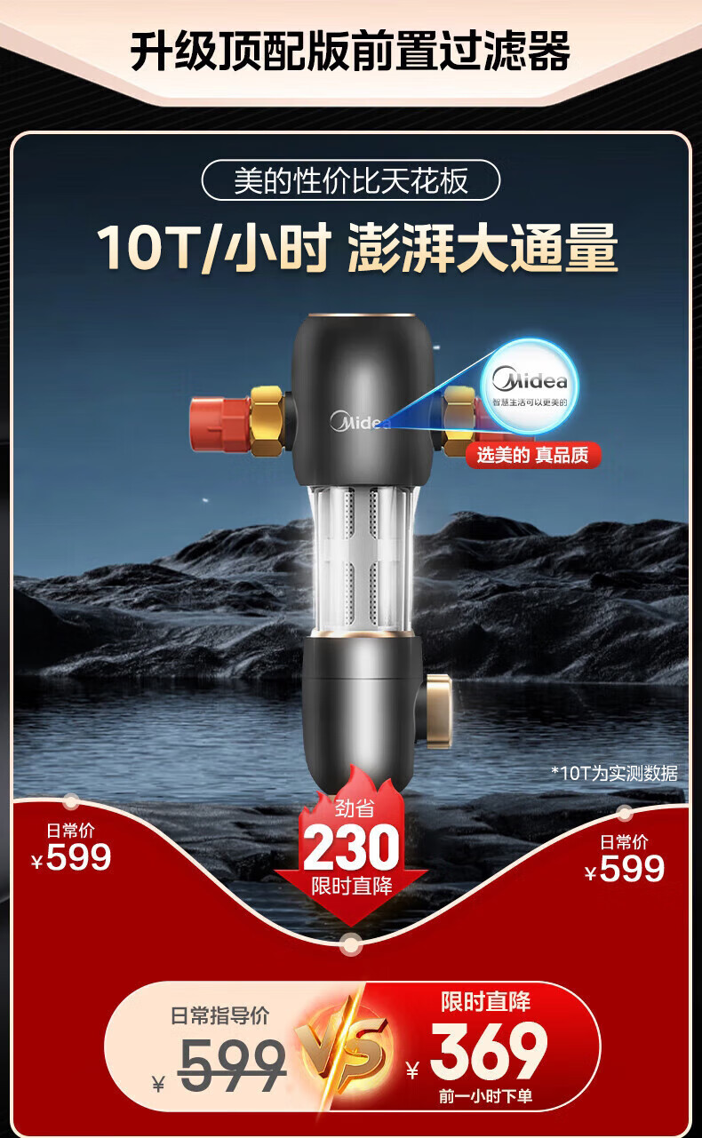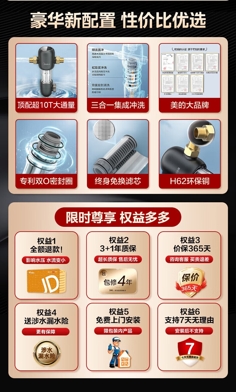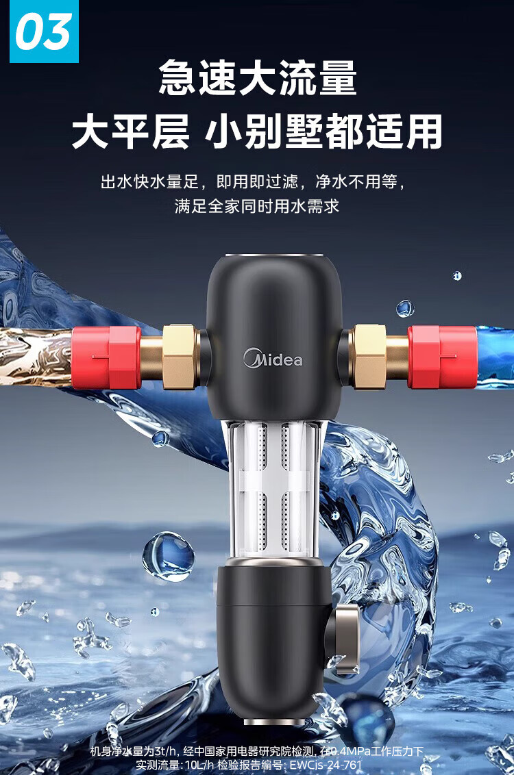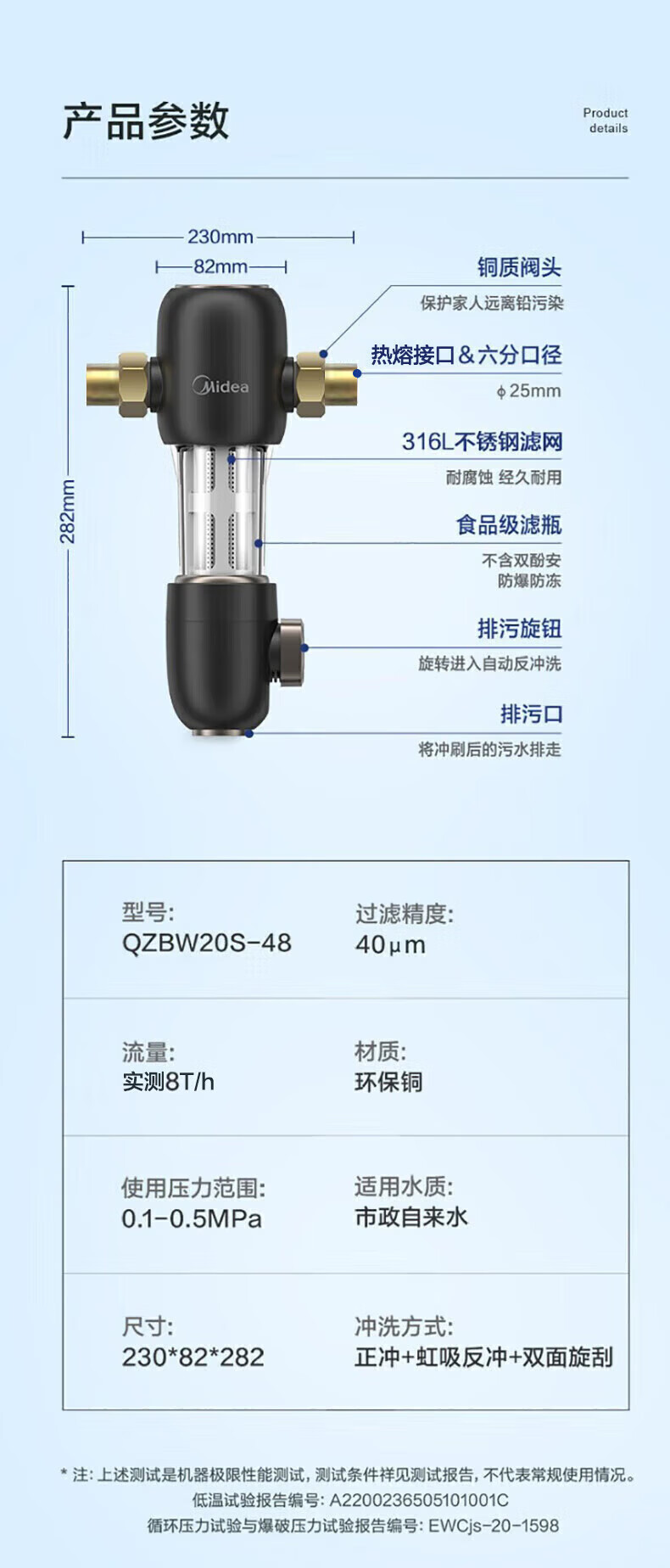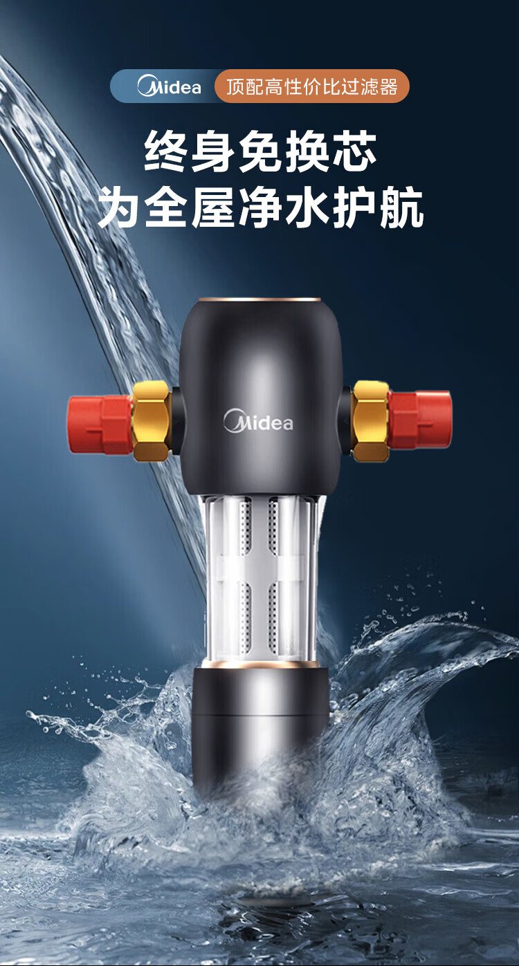美的(Midea) 前置过滤器净水器10T大通量 全屋自来水终身免换滤芯 虹吸式高压自动反冲洗 防爆QZBW20S-48前置 【性价比顶配款-10T大通量】