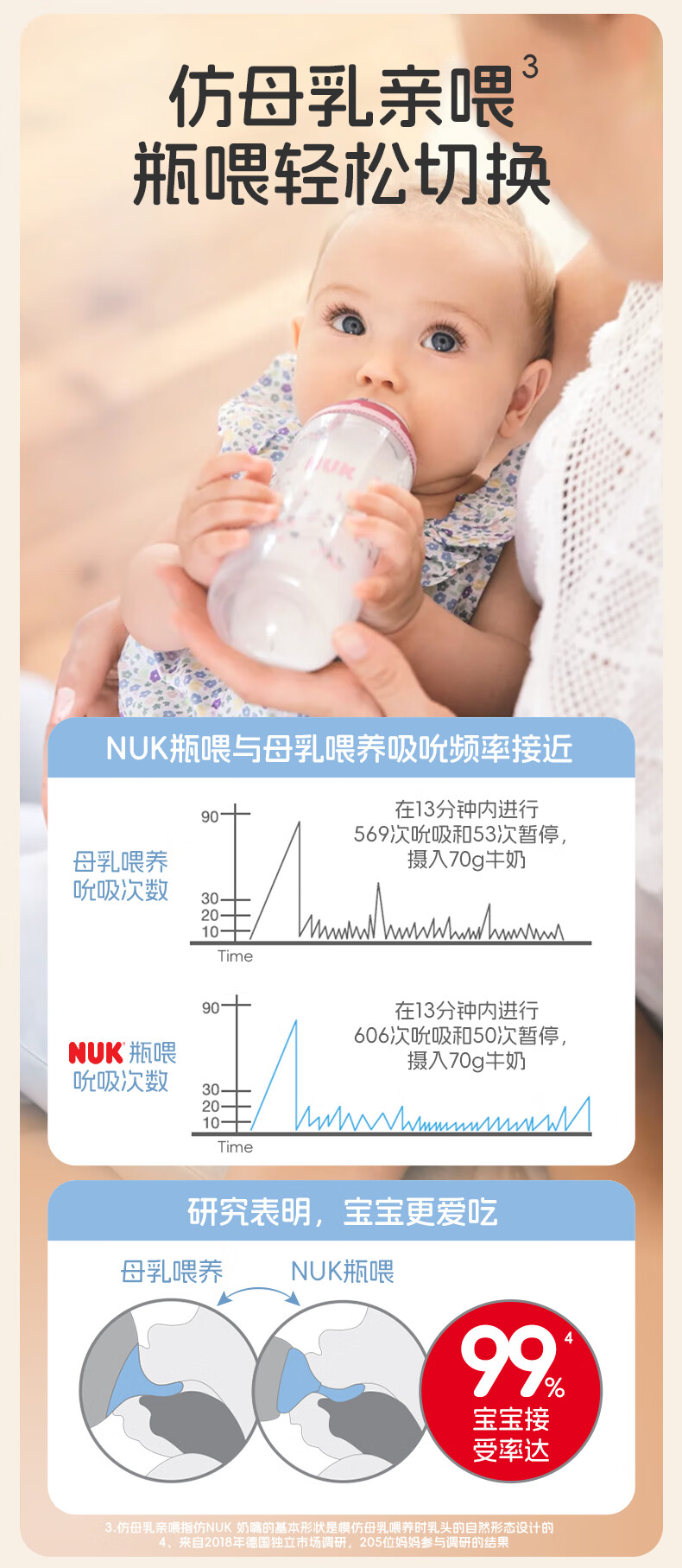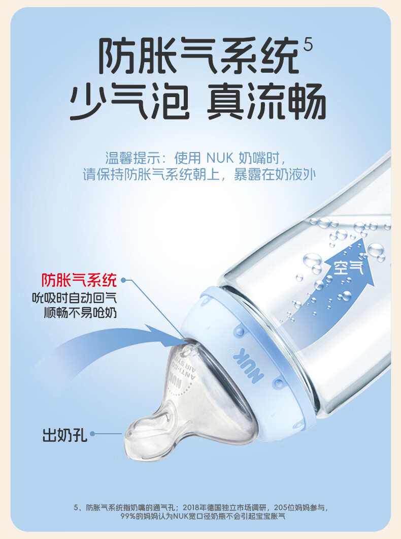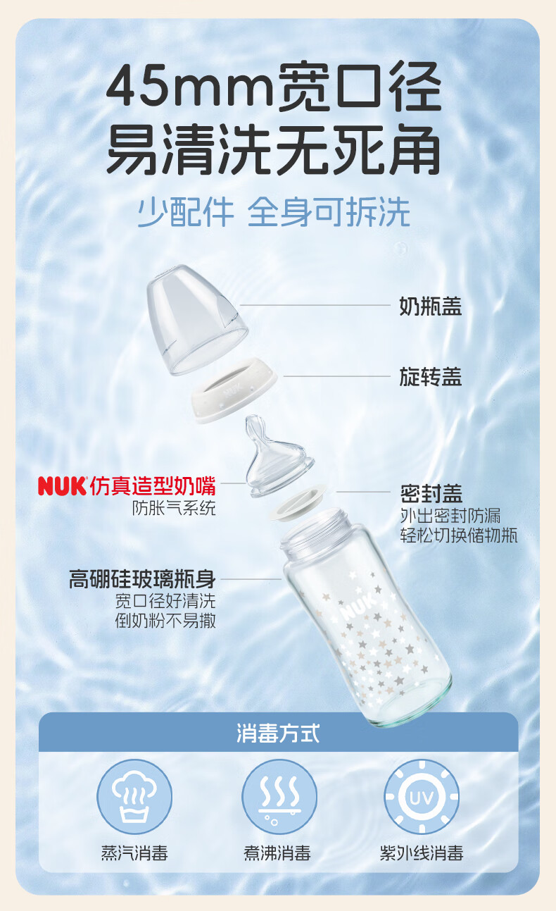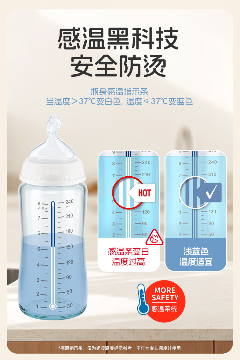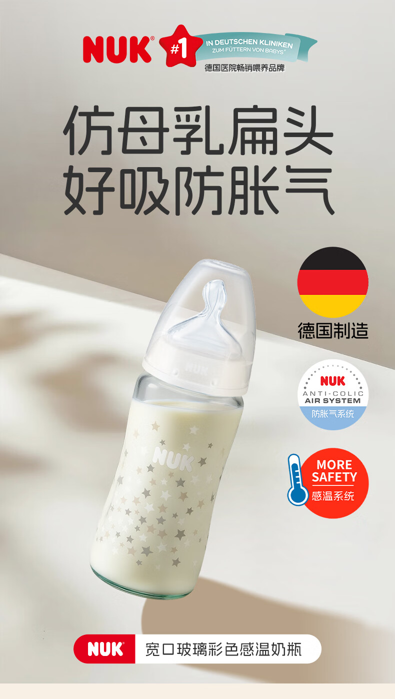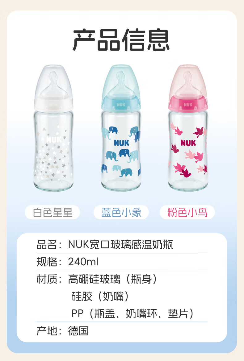 NUK德国感温宽口径宝宝粉色款带0-6个月硅胶奶嘴防胀气240ml玻璃奶瓶