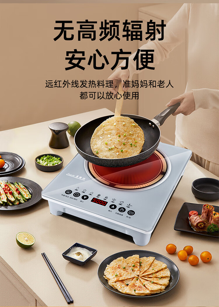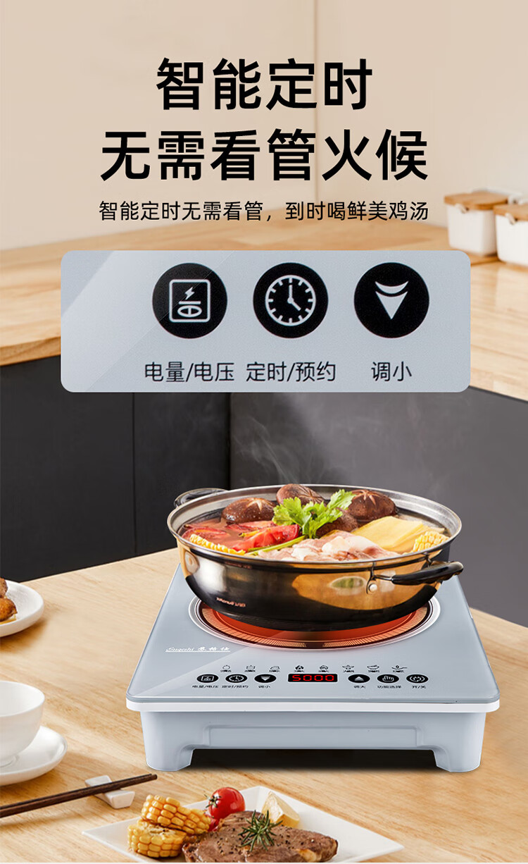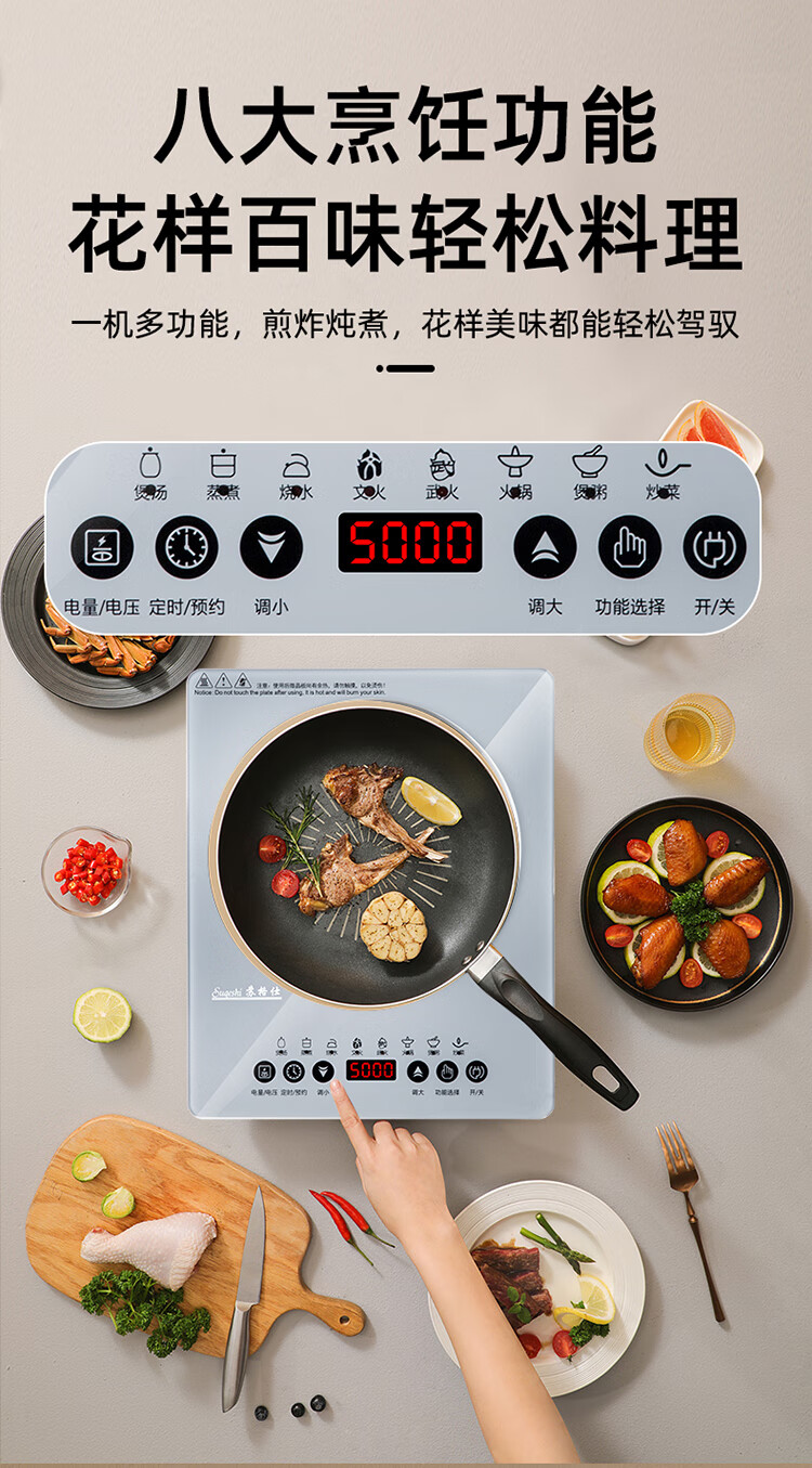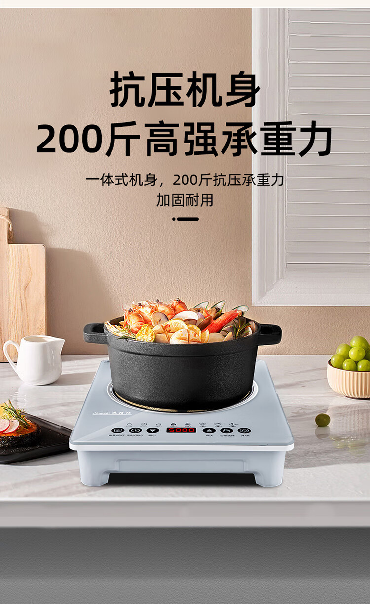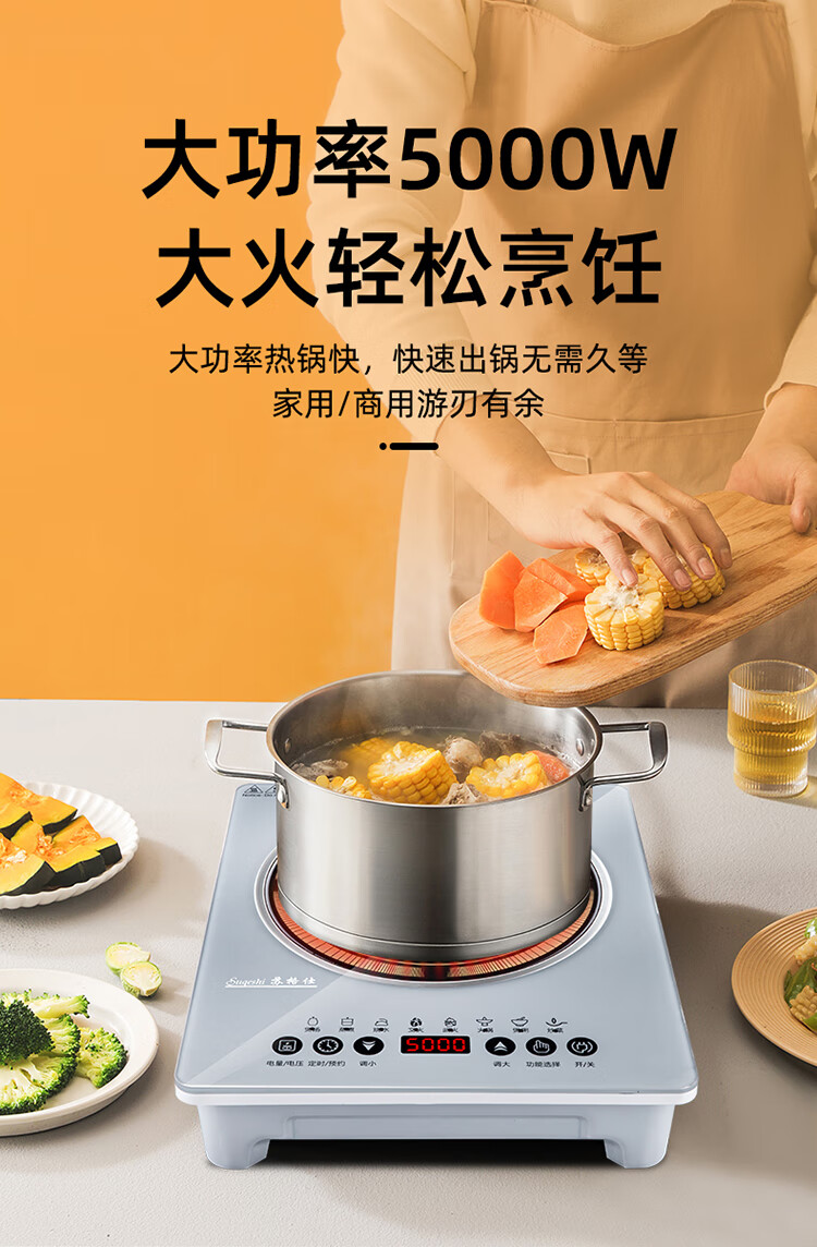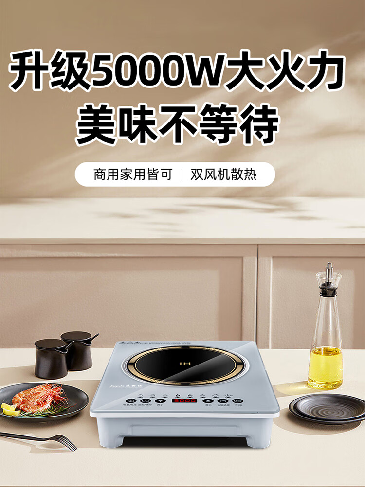 苏格仕电磁炉新款智能大功率5000W电磁灶家用商用防水无辐射猛火灶平面 灰色5000W单机+汤煲+炒锅