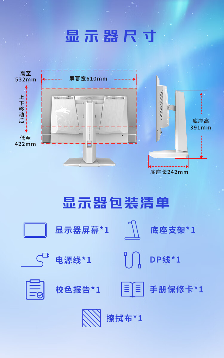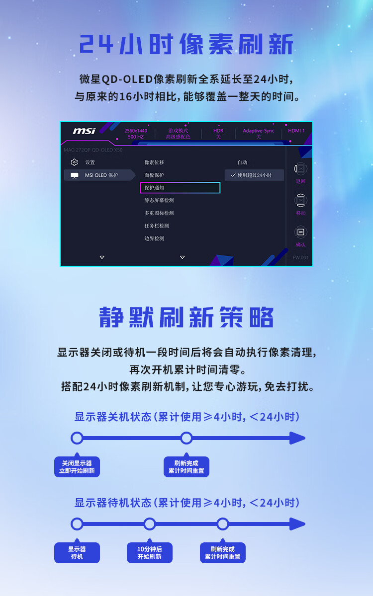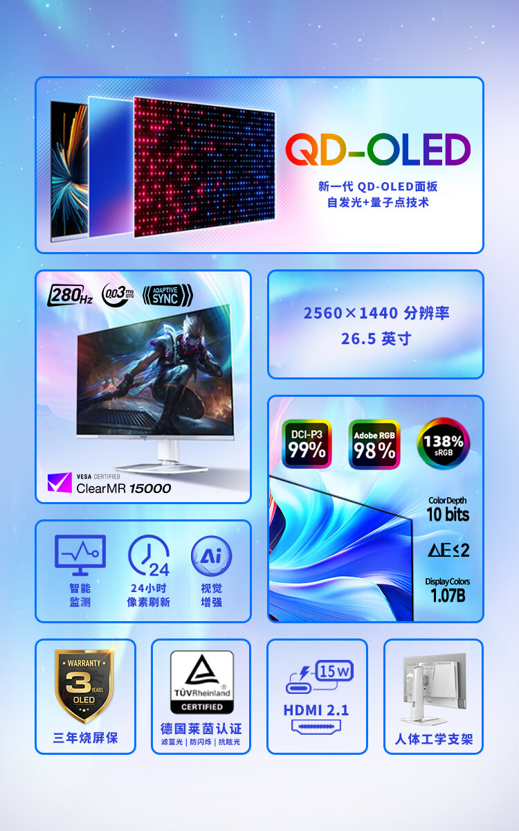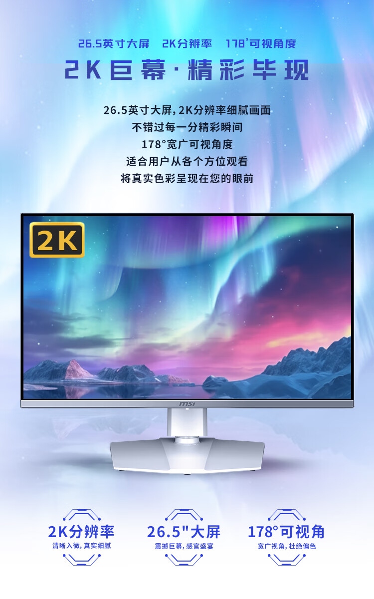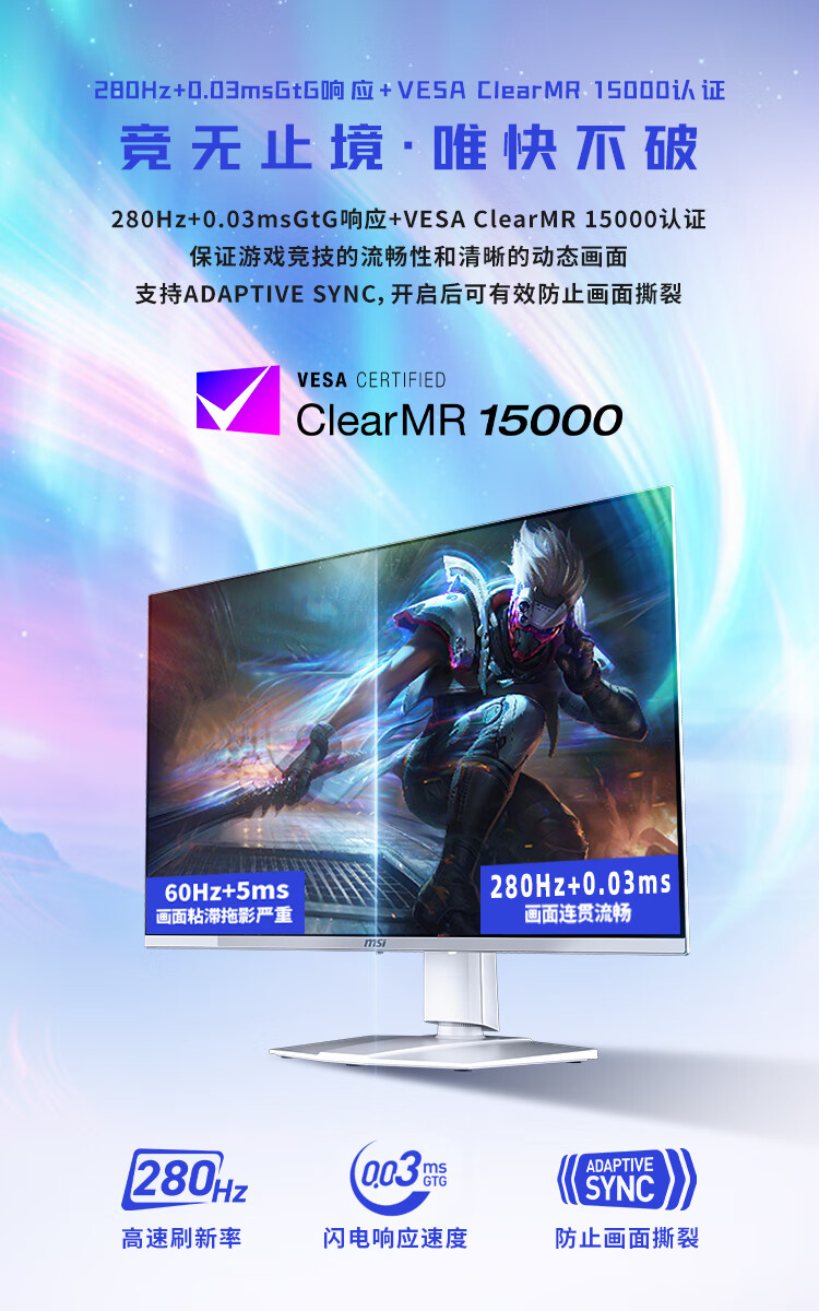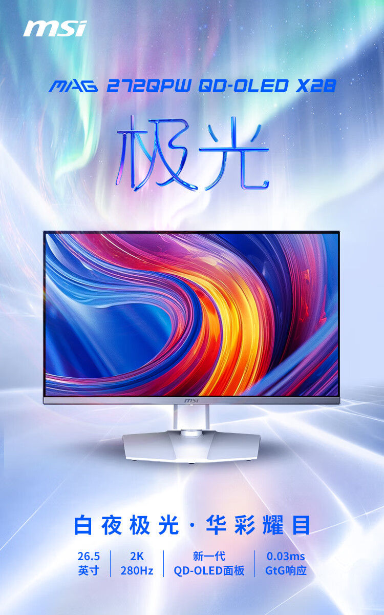 微星(MSI)27英寸2K280Hz QD-OLED显示器 0.03ms(GTG) HDR400游戏电竞显示屏MAG 272QPW QD-OLED X28极光X28
