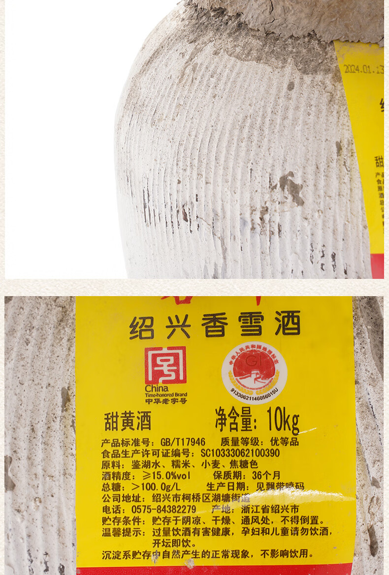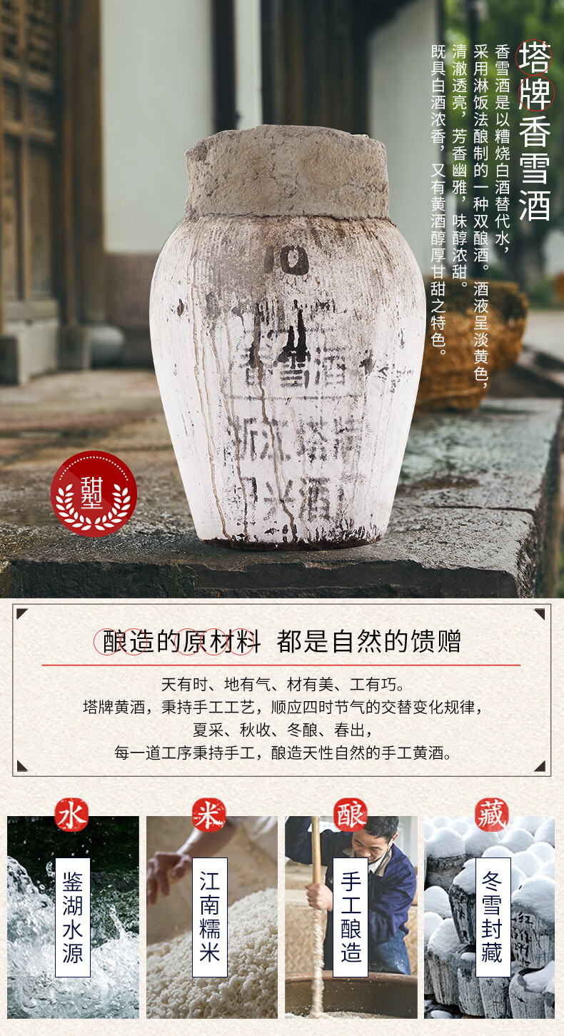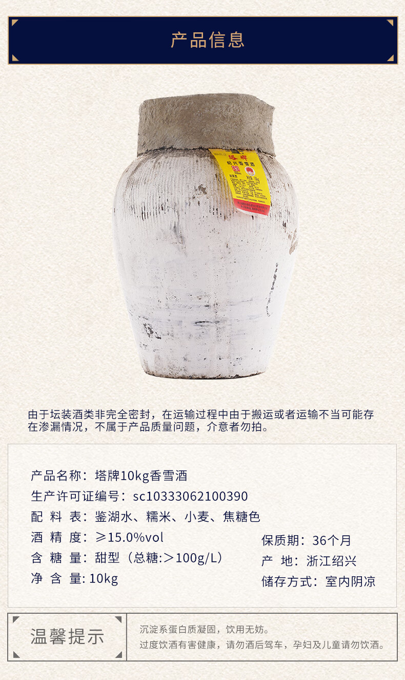 塔牌 香雪酒10KG 绍兴黄酒 甜型糯米花雕酒 10公斤大坛装 10L 1坛