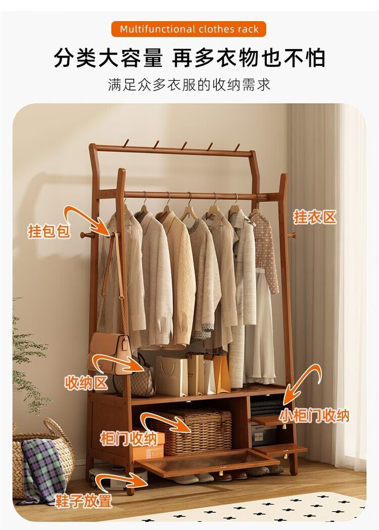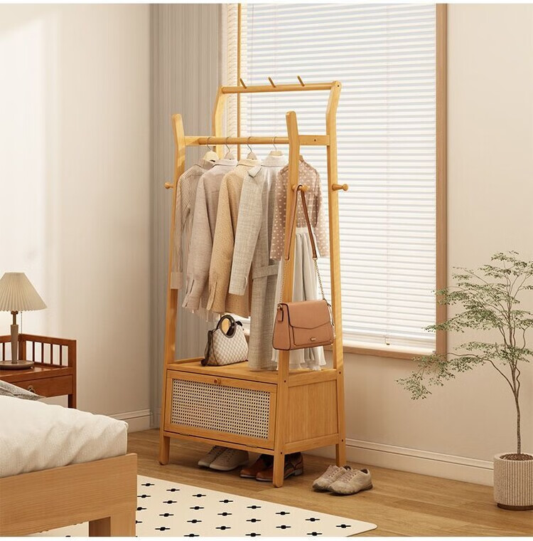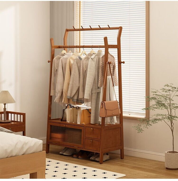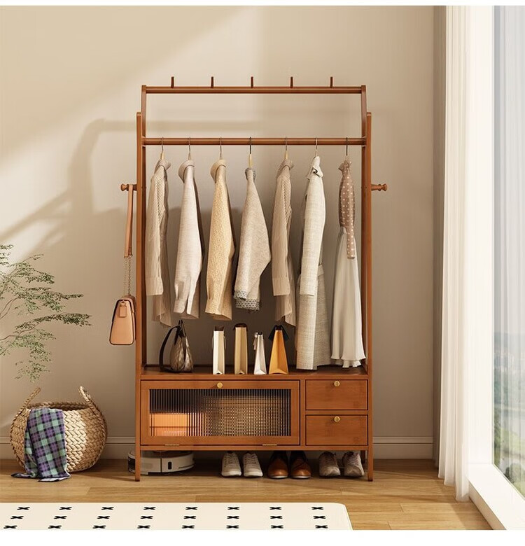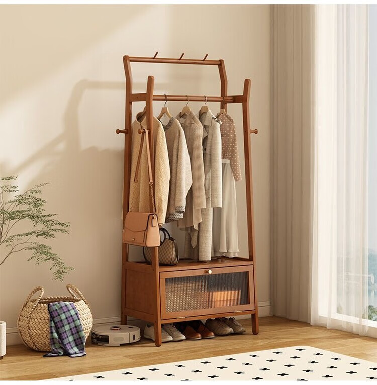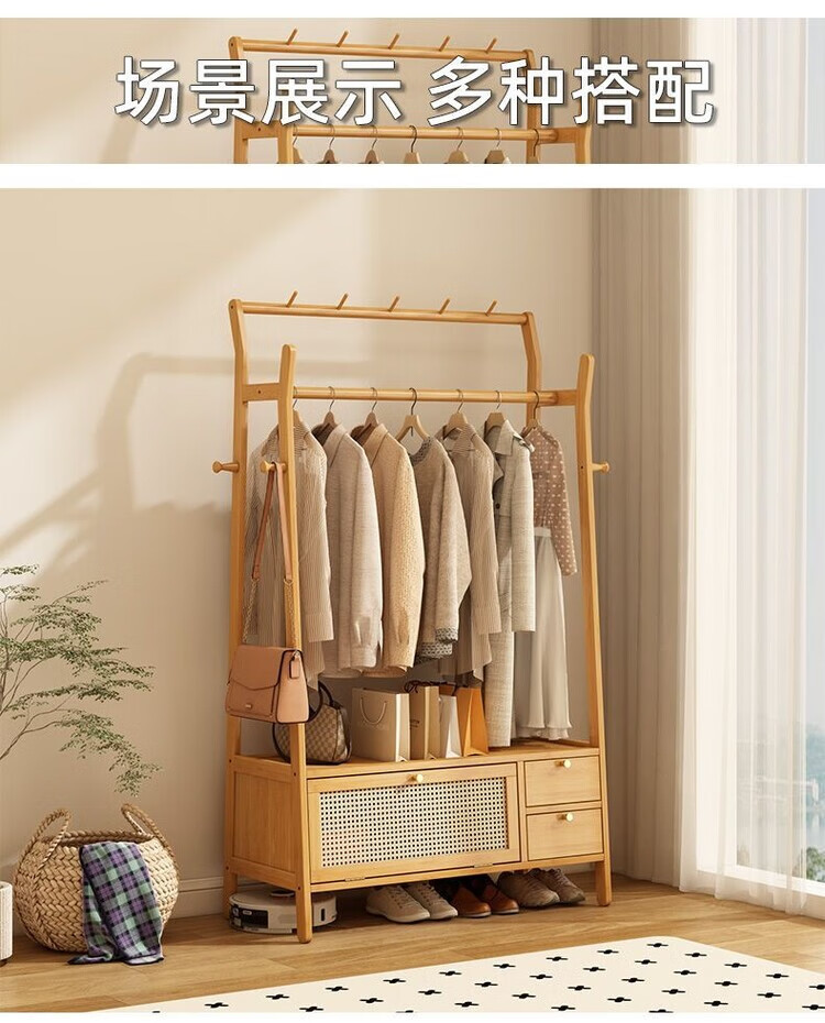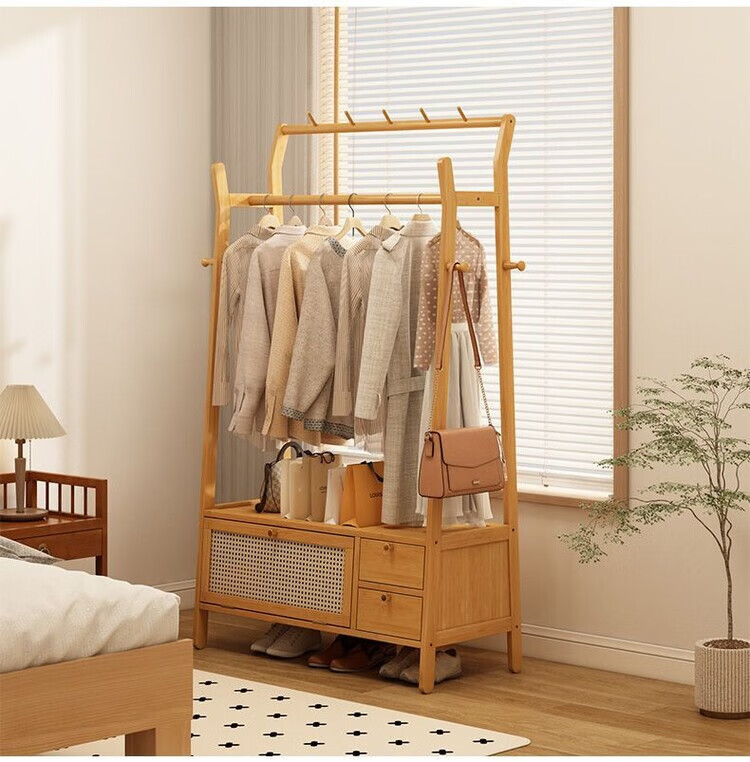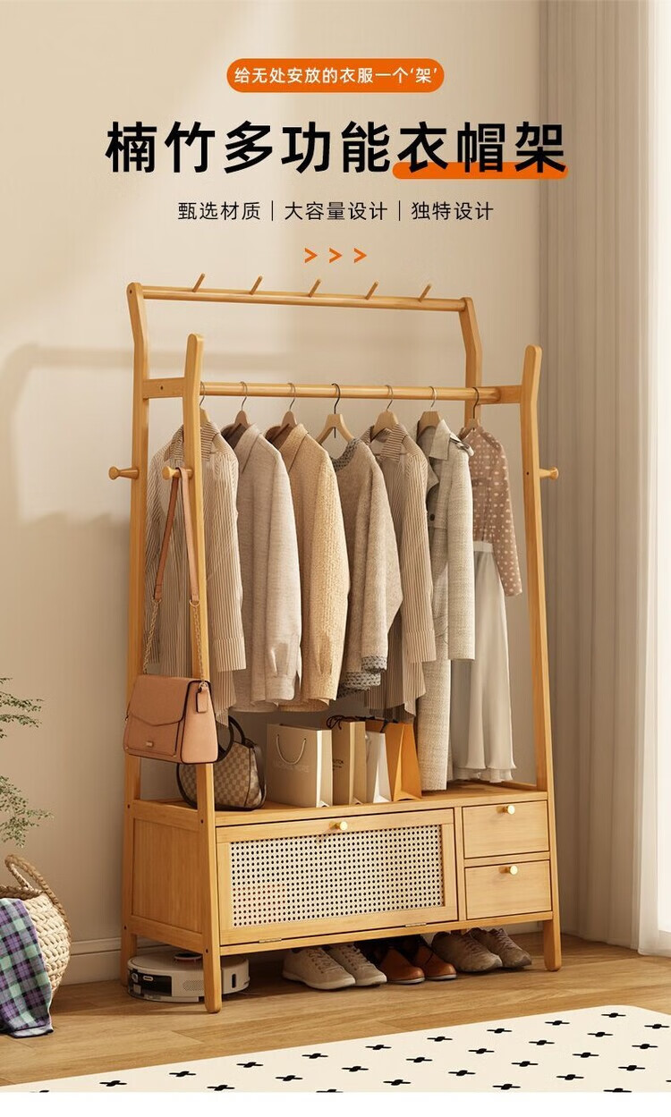 倘然之家挂衣架落地衣架楠竹立式落地卧室衣帽架衣服客厅家用轮子落地挂 【落地衣帽架+收纳柜】原木色【50款无轮】