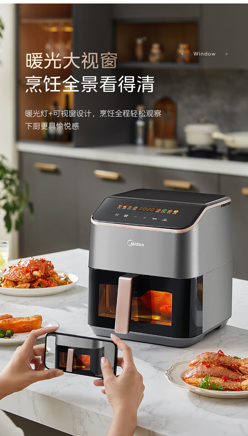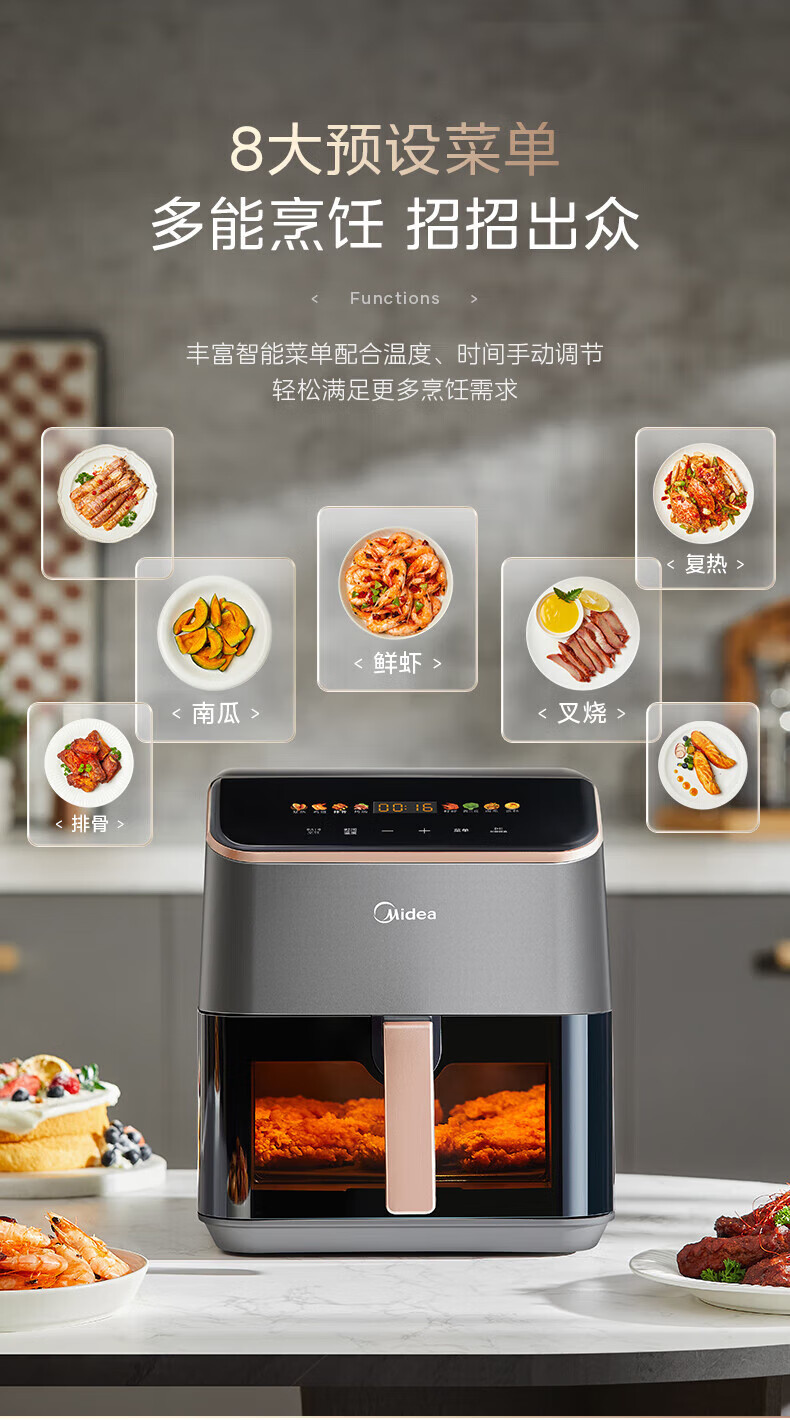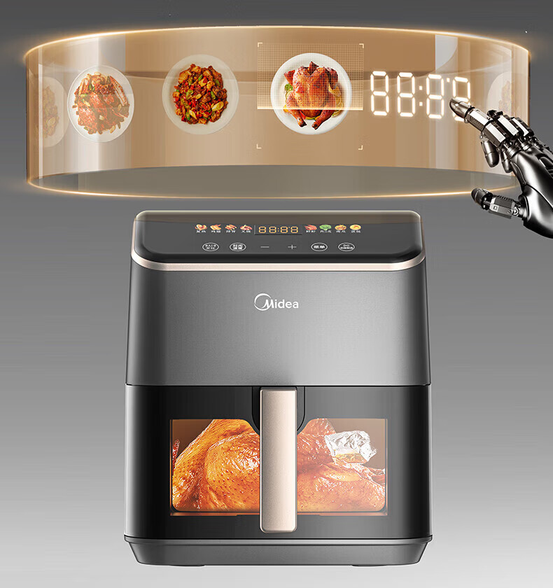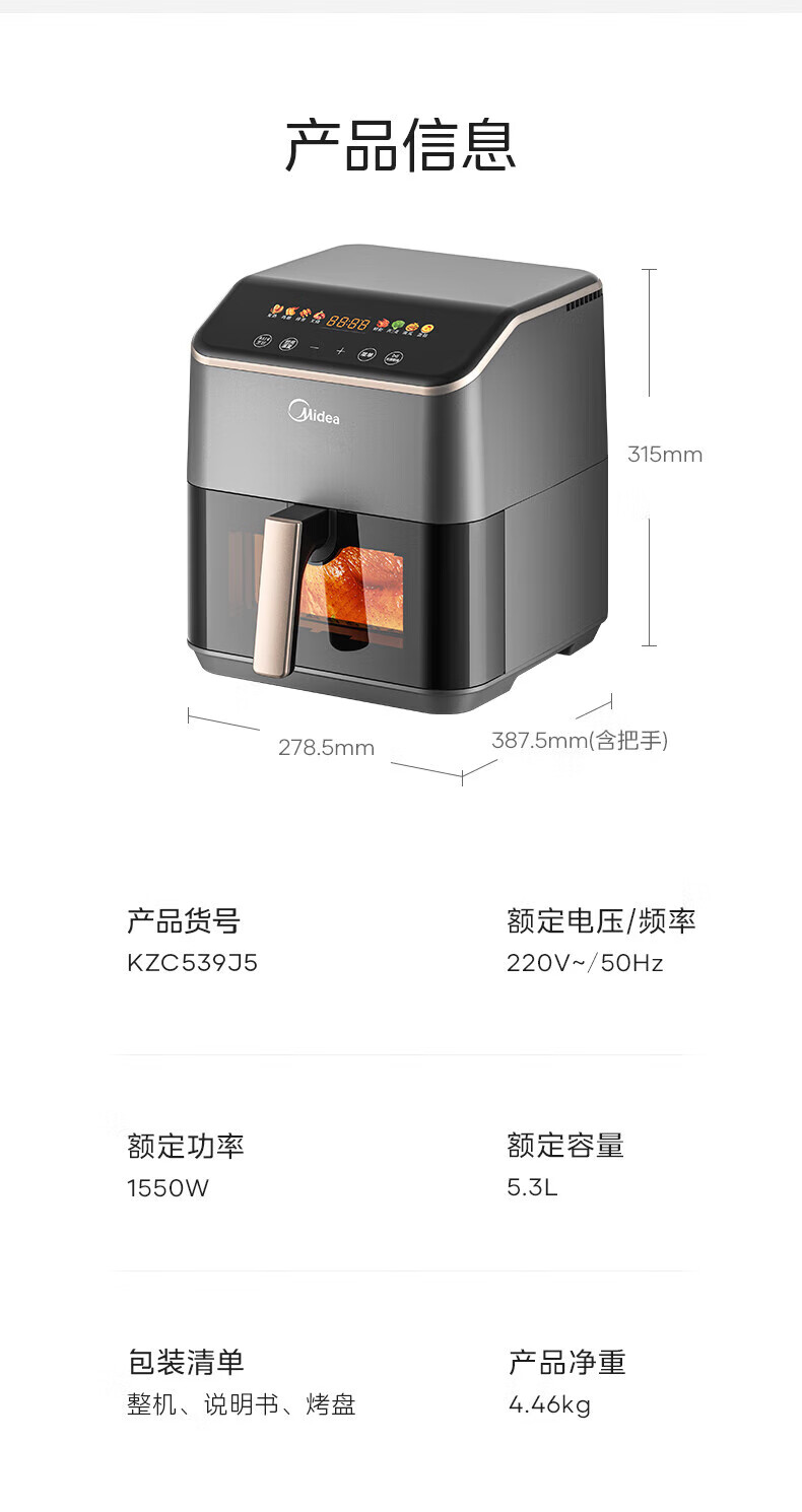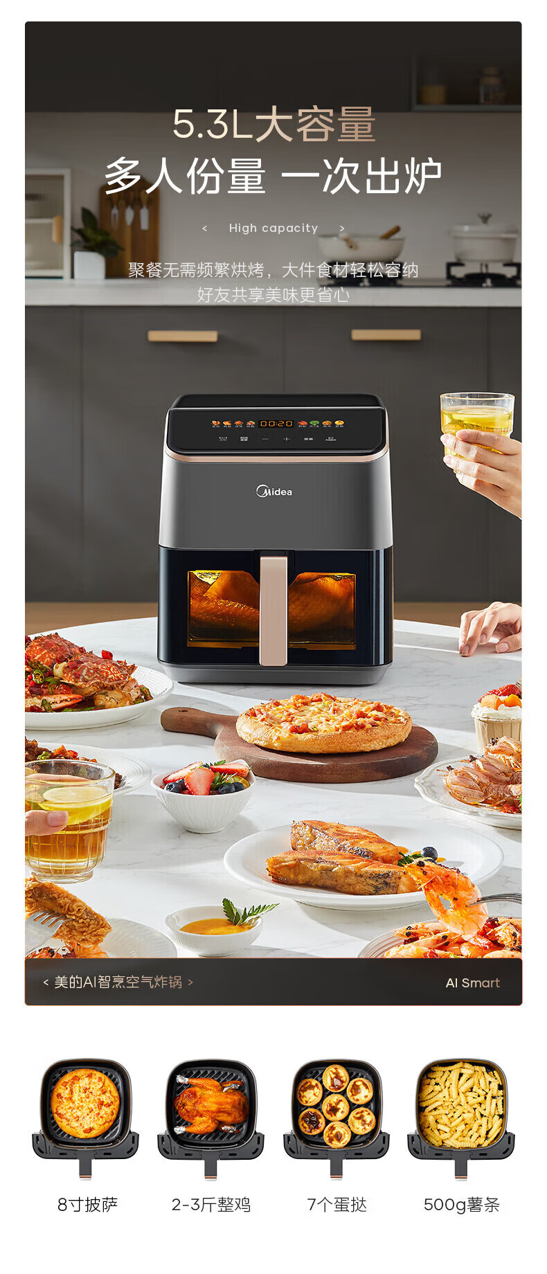 美的(Midea)空气炸锅 智能全自动免翻面 高清可视窗嫩烤家用大容量 多功能炸烤箱 空气炸锅一体机 【电子彩屏|AI智能烹饪】539J5- 5.3L