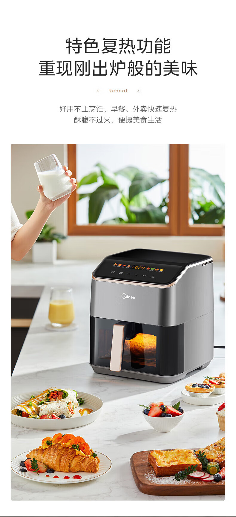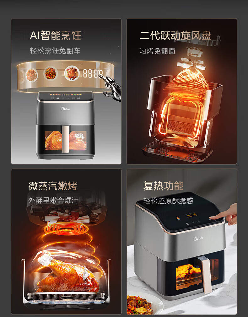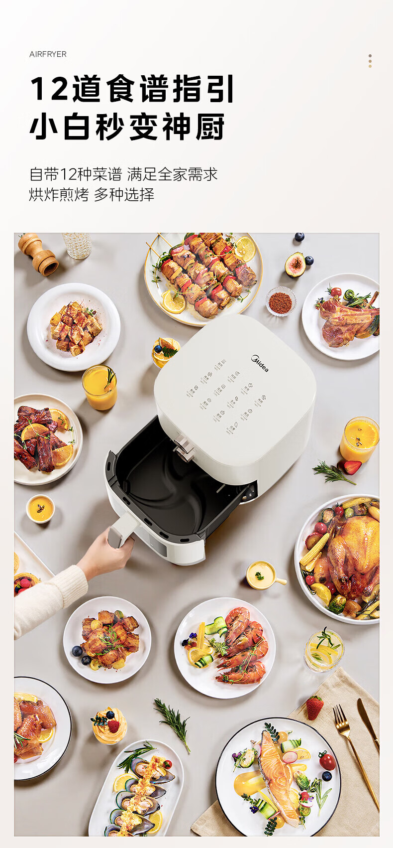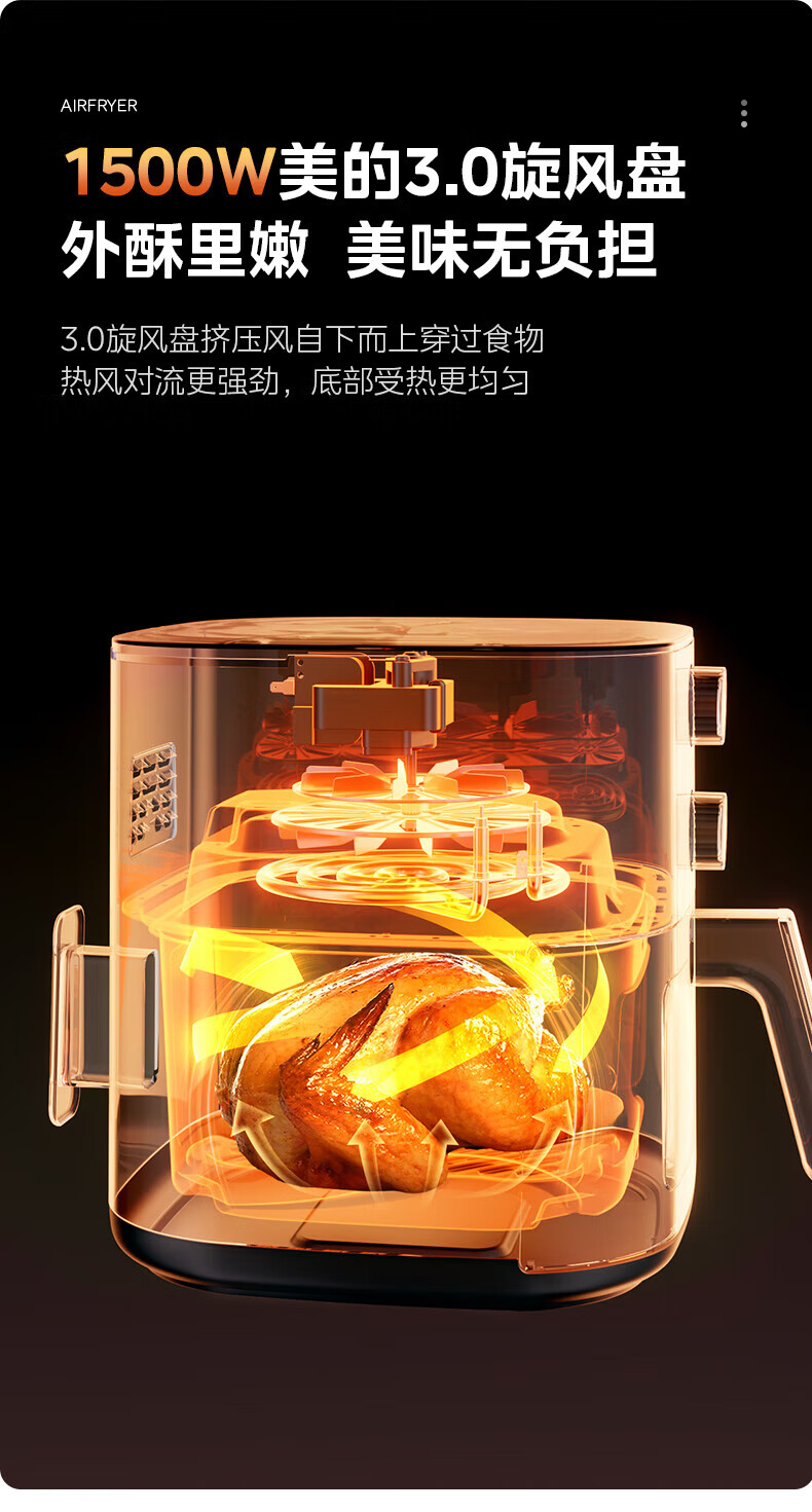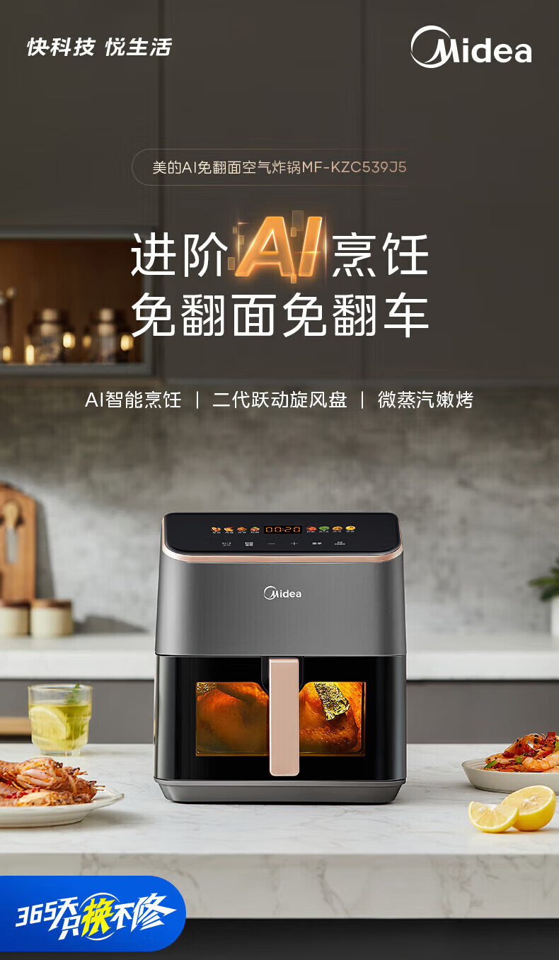 美的(Midea)空气炸锅 智能全自动免翻面 高清可视窗嫩烤家用大容量 多功能炸烤箱 空气炸锅一体机 【电子彩屏|AI智能烹饪】539J5- 5.3L
