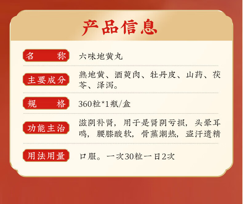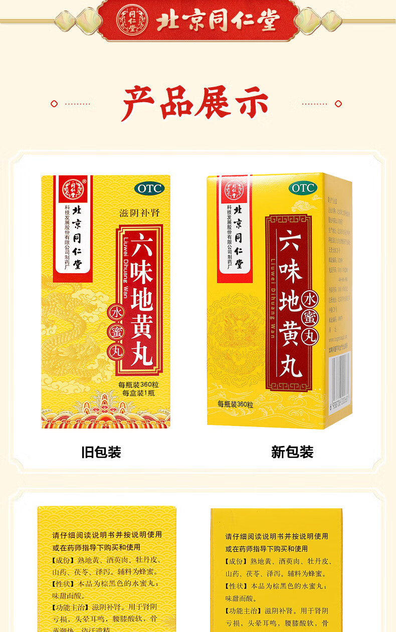 北京同仁堂 六味地黄丸(水蜜丸)360丸 本品用于肾阴亏损 头晕耳鸣 腰膝酸软 骨蒸潮热 盗汗遗精