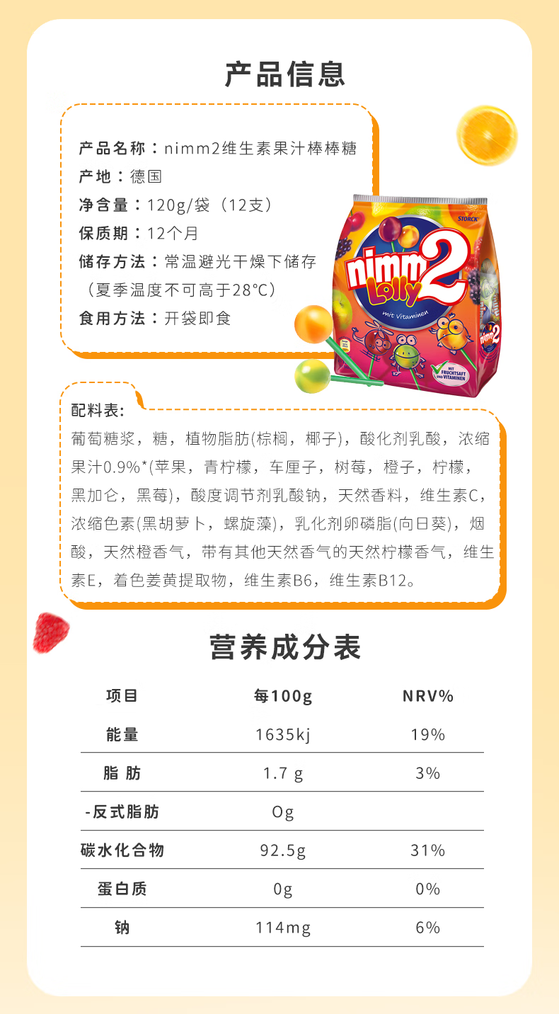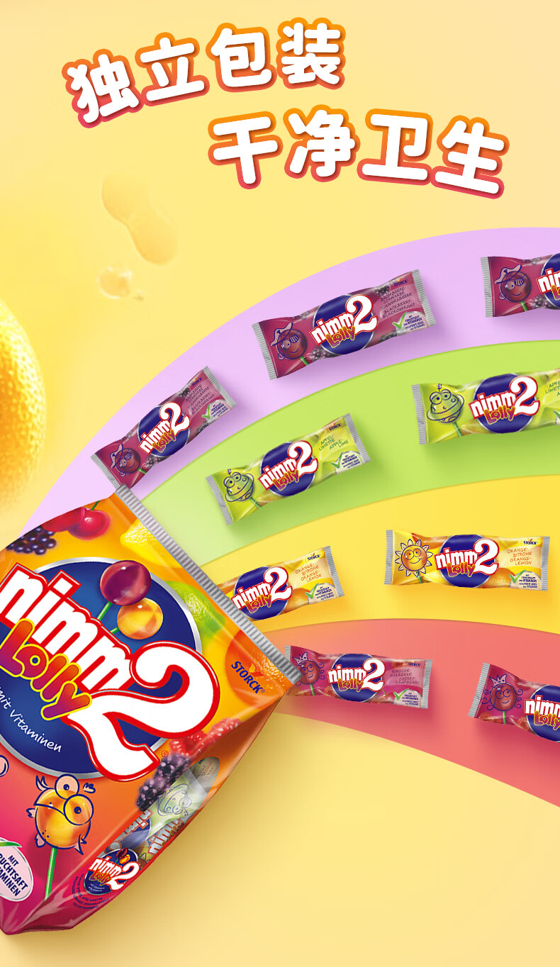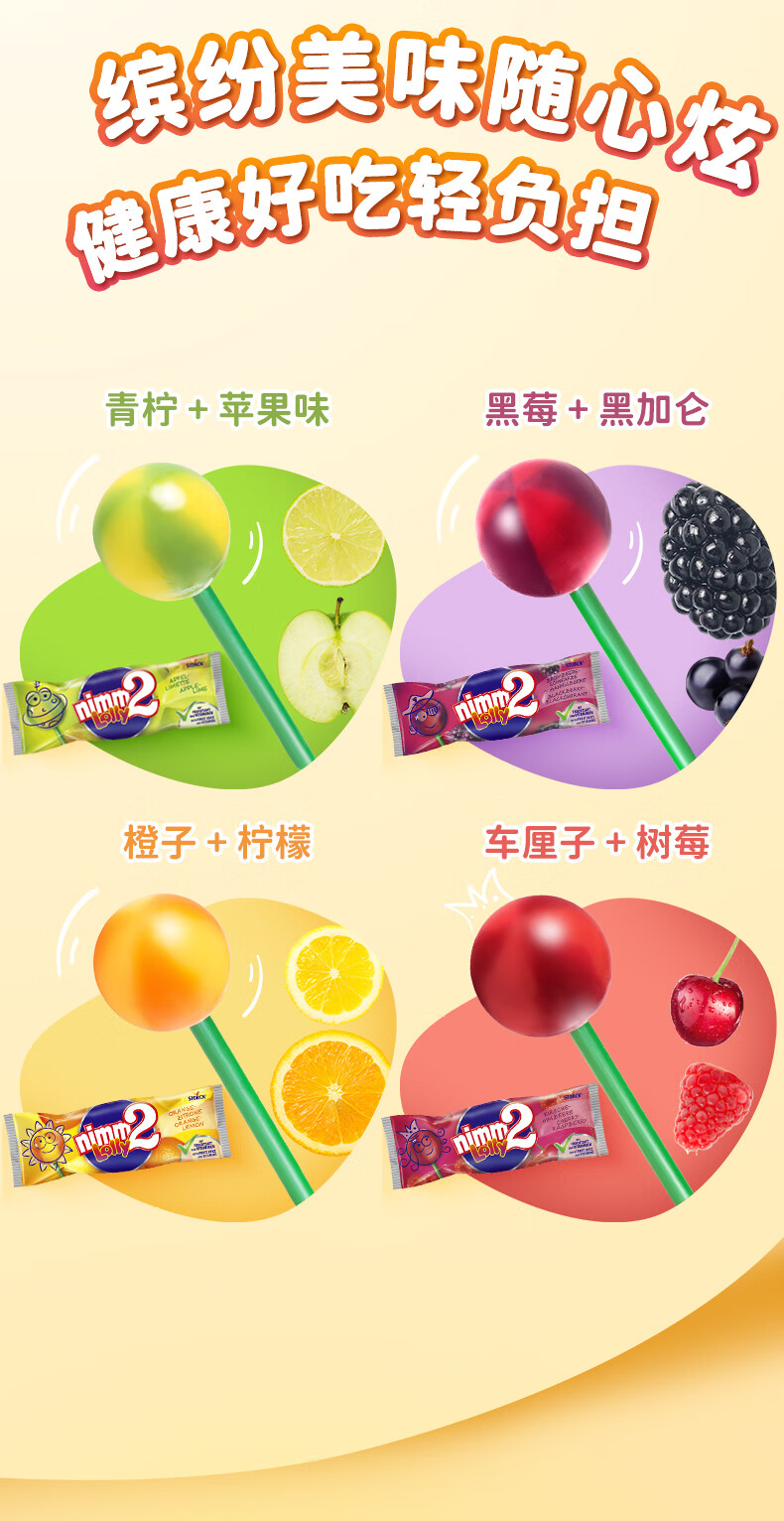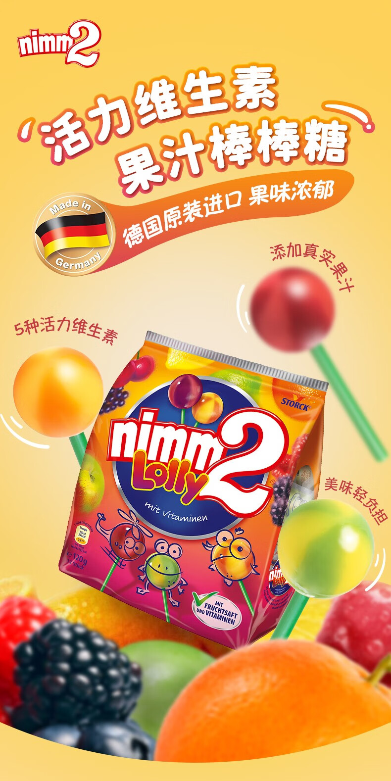二宝(Nimm2)德国原装进口果汁棒棒糖12支120g维生素糖果儿童零食聚会圣诞礼物