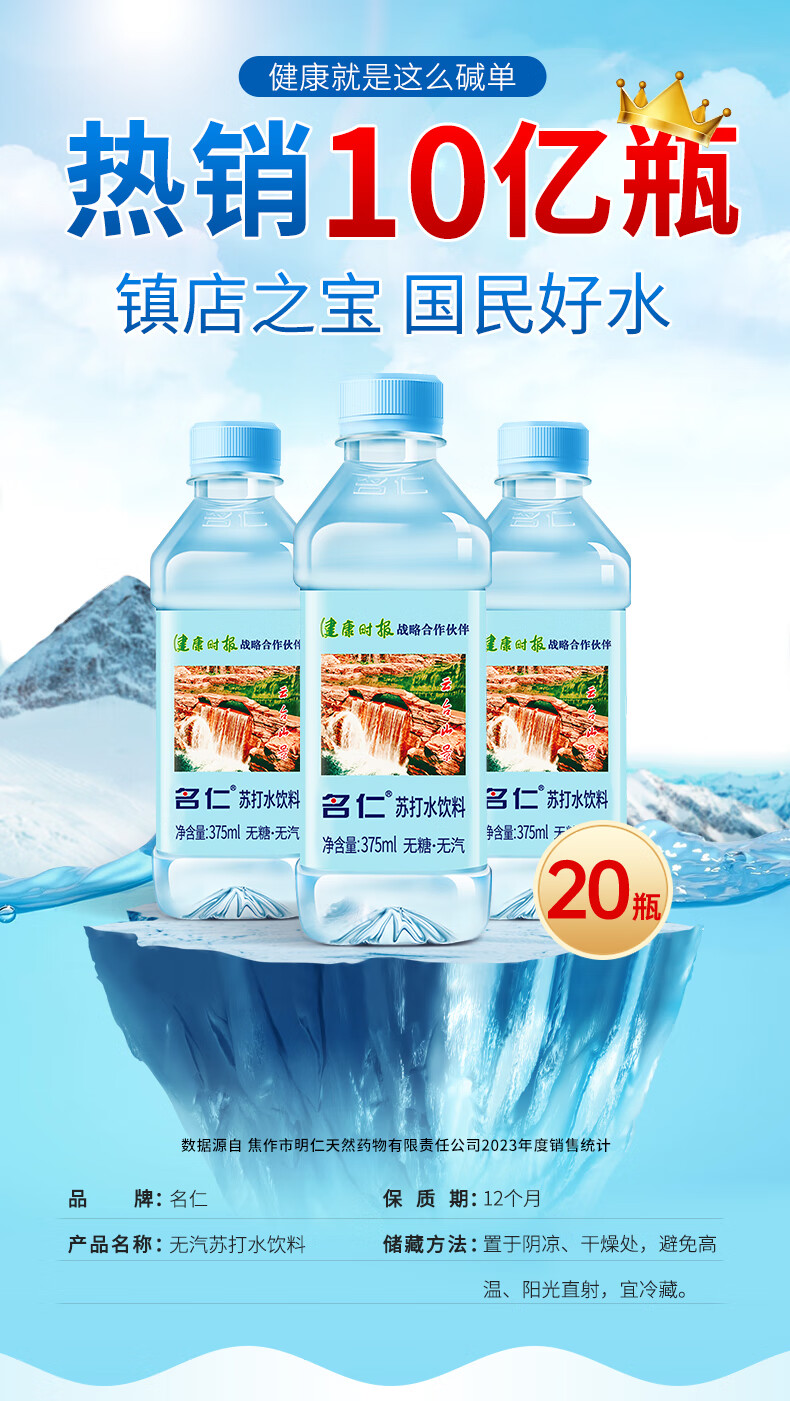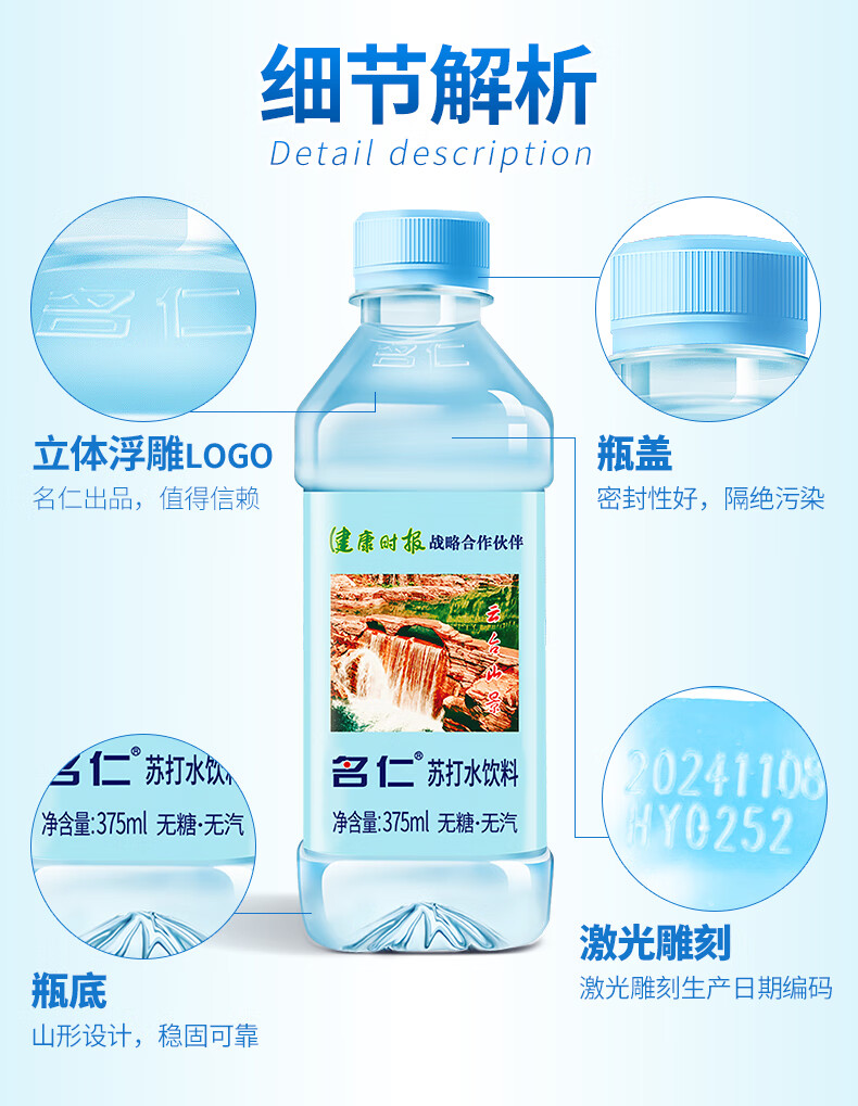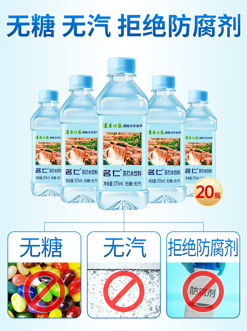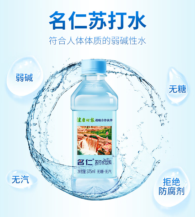 名仁苏打水饮料 无糖无汽弱碱性水 375ml*20瓶 整箱