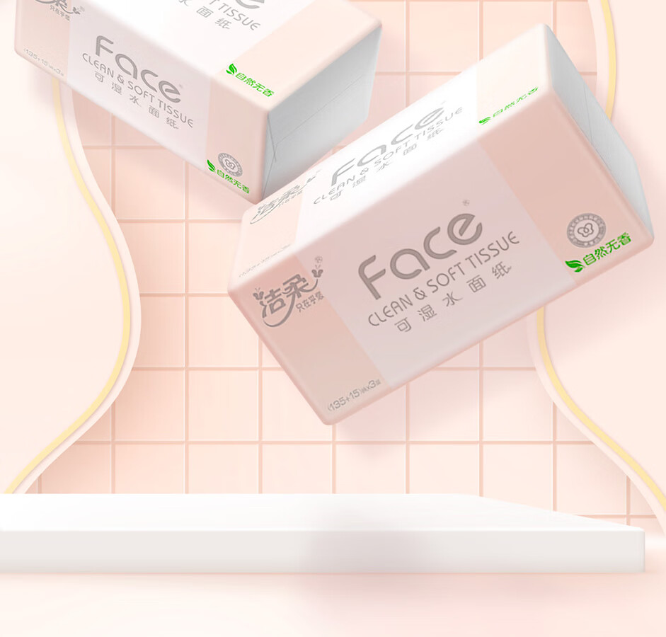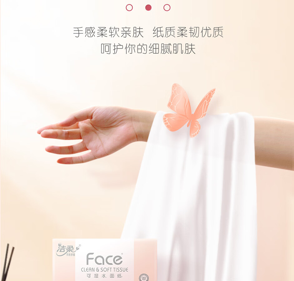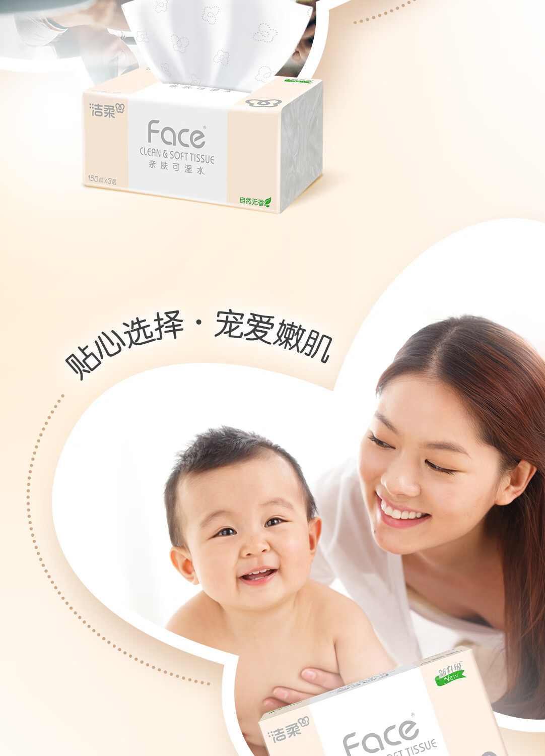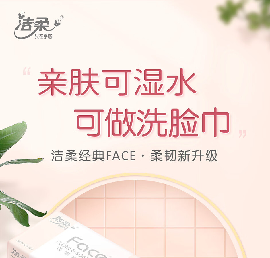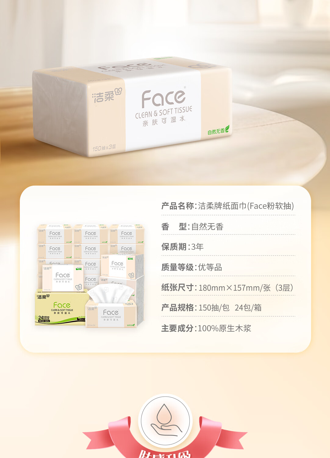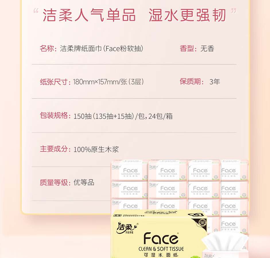 洁柔抽纸 粉face柔韧3层150抽*24包纸巾 可湿水面巾纸M码 整箱卫生纸