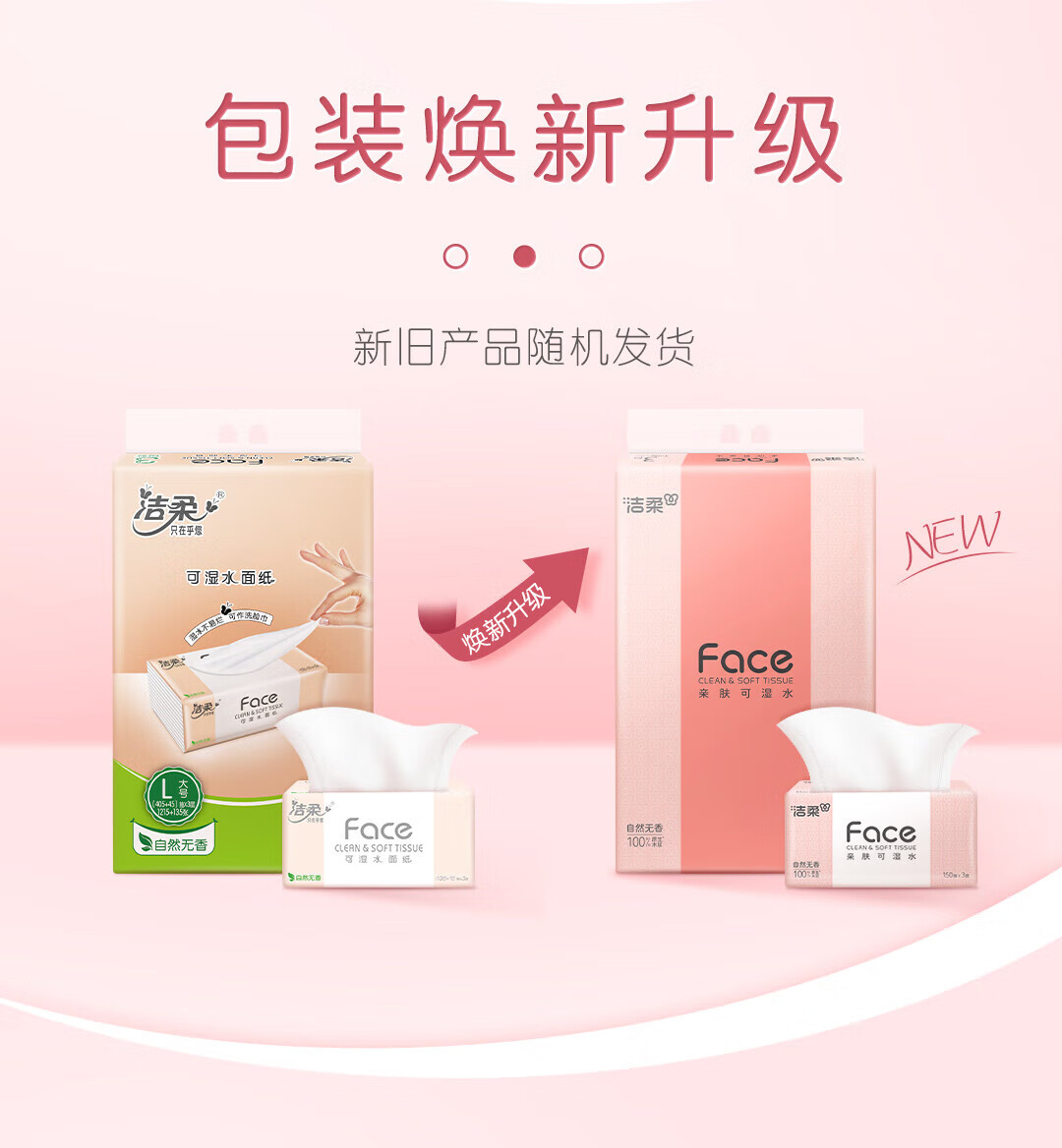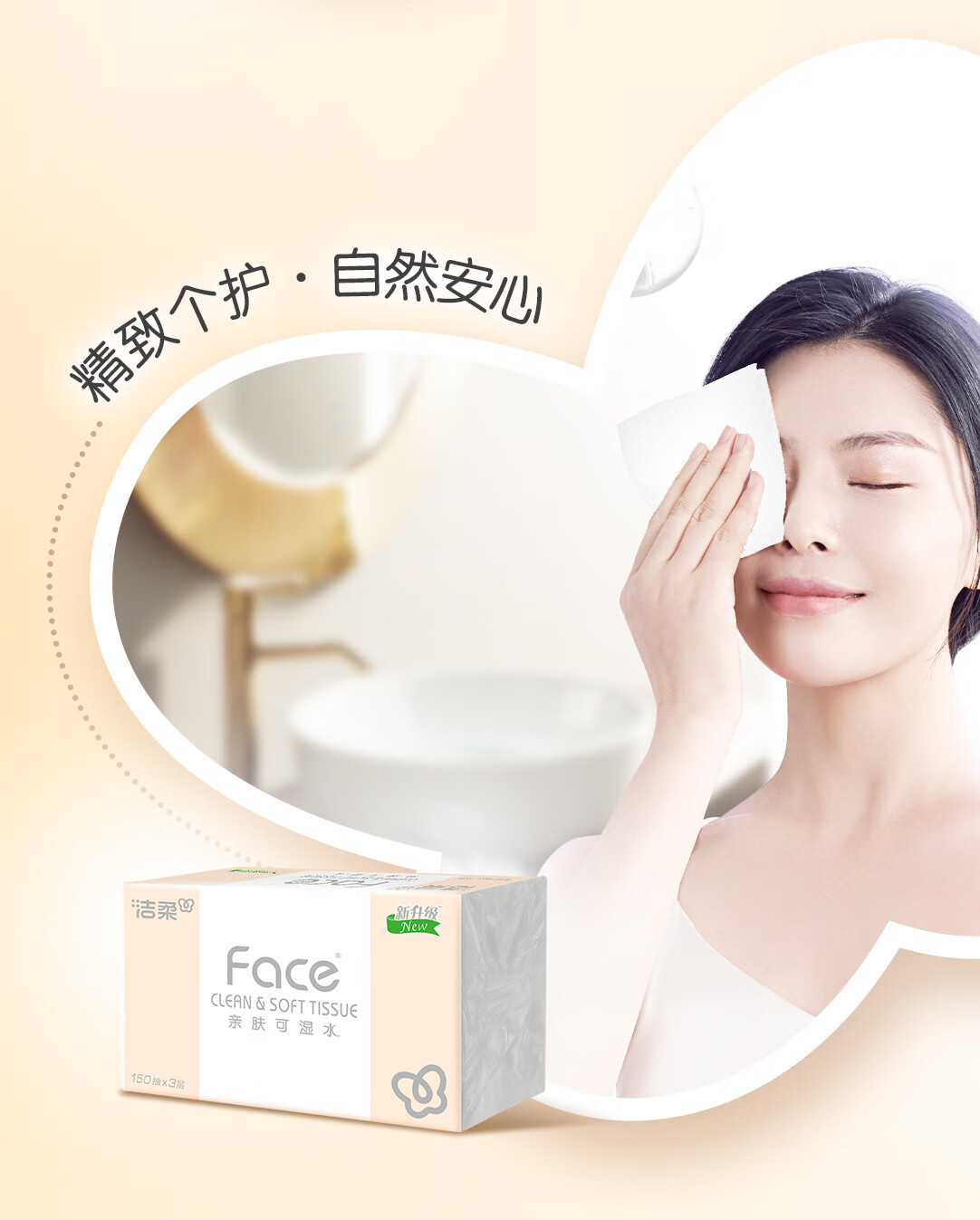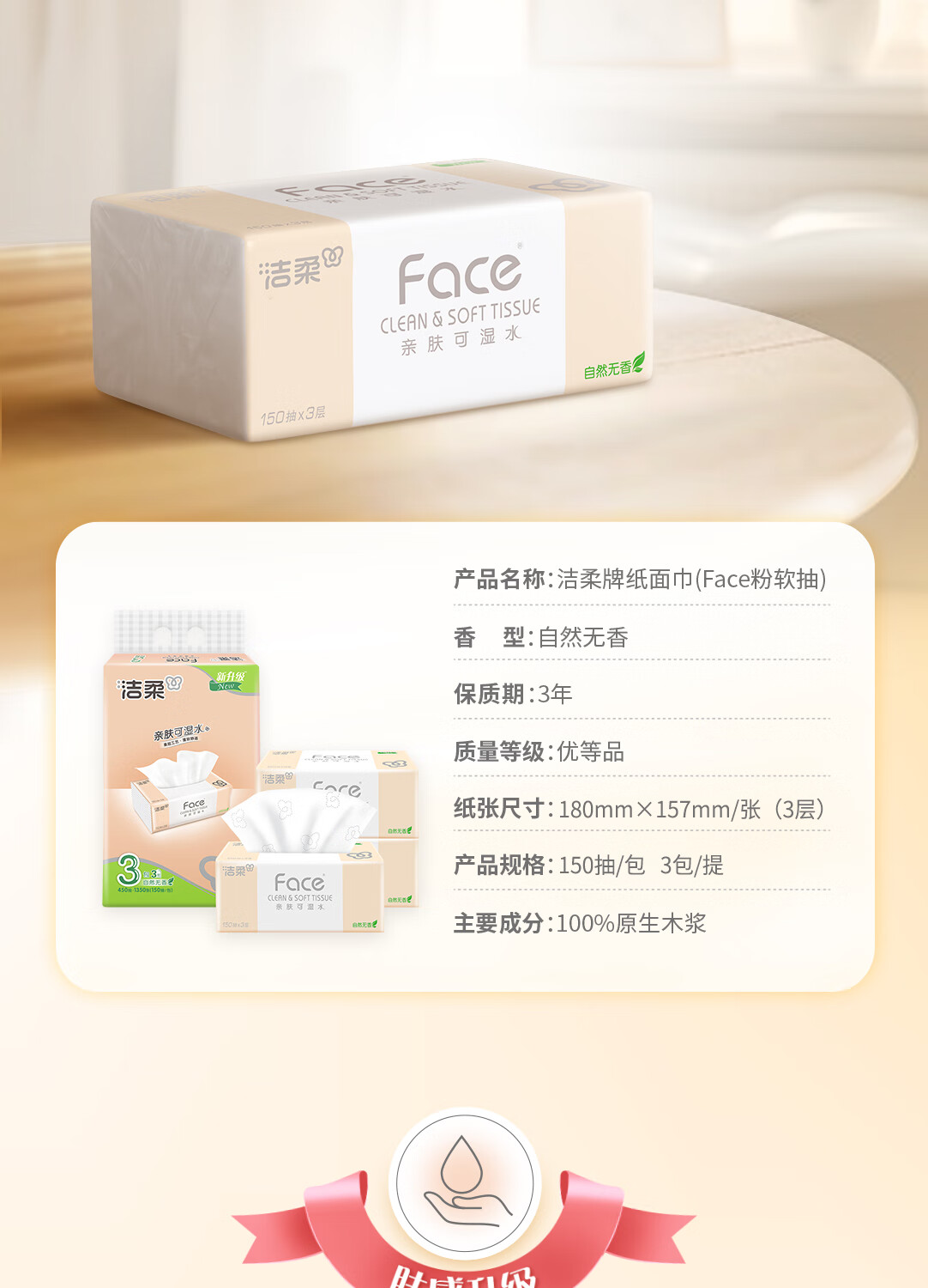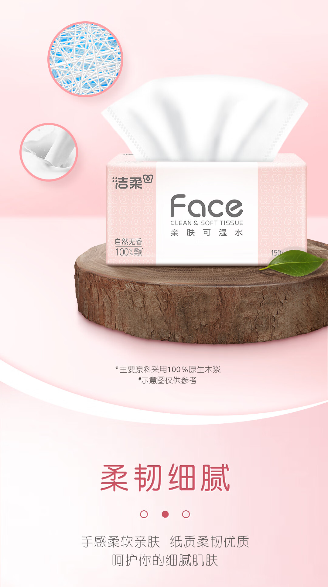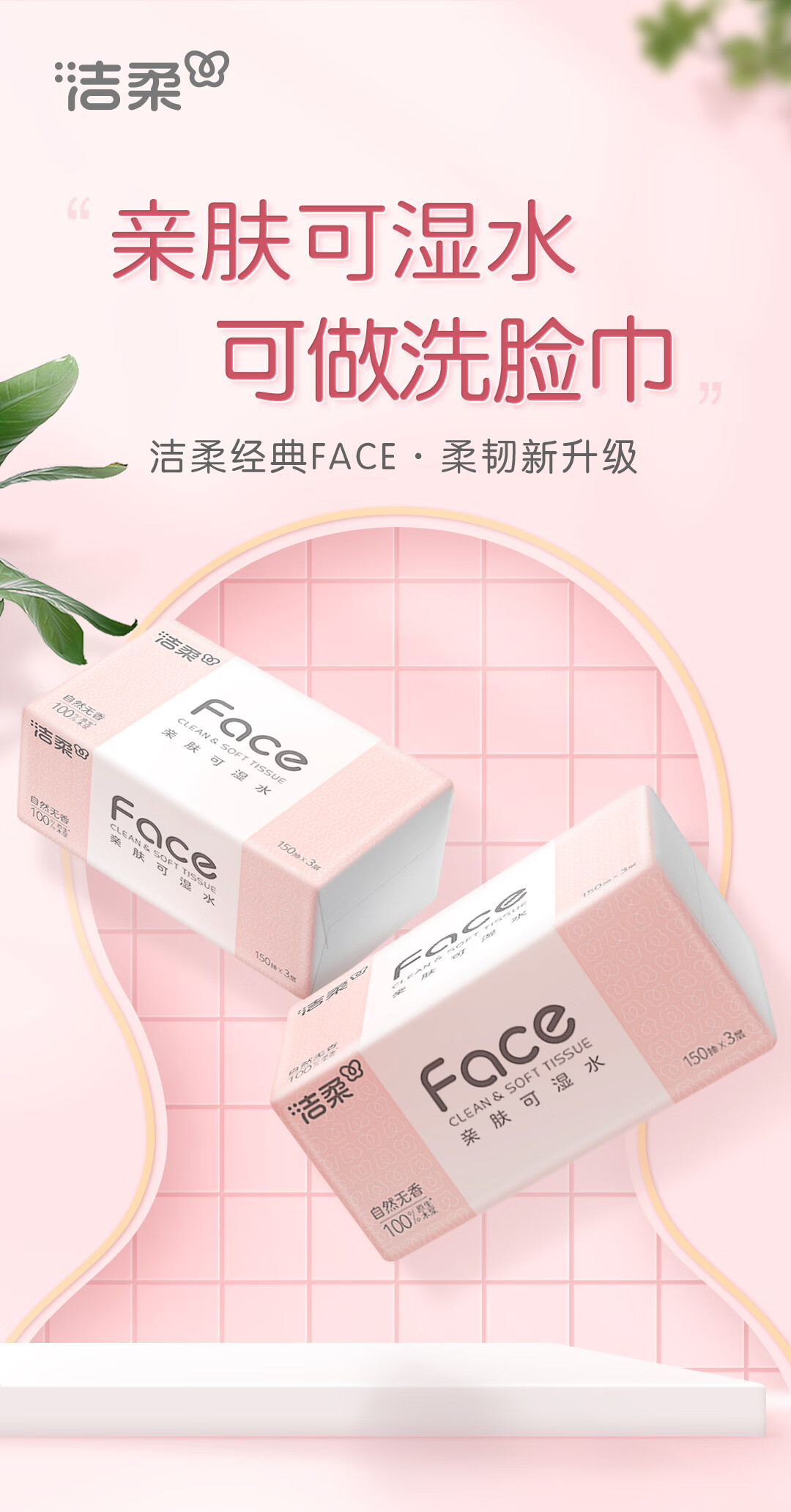 洁柔抽纸 粉Face可湿水3层150抽*3包 校园必备 大规格M码面巾纸