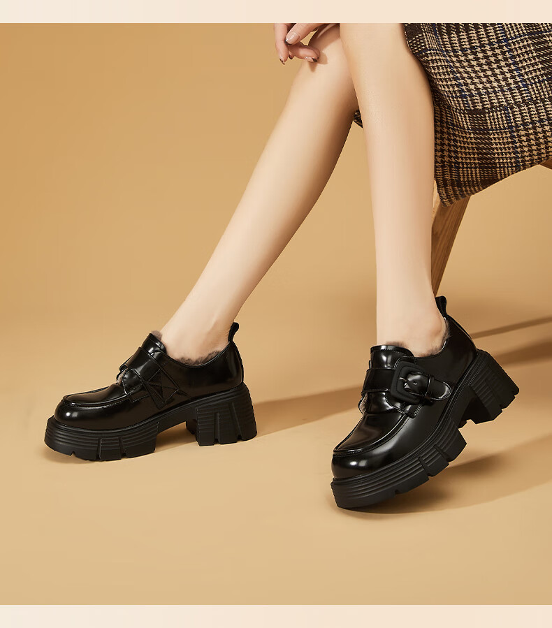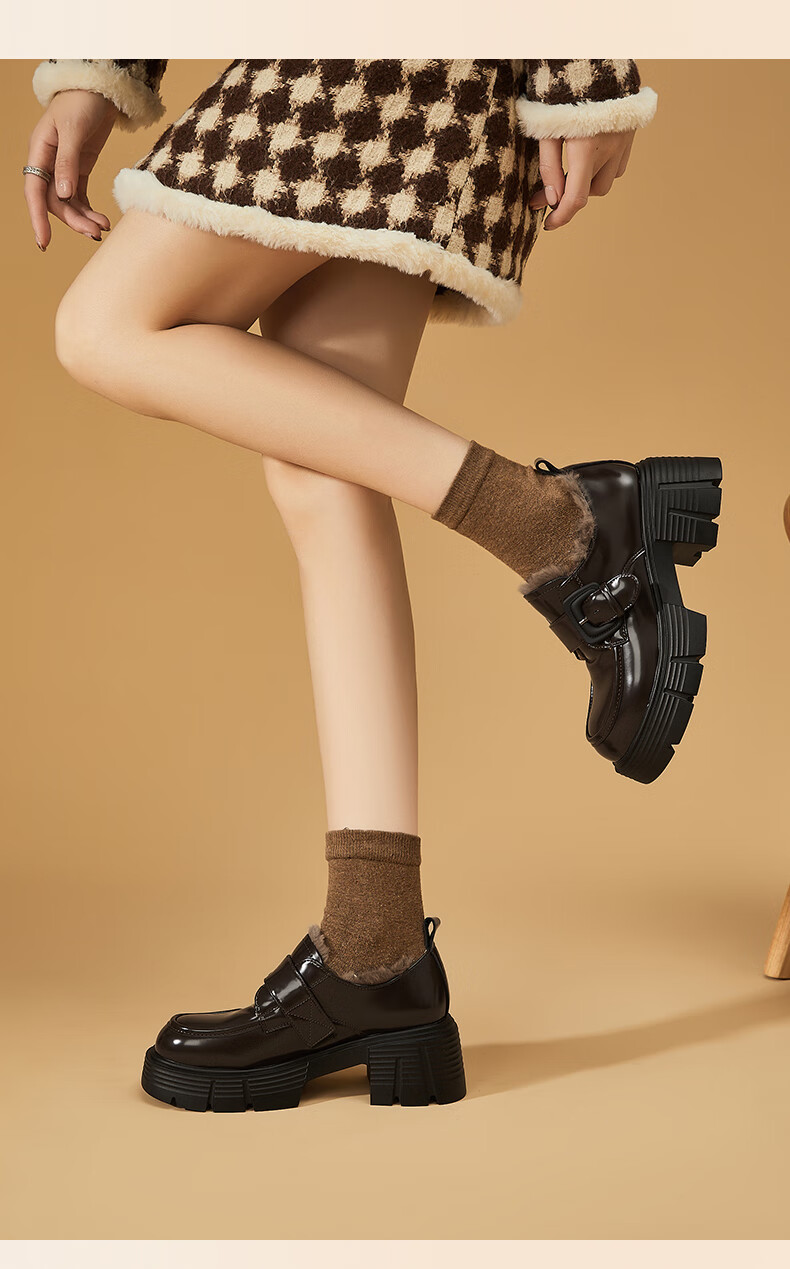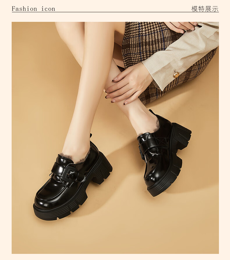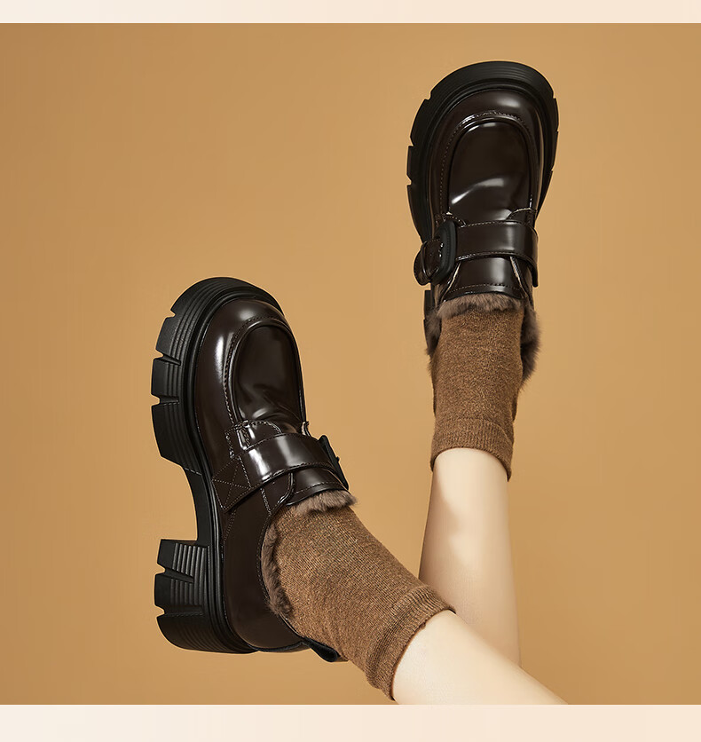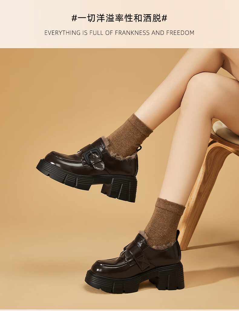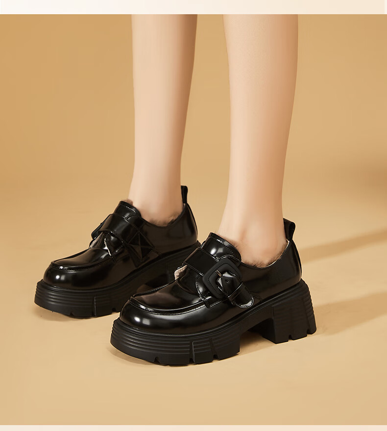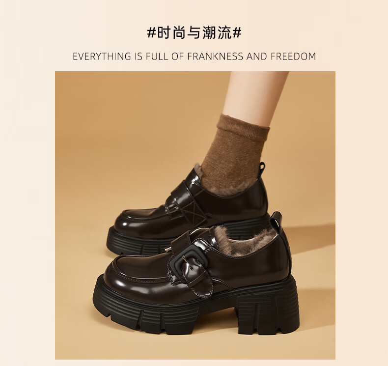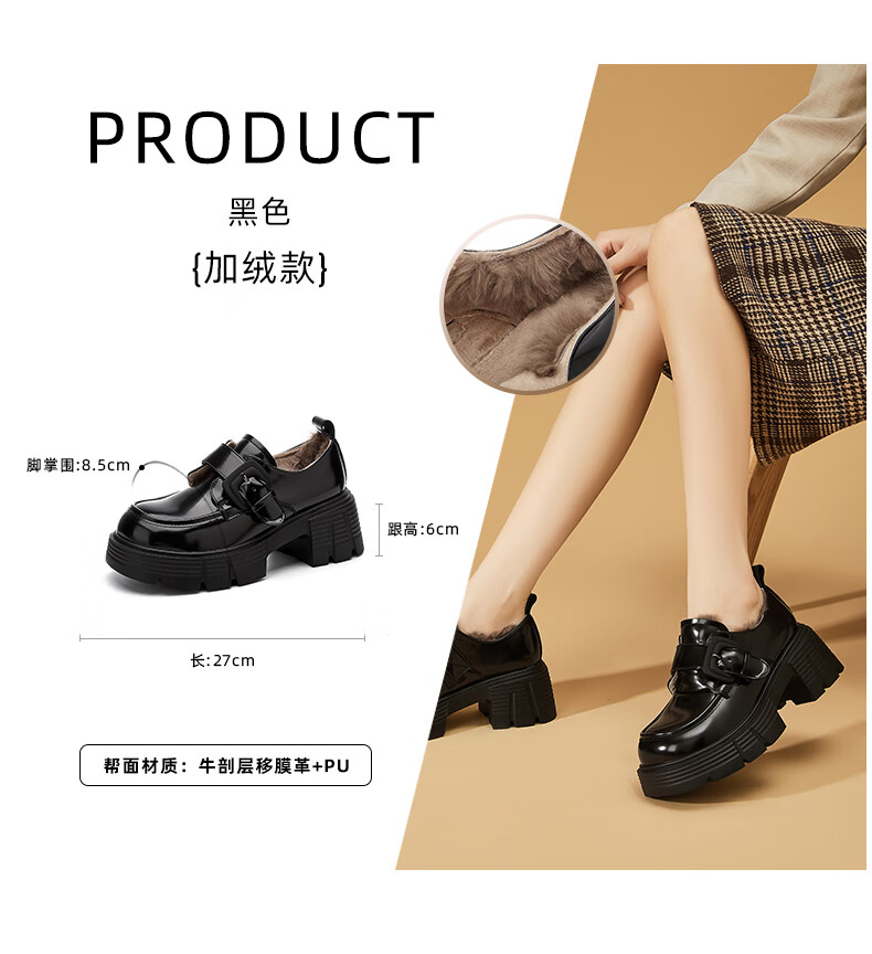 达芙妮加绒乐福鞋厚底百搭2025秋冬新款复古学院jk鞋子女增高黑色小皮鞋 黑色 加绒 38