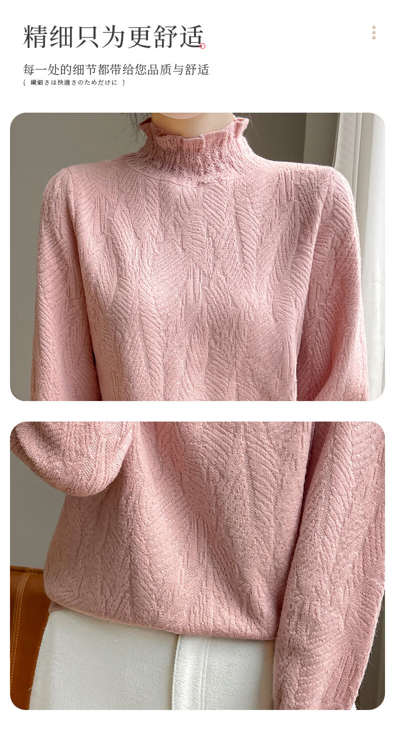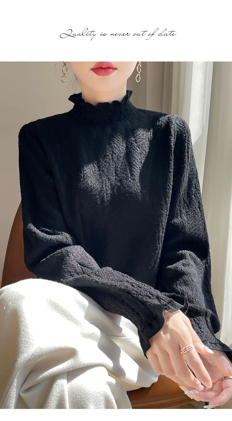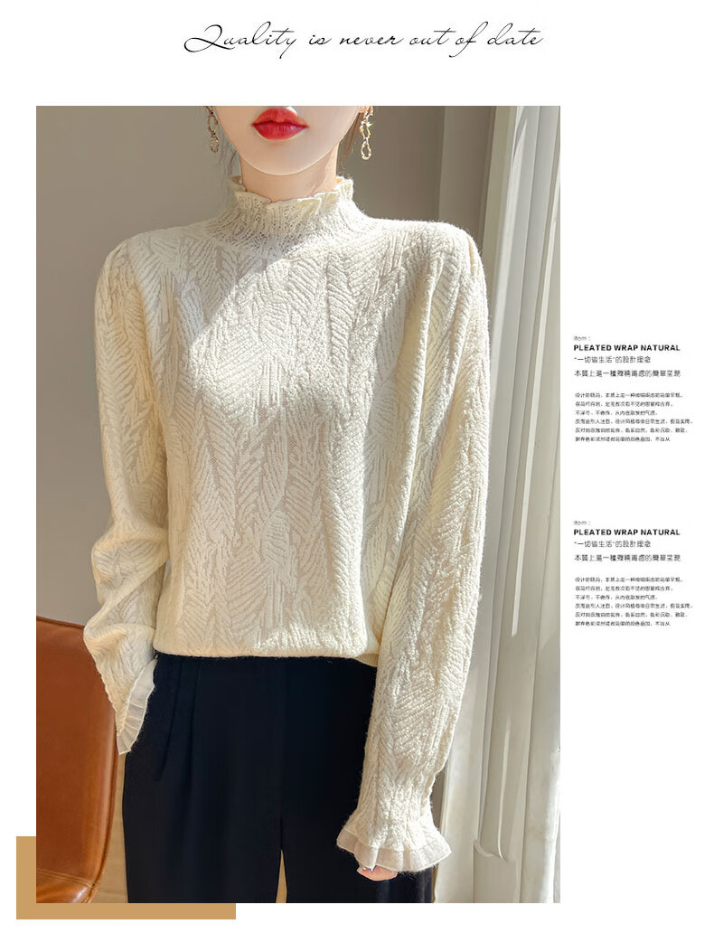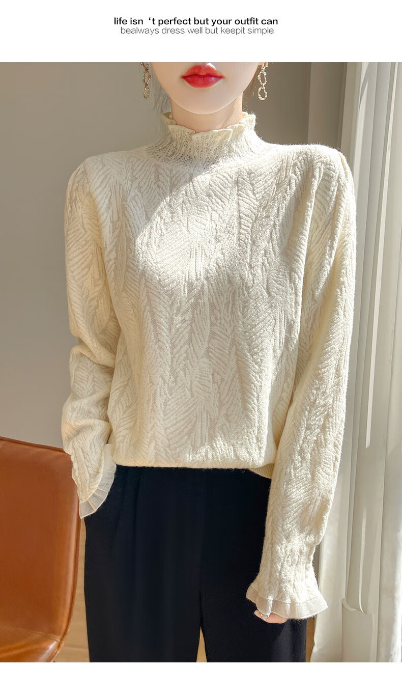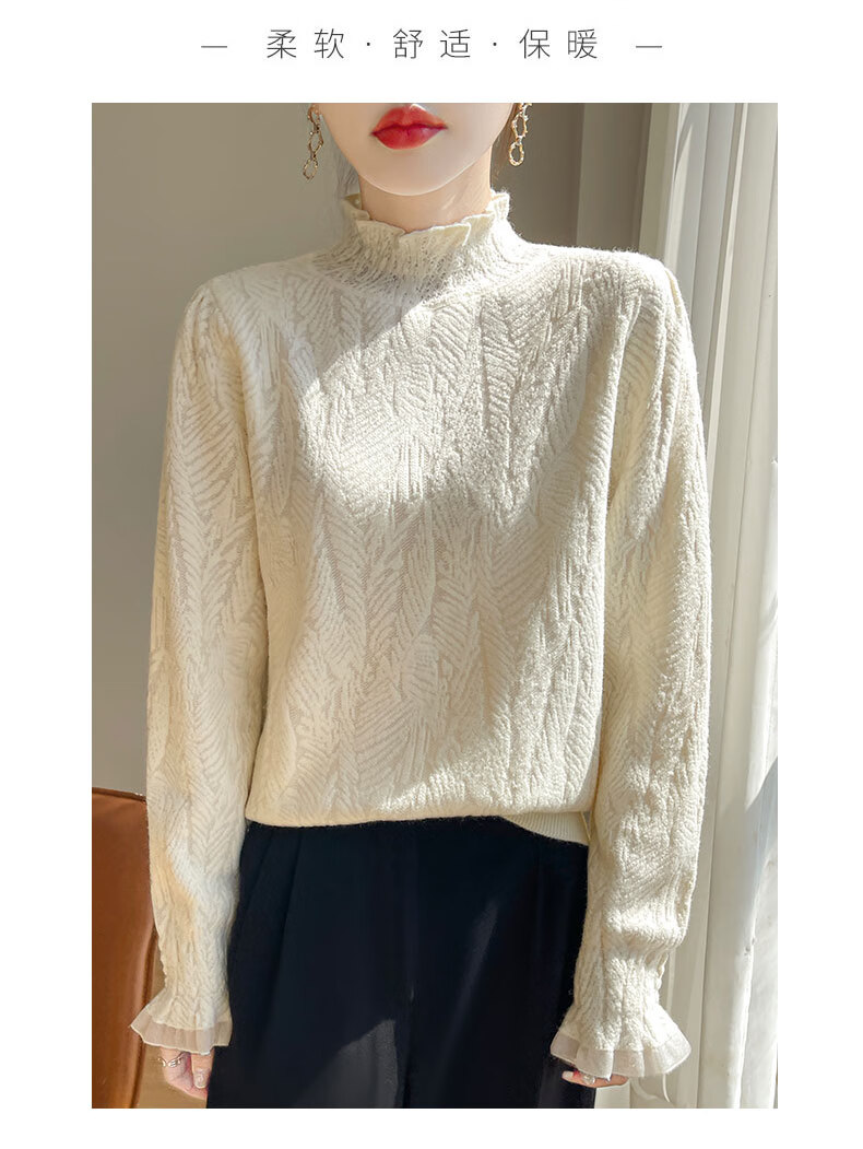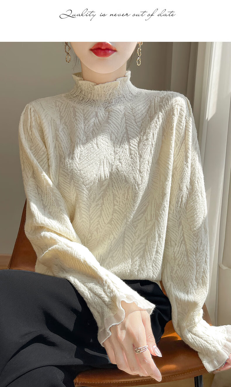 香影芬新款针织衫女木耳边蕾丝毛衣女秋冬洋气半高领内搭打底衫女上衣 米色 2XL (建议125-135斤)