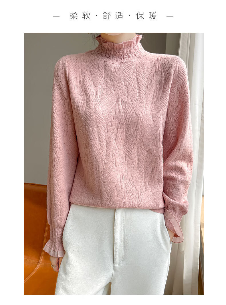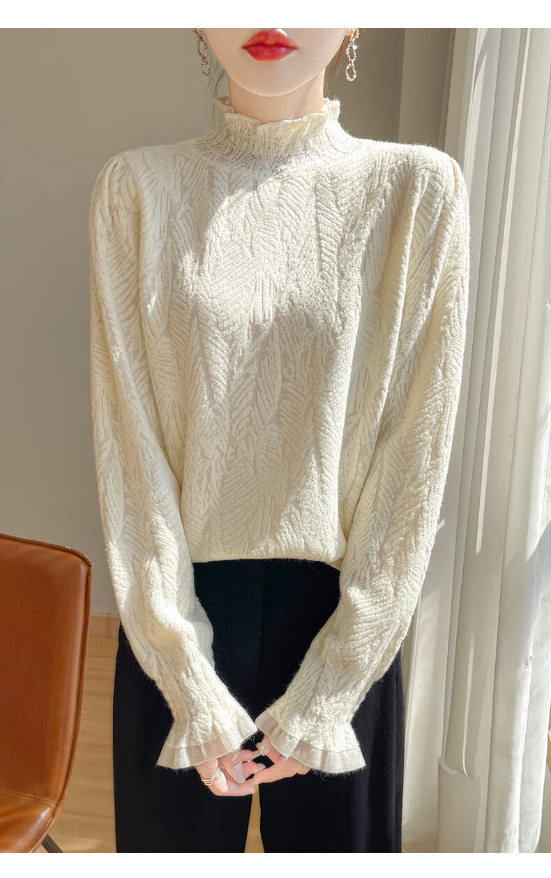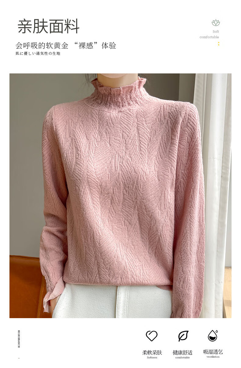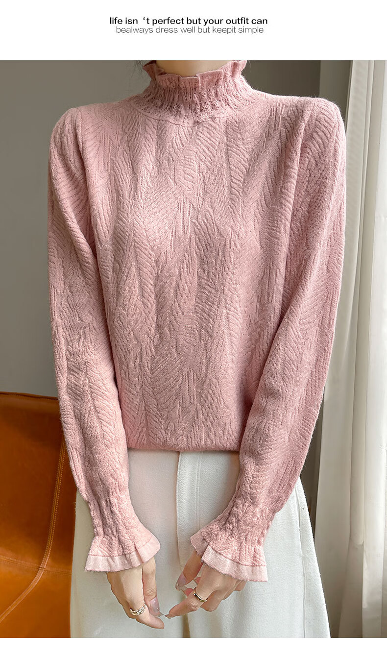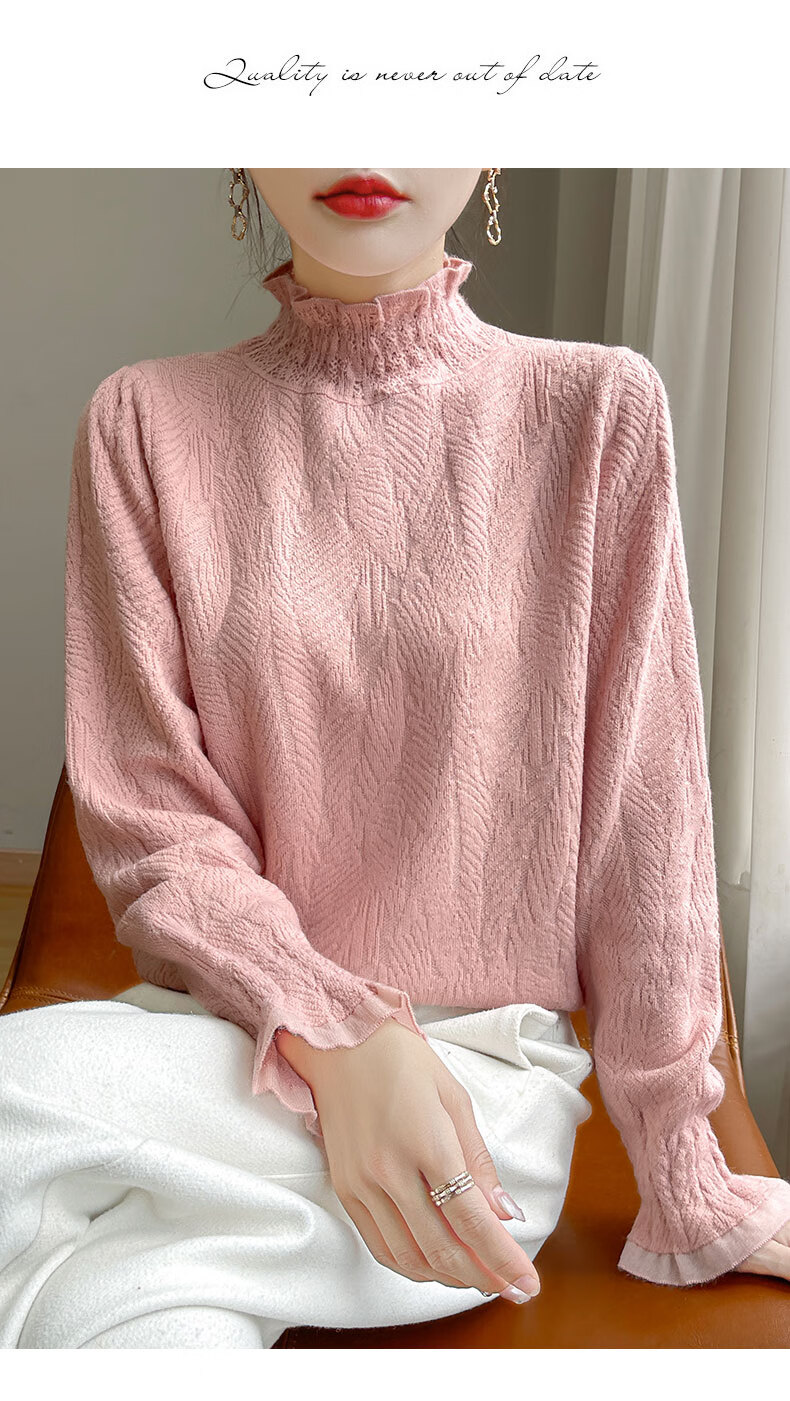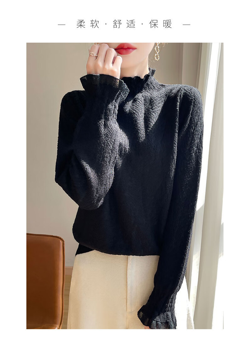 香影芬新款针织衫女木耳边蕾丝毛衣女秋冬洋气半高领内搭打底衫女上衣 米色 2XL (建议125-135斤)