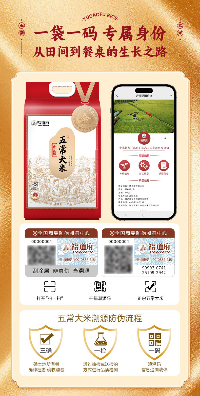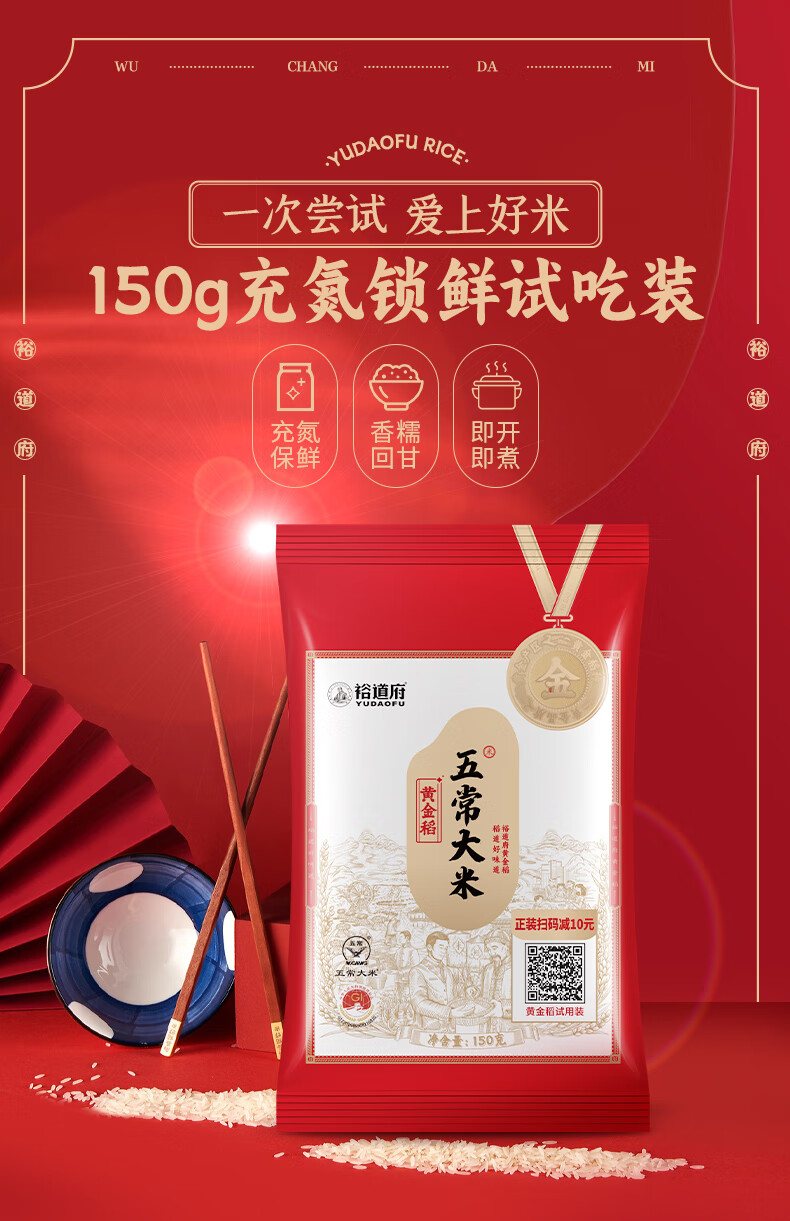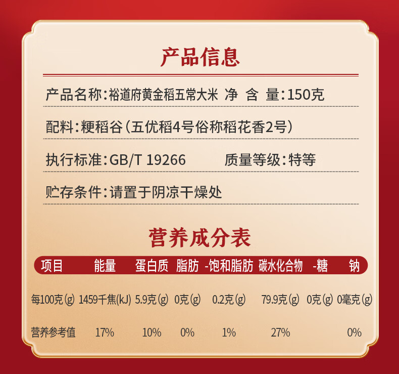 裕道府新国标 特等五常大米 黄金稻 150g 袋装 稻花香2号 区块溯源