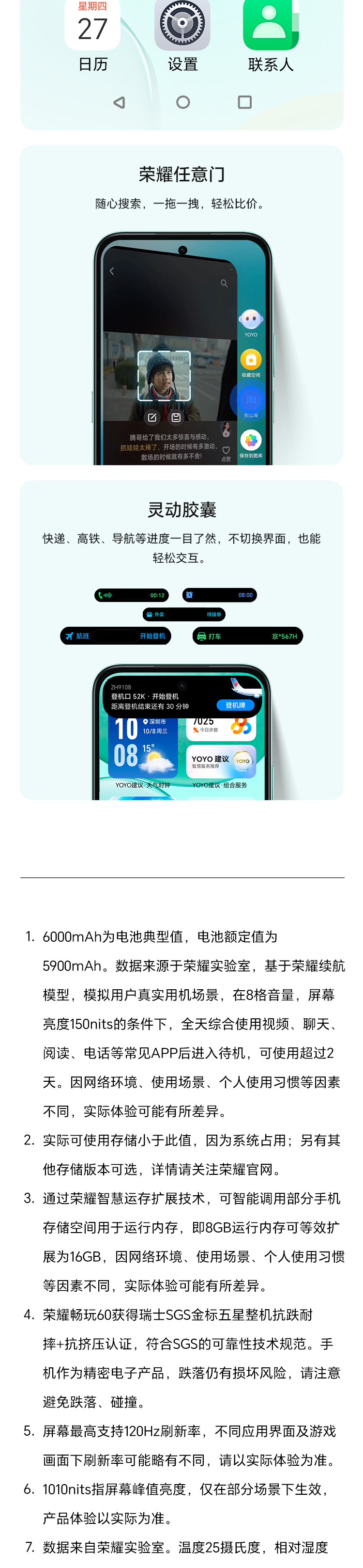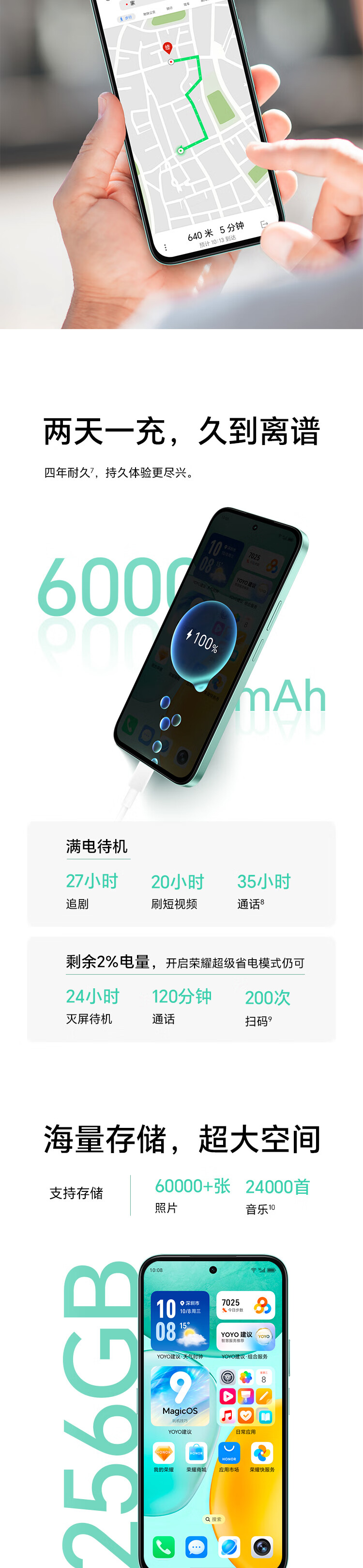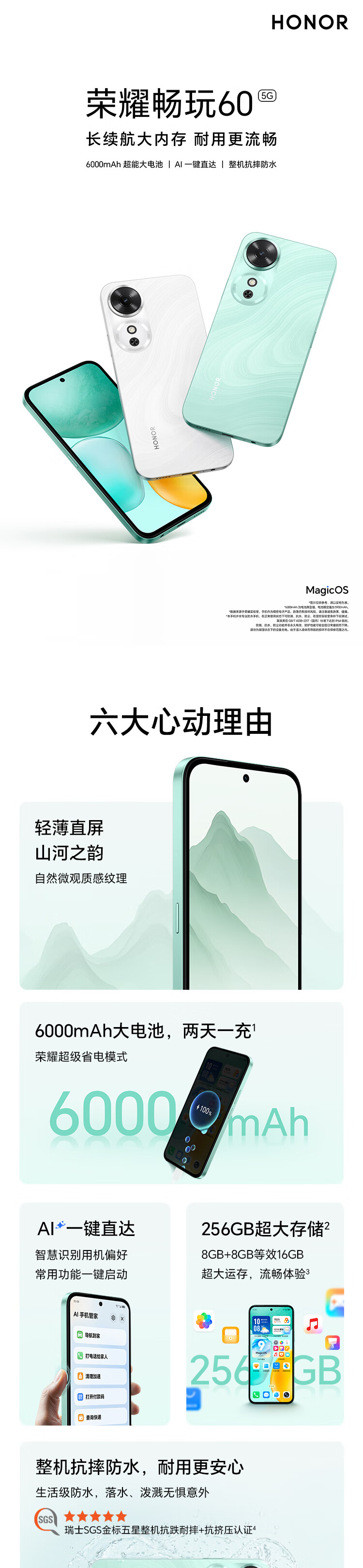 荣耀(HONOR)畅玩60 6000mAh超能大电池 AI一键直达 整机抗摔防水 8GB+256GB 墨岩黑 老人手机