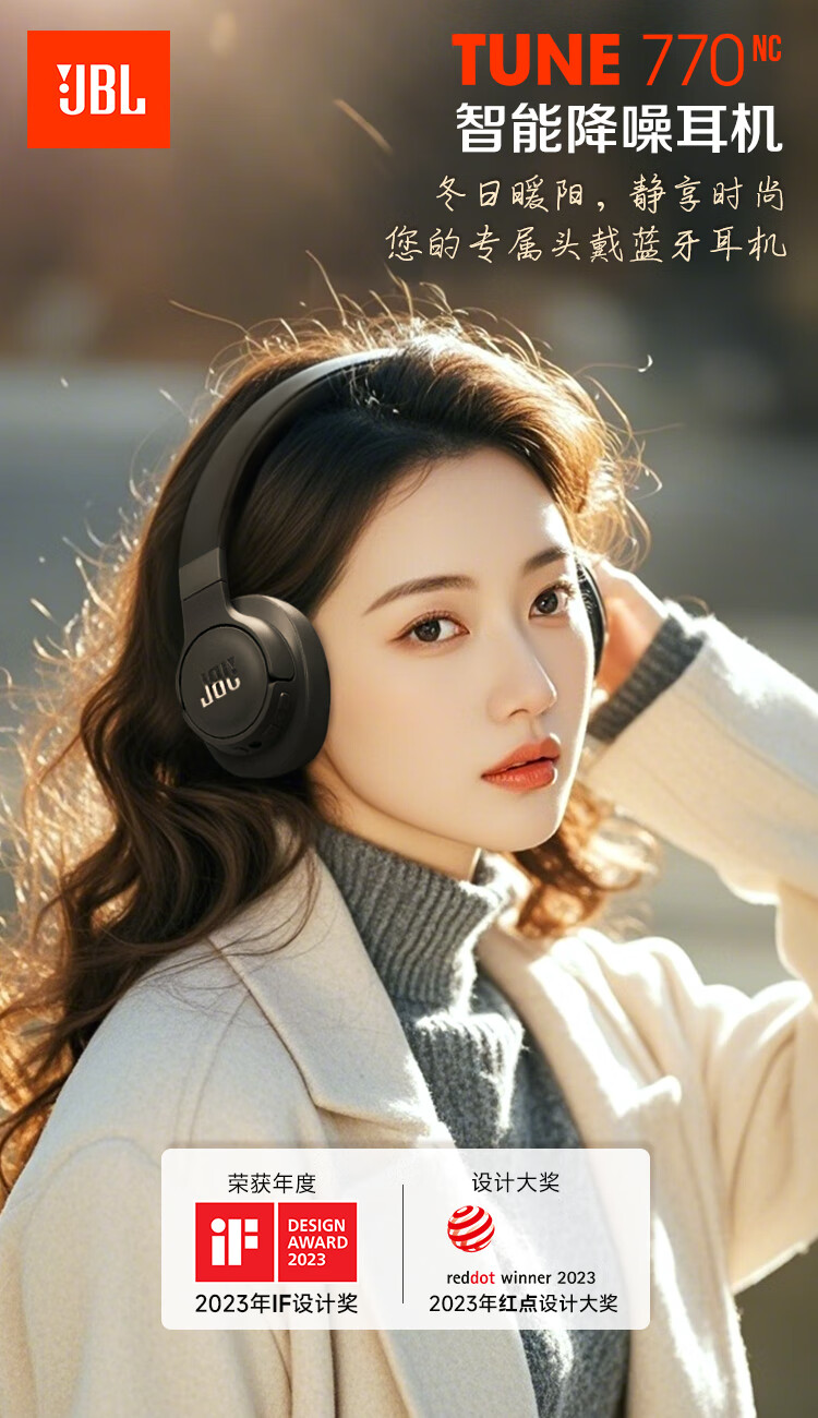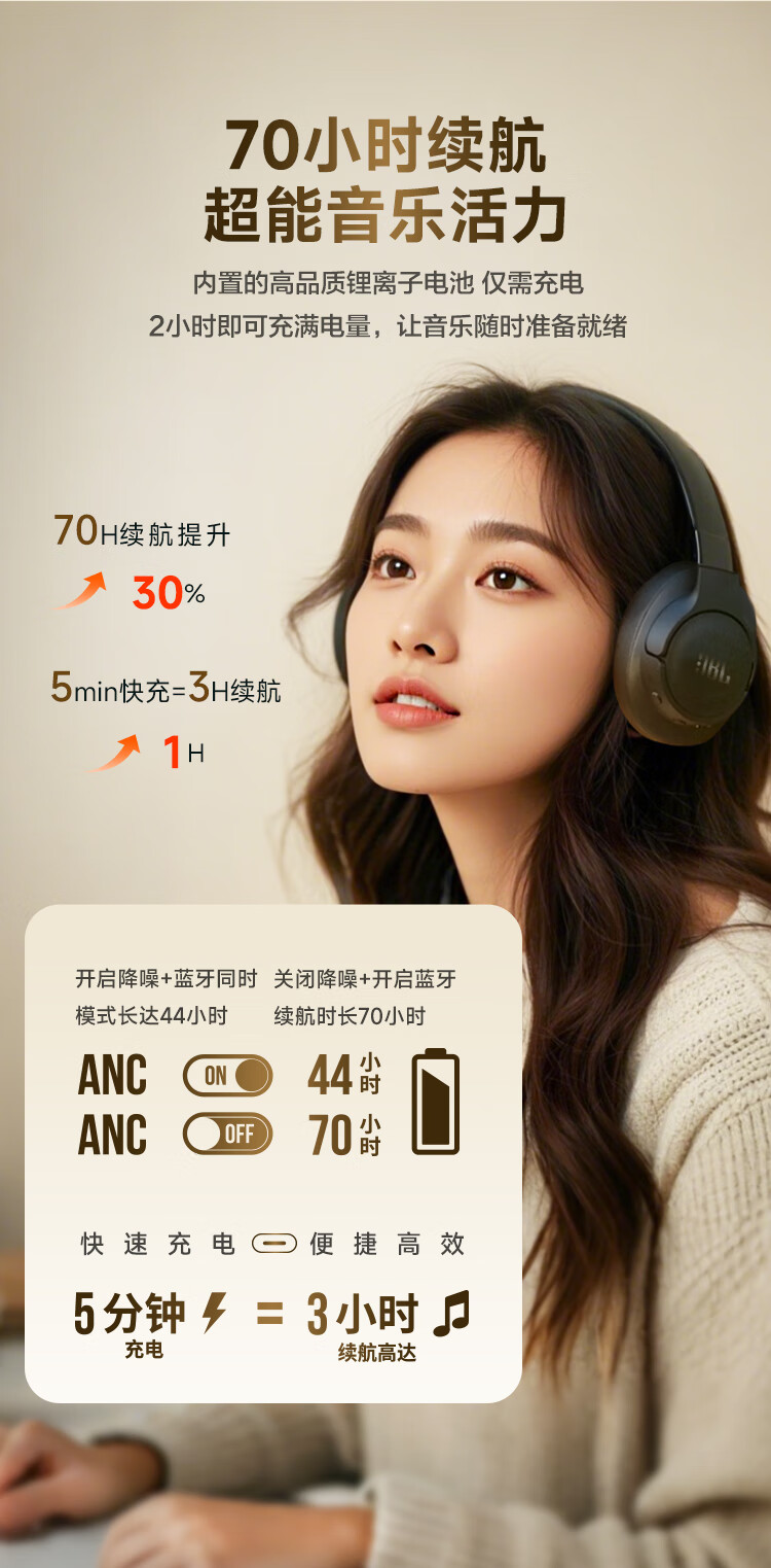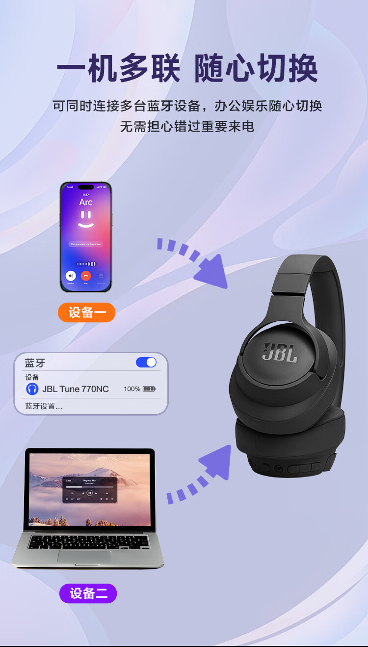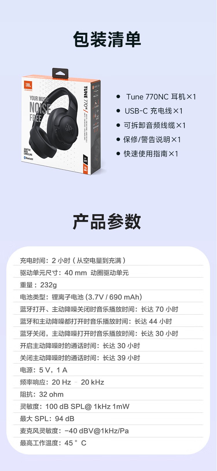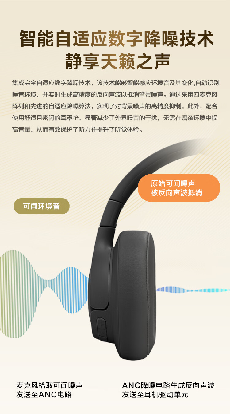 JBLT770NC头戴式主动降噪蓝牙耳机 手机电脑笔记本耳机游戏无线有线耳机 黑色