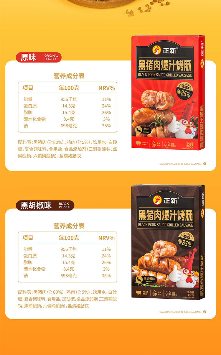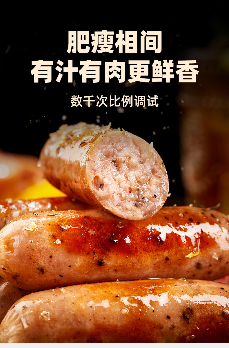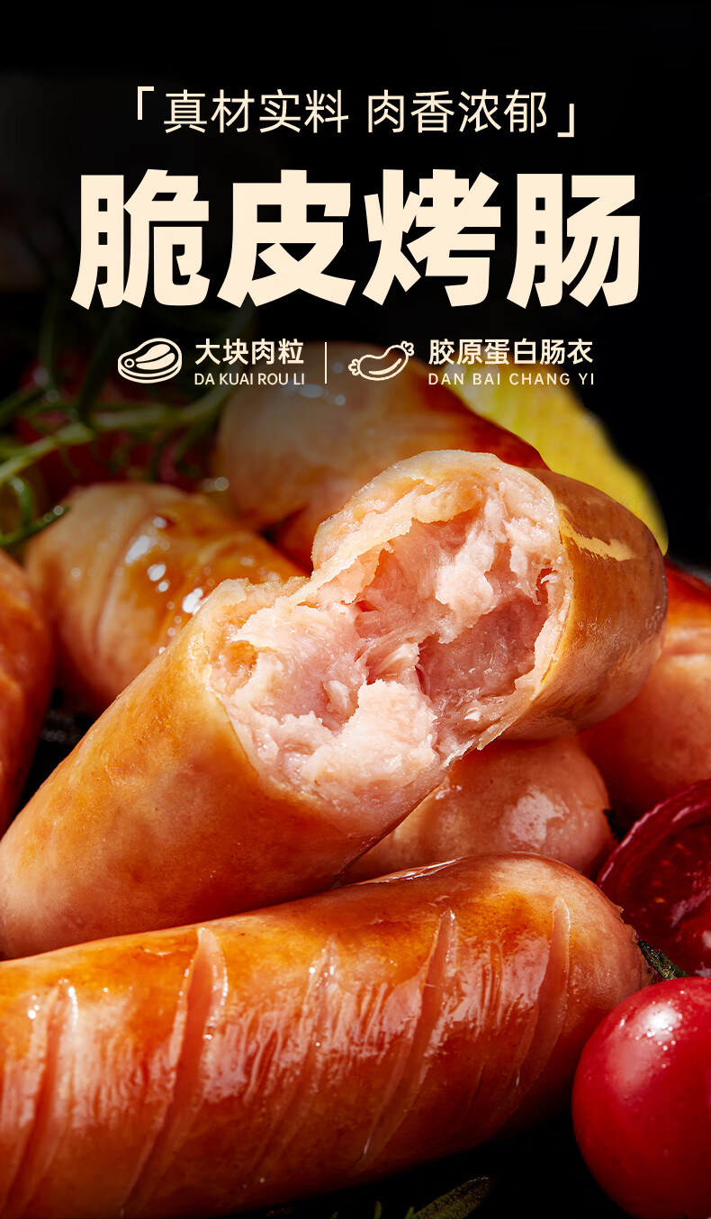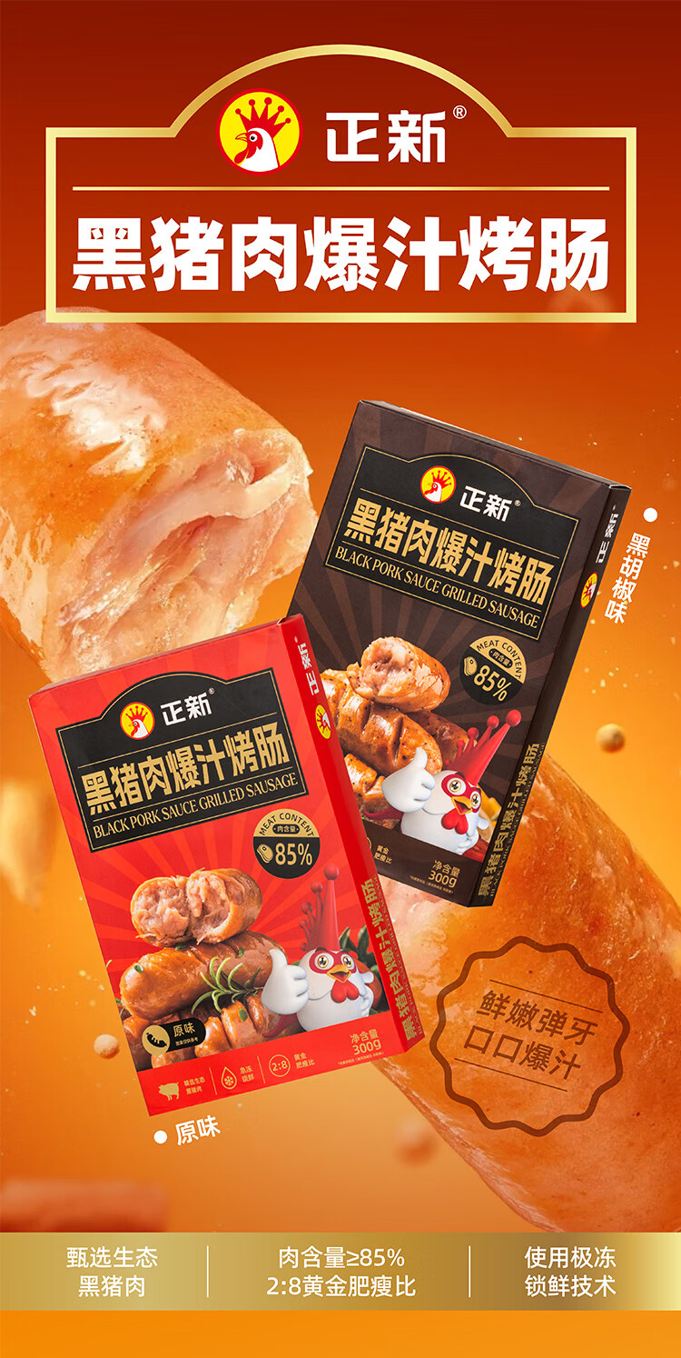 正新黑猪肉爆汁烤肠火山石烤肠香肠热狗肠空气炸锅小吃空气炸锅食材 脆皮烤肠原味2斤+黑椒2斤(40根)
