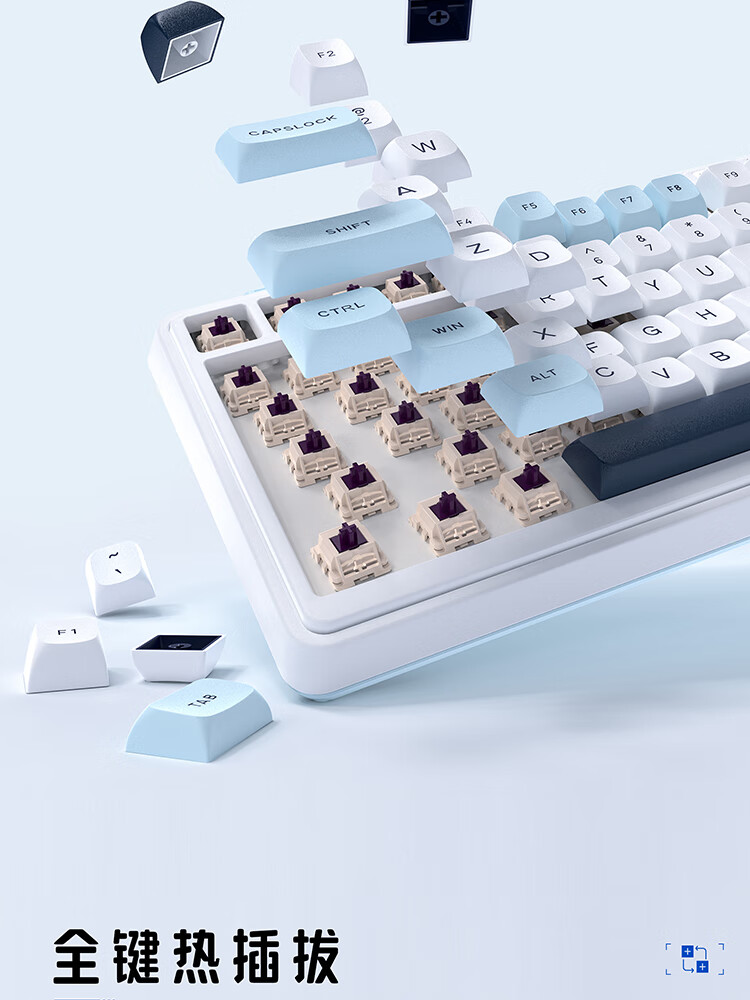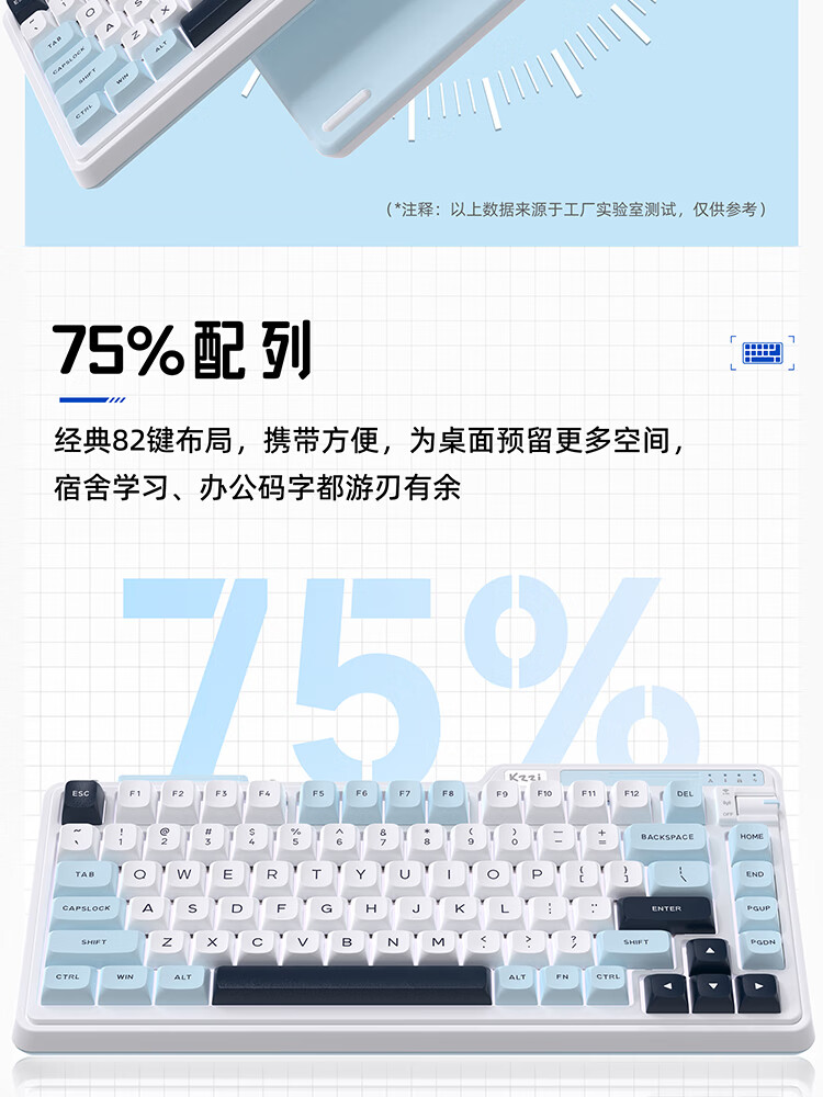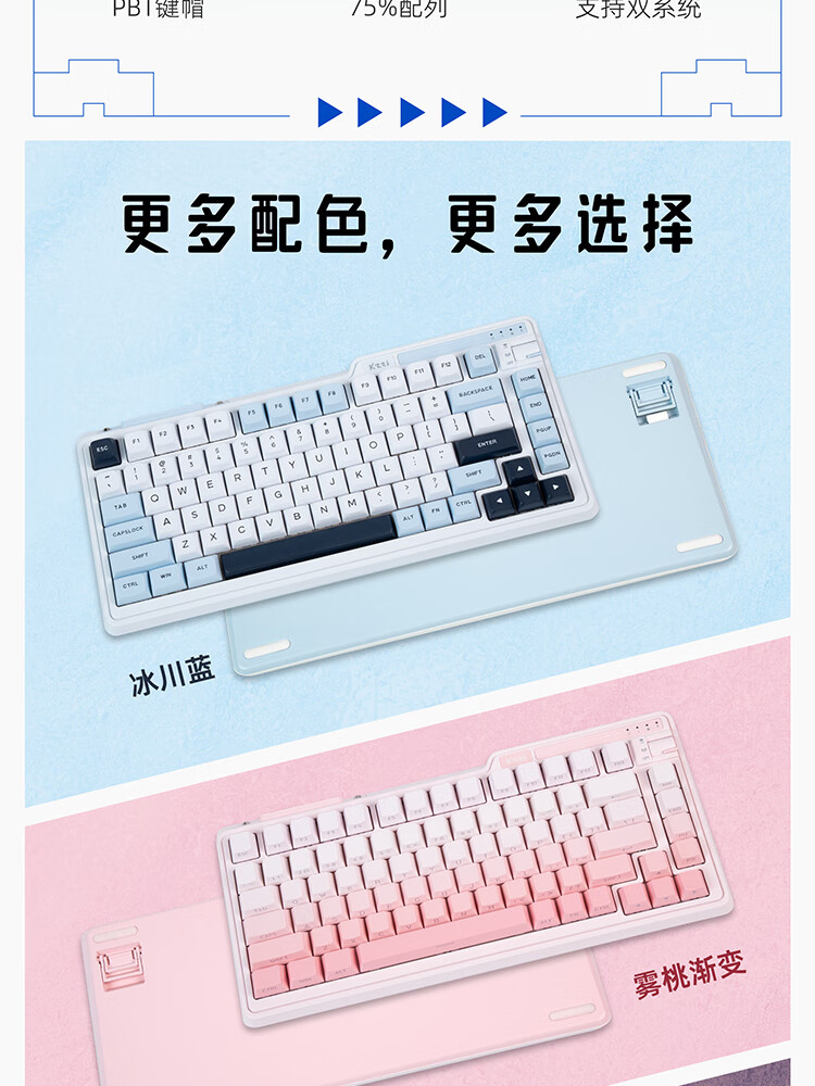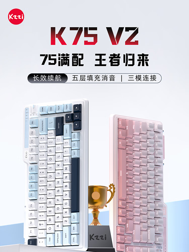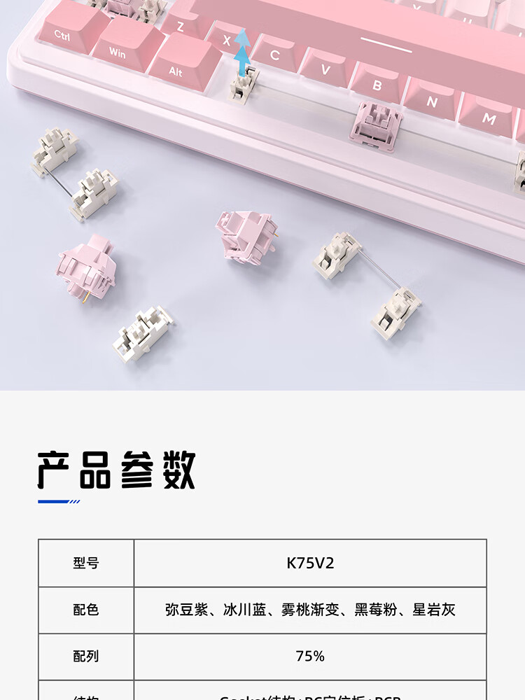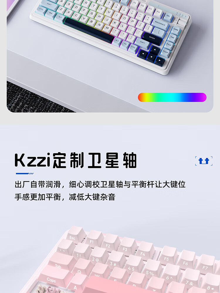 珂芝(KZZI)K75V2三模客制化机械键盘无线蓝牙电竞游戏静音轴体办公82键RGB背光PBT键帽Gasket冰川蓝樱粉轴V3