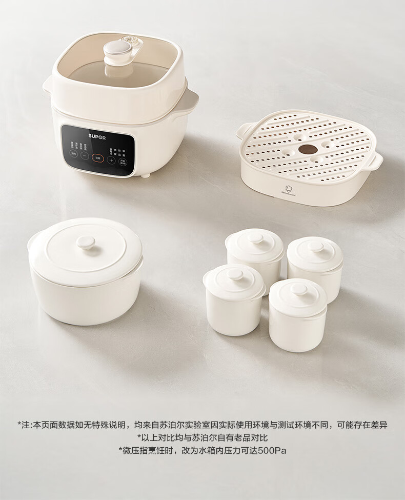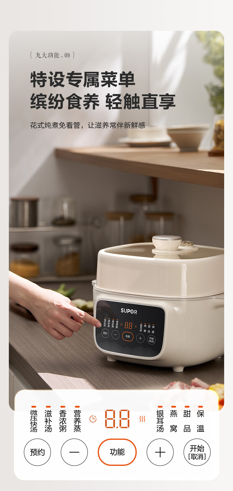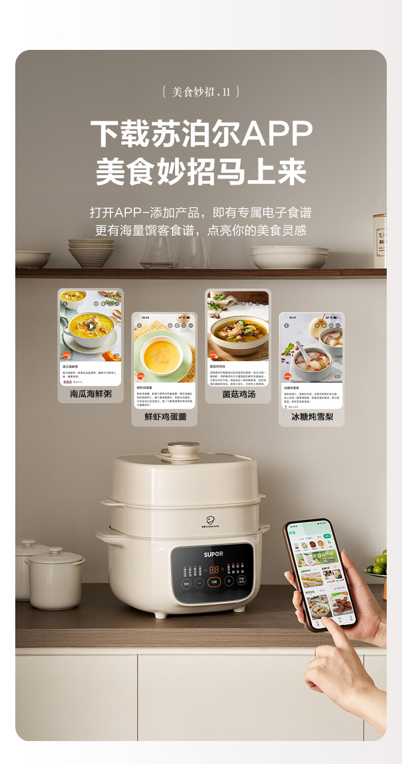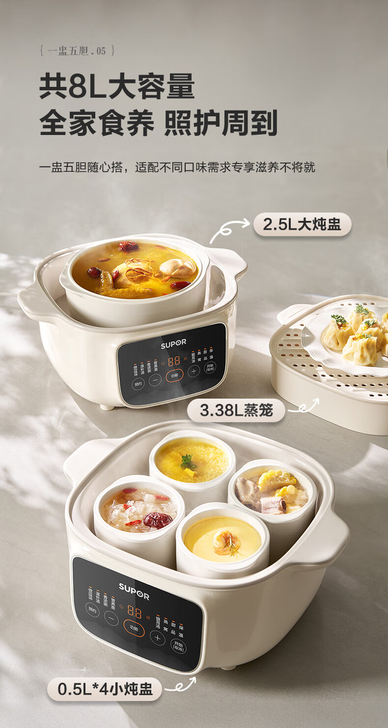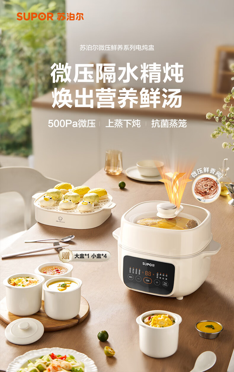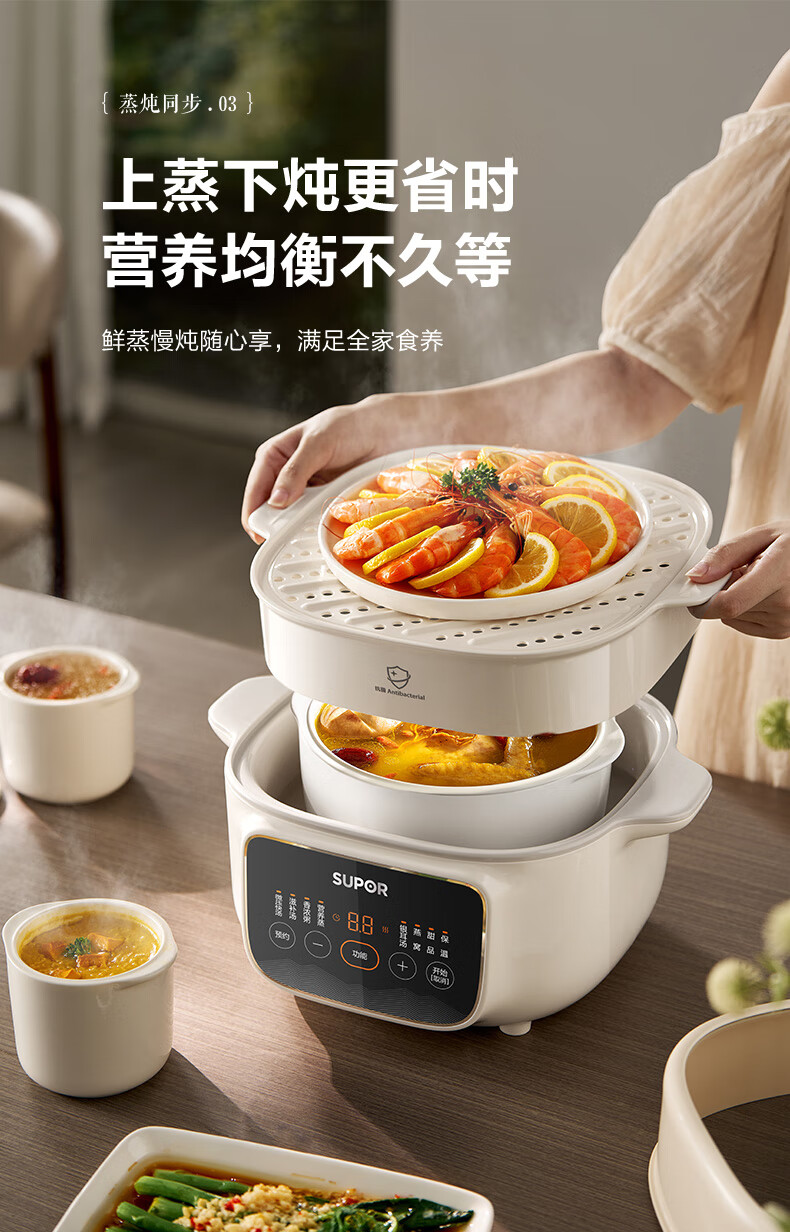 苏泊尔电炖锅电炖盅煲汤锅炖汤锅隔水炖锅2-3人多功能锅智能白瓷燕窝炖盅煮粥锅蒸锅宝宝婴儿辅食锅陶瓷 白瓷 4.5L 微压快炖【一锅5胆】上蒸下炖