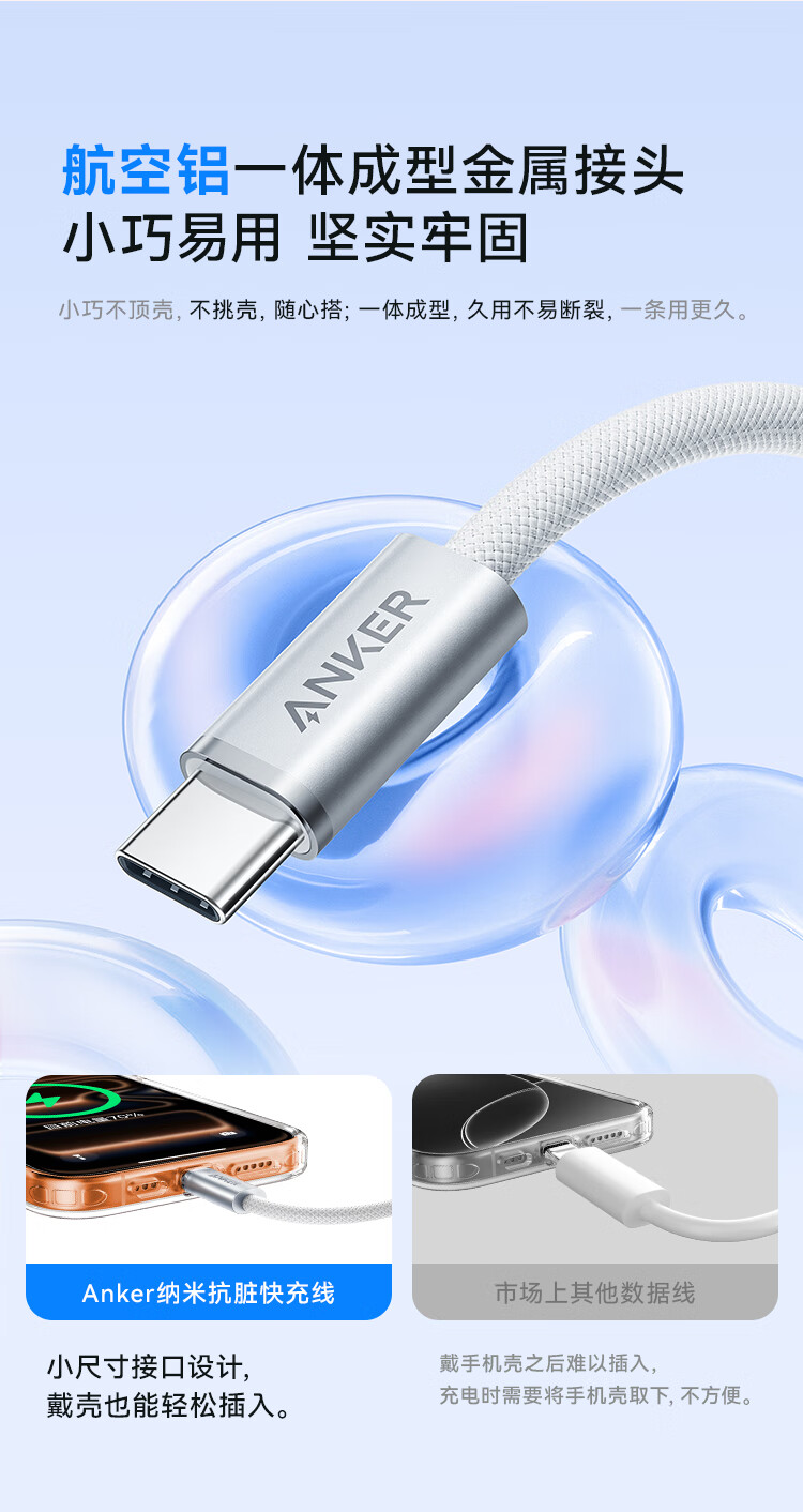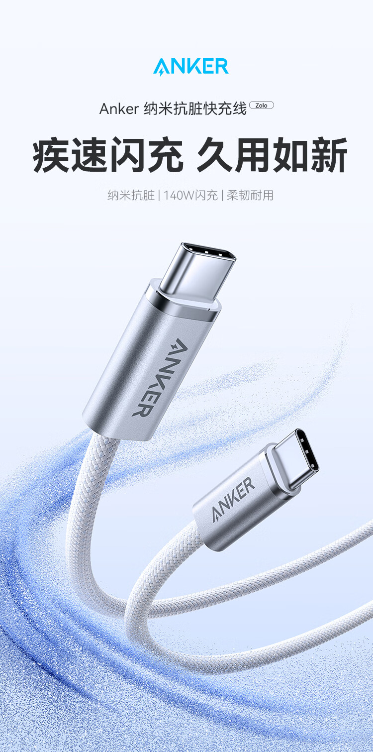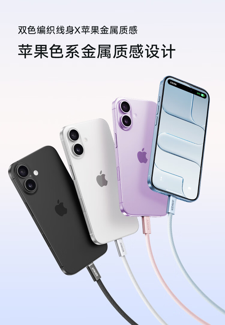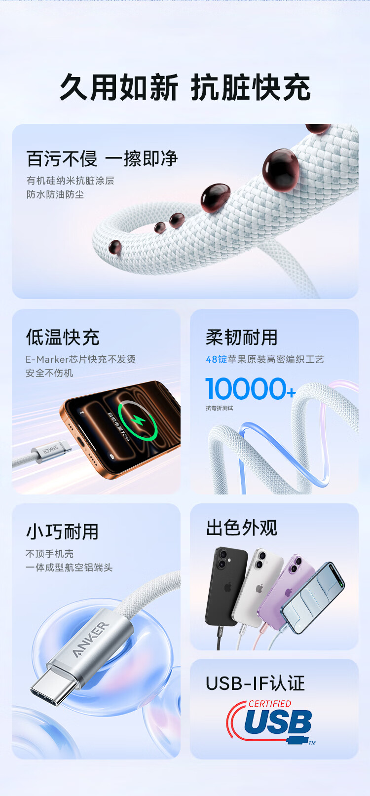 ANKER安克抗脏线【苹果17/iPhone16适用】140W双type-c充电器PD快充USB-IF认证数据线华为vivo平板电脑 【苹果17-15全系】莱茵抗脏认证|防污编织|白色 1.8米